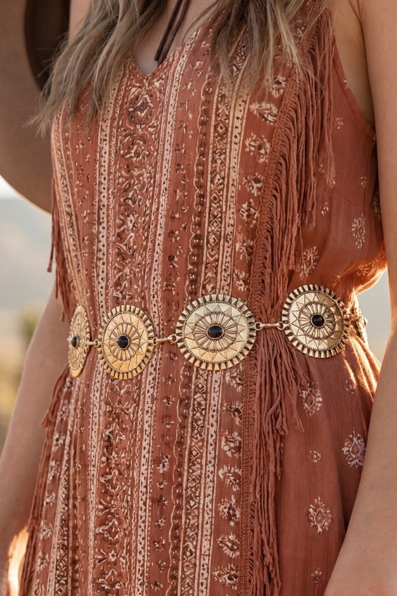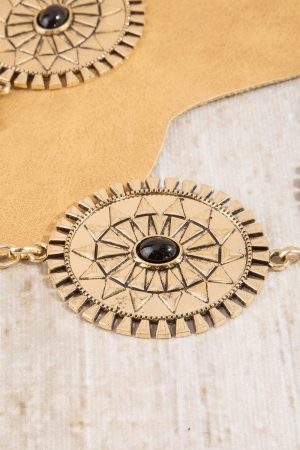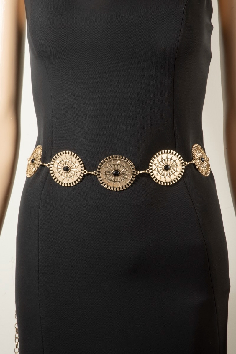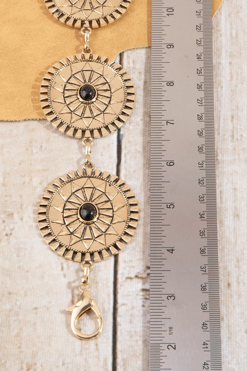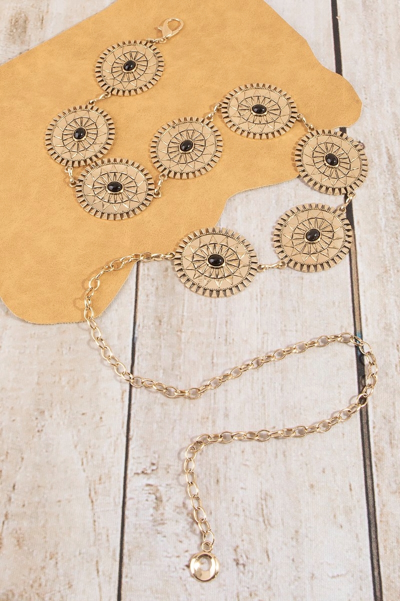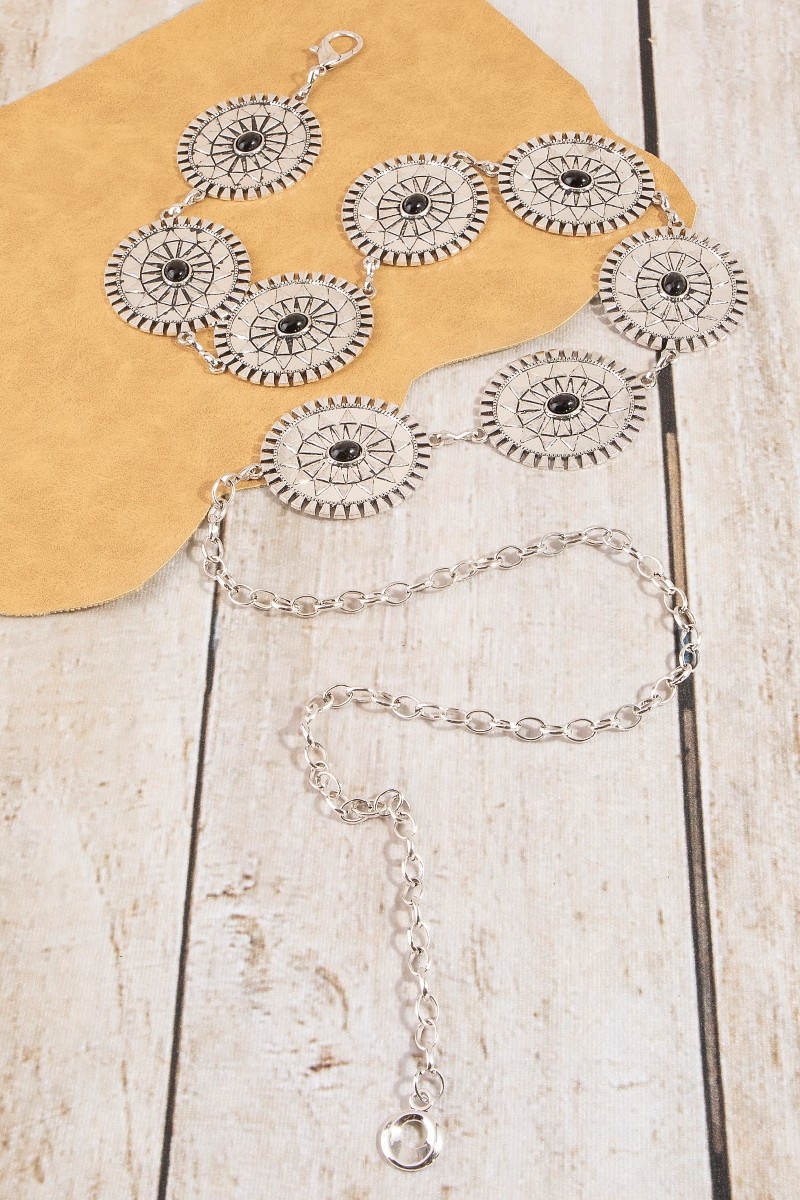 • This chain belt introduces a unique stone sunburst concho style. Revel in the intricate design that effortlessly distinguishes this chain belt, making it a statement piece.