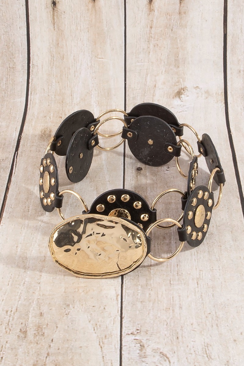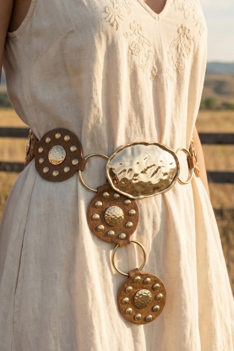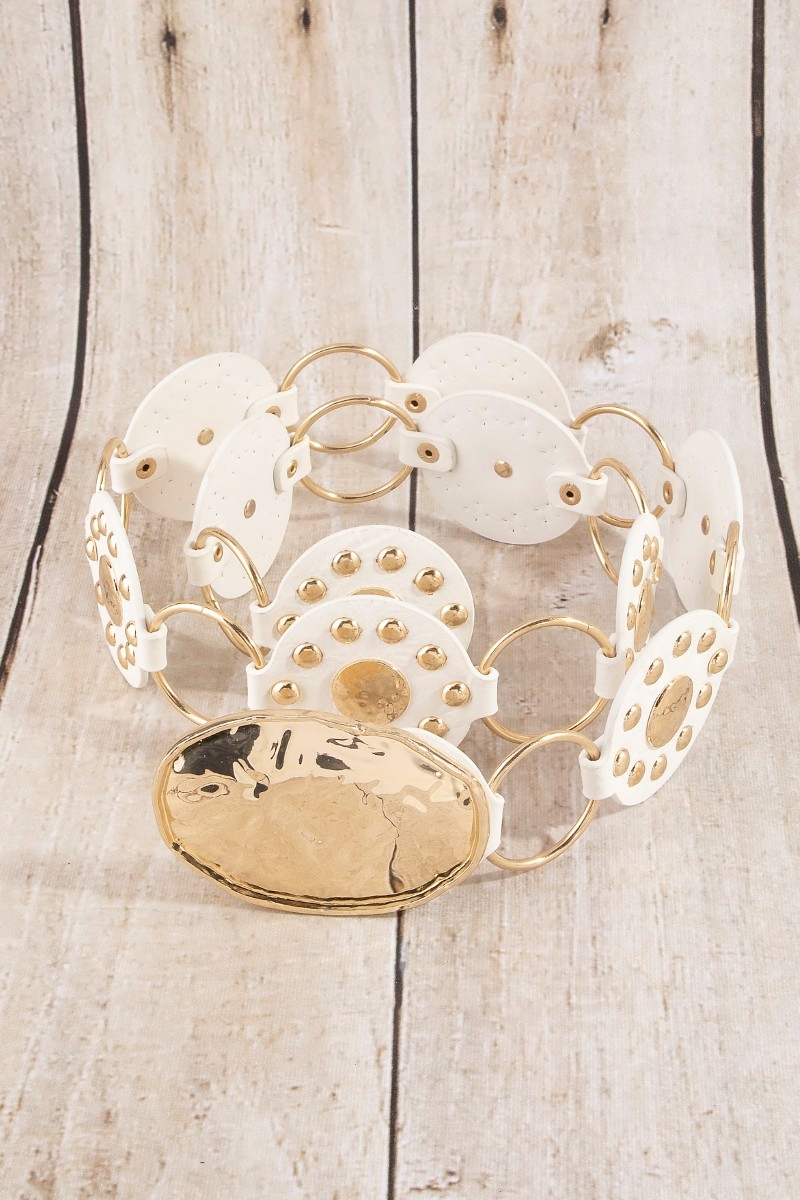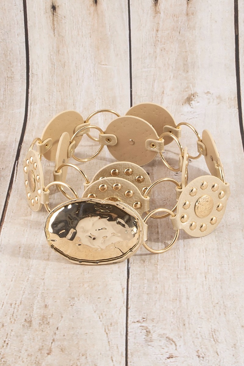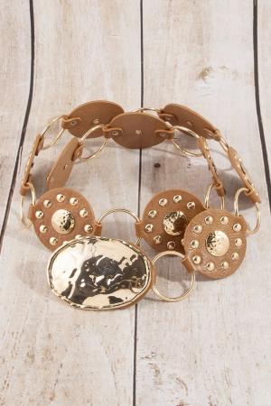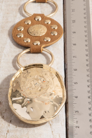 • This chain belt brings a luxurious gold studded circle ring style. Experience a subtle blend of modernity and classic charm as this chain belt effortlessly adorns your ensemble.