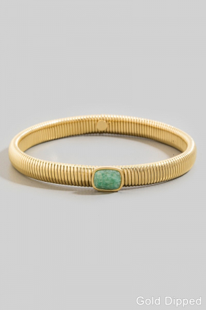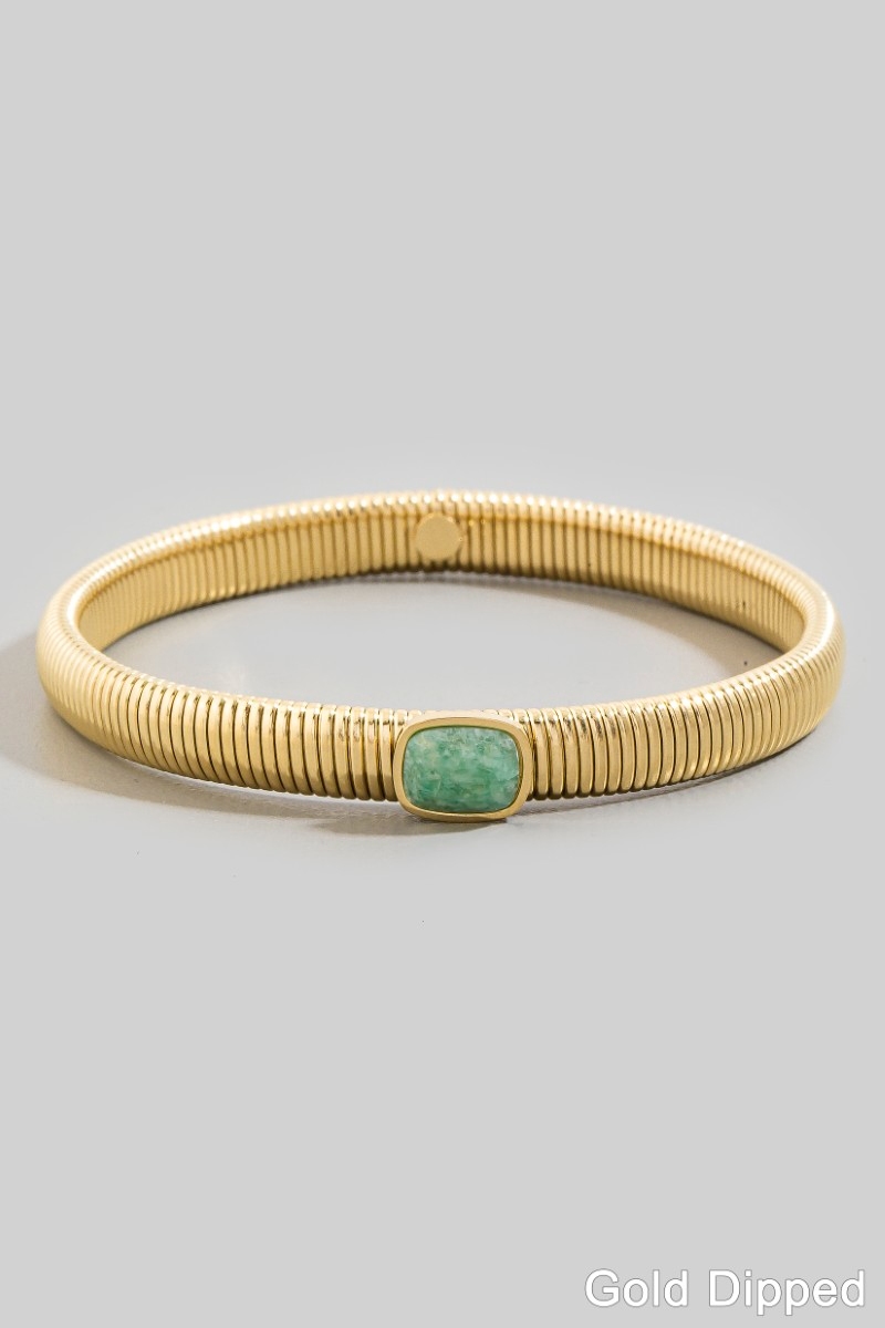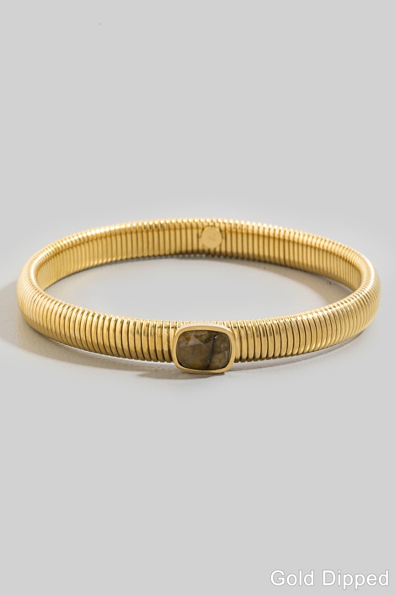 • This bangle bracelet features a fashionable stainless steel ribbed stone style. Revel in the intricate design that effortlessly distinguishes this bangle bracelet, making it a statement piece.