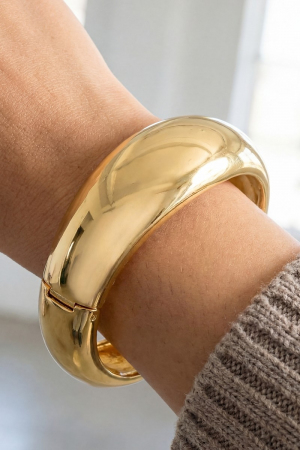 • This bangle bracelet features a fashionable rounded hinge style. Witness the transformative power of accessories as this piece effortlessly redefines your fashion narrative.