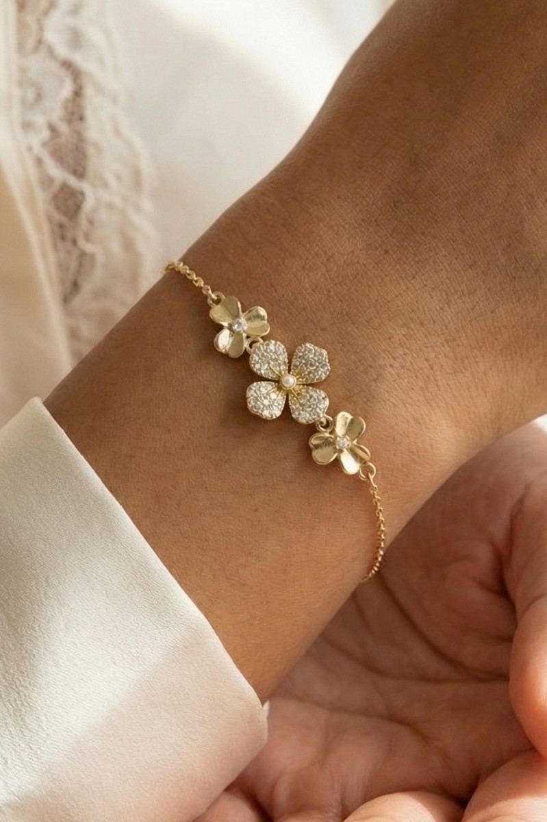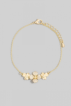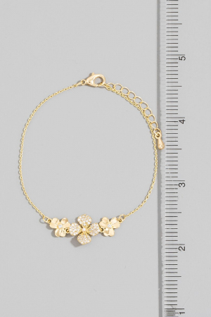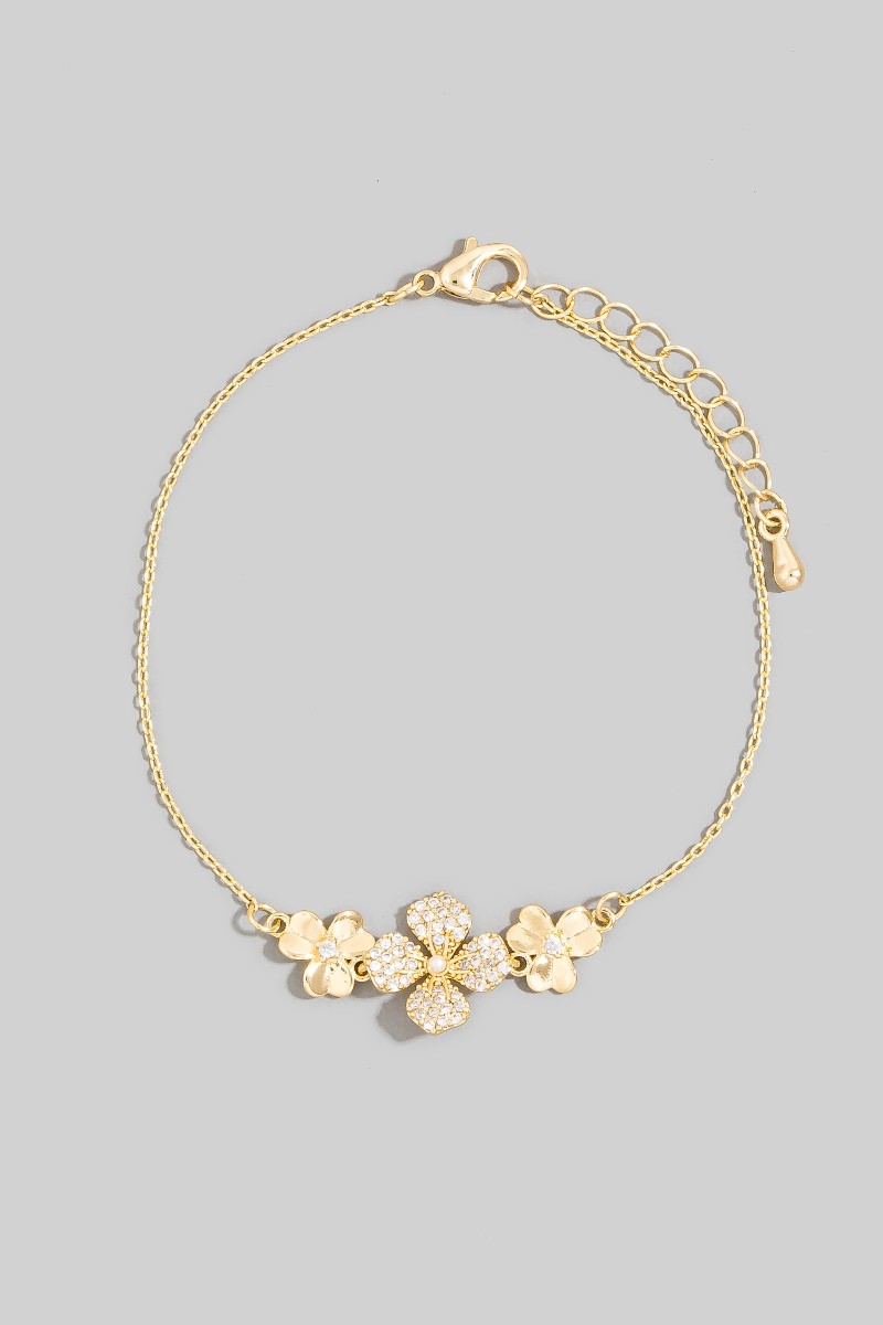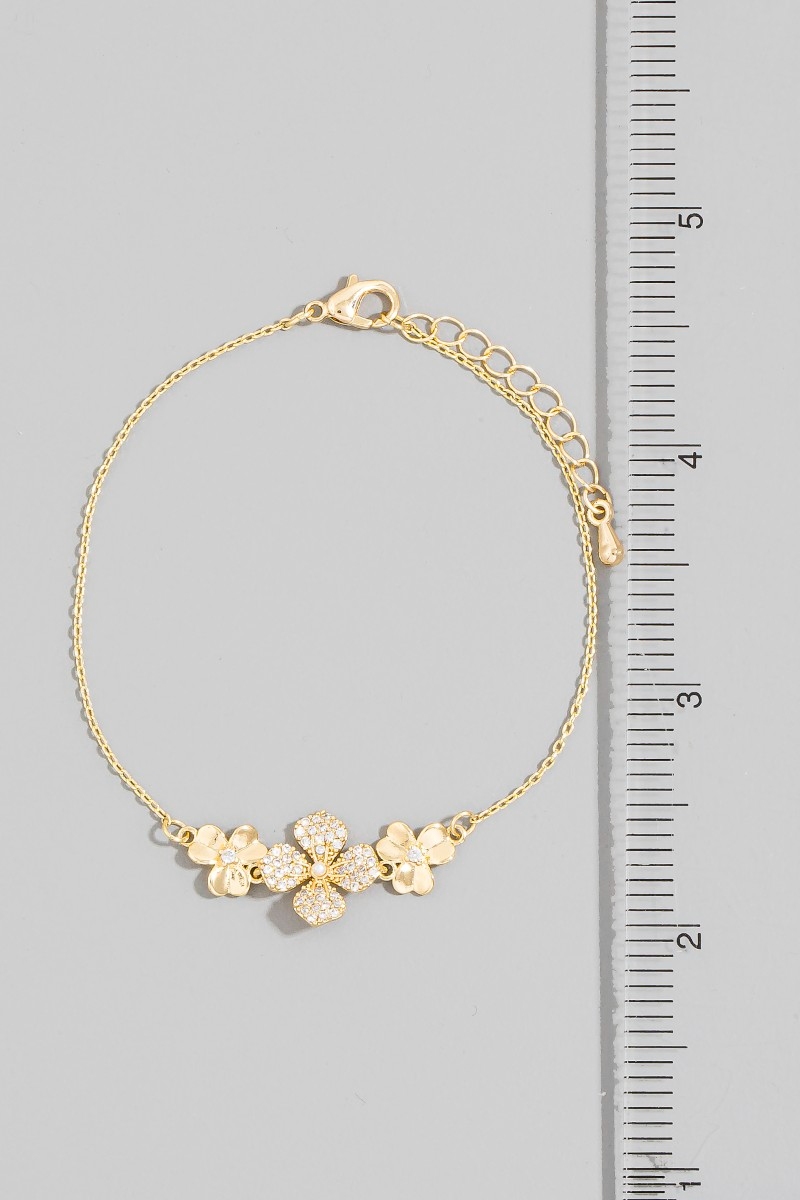 - This bracelet brings a luxurious triple flower cubic zirconia pave style. Embark on a journey of sartorial refinement as this bracelet effortlessly complements your fashion sense.