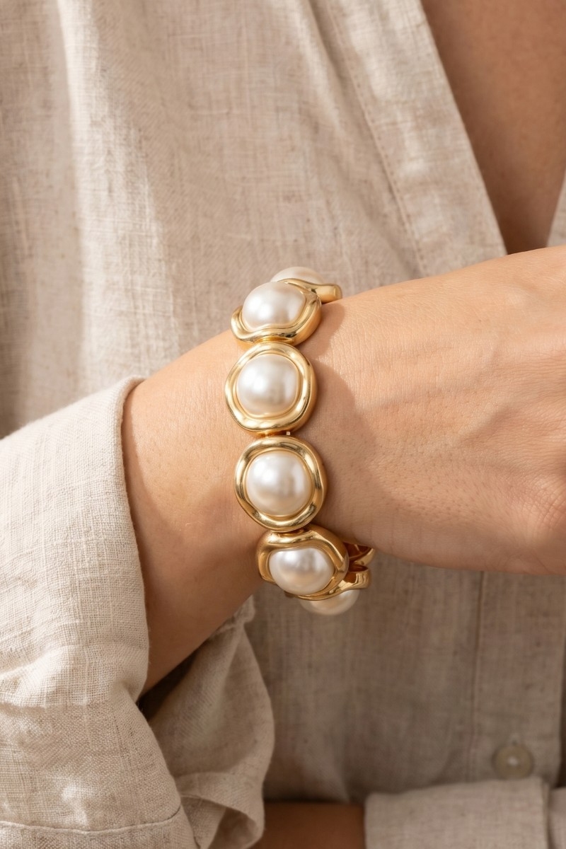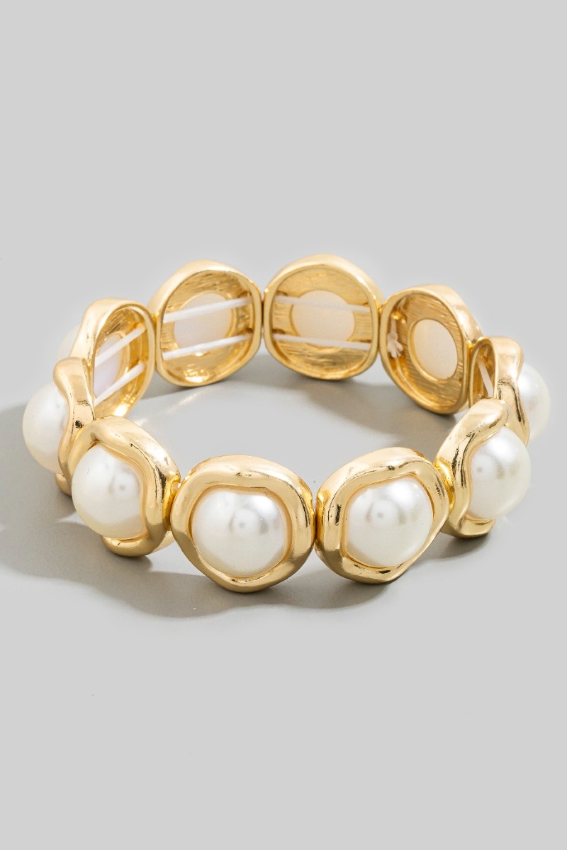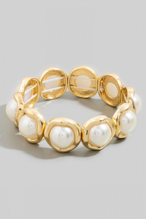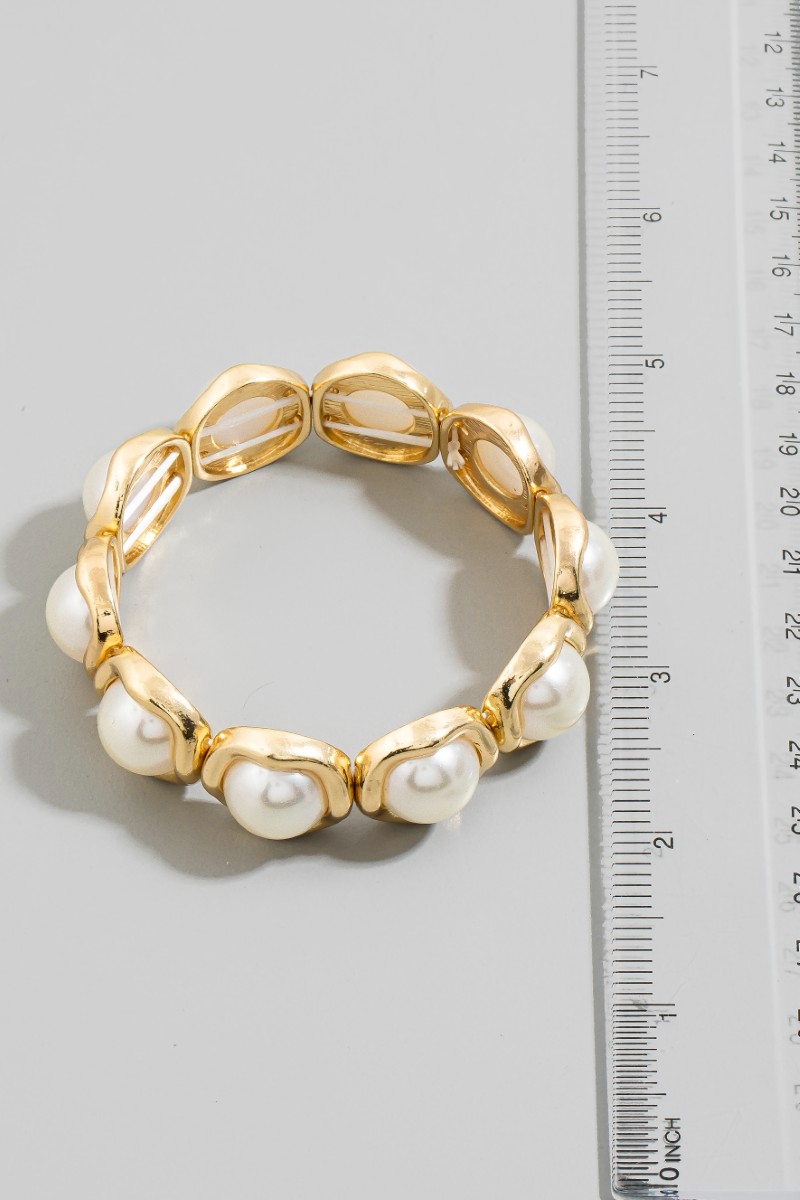 - This stretch bracelet showcases a unique gold round pearl cabochon style. Embark on a journey of sartorial refinement as this stretch bracelet effortlessly complements your fashion sense.