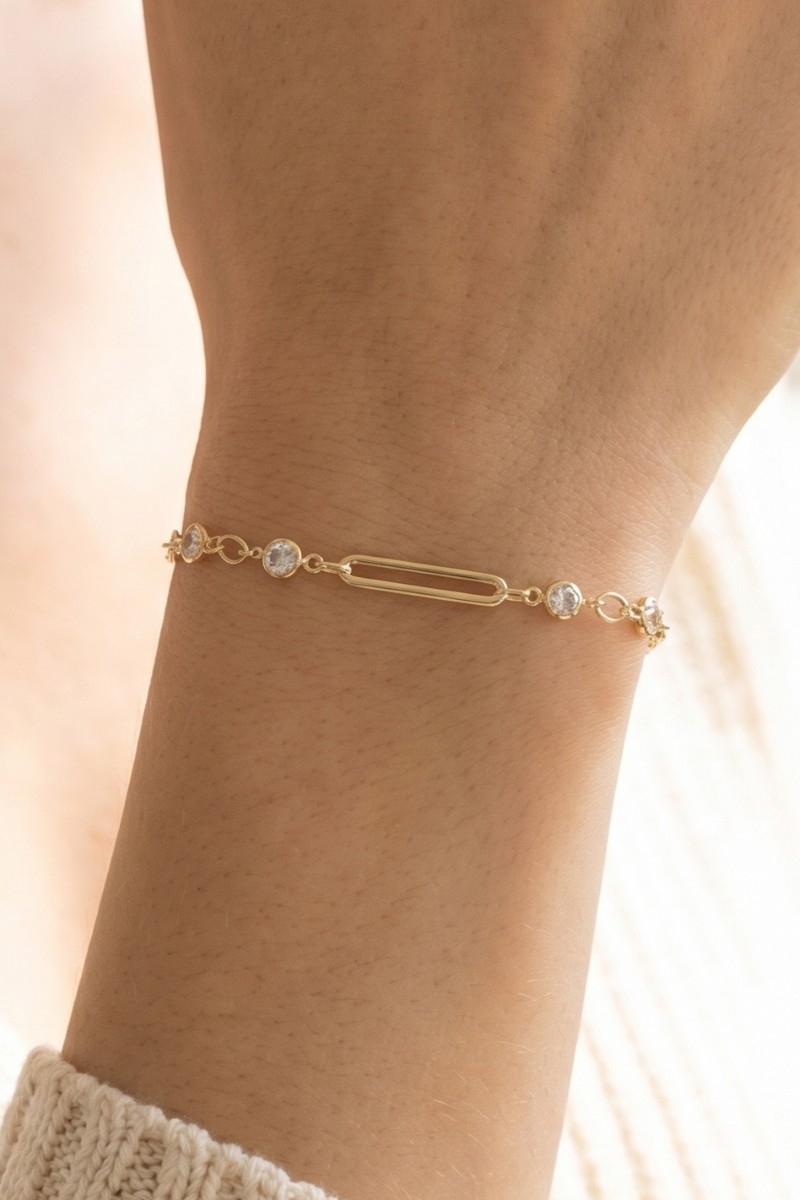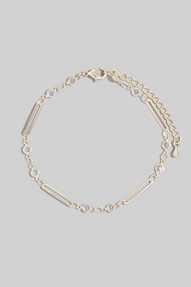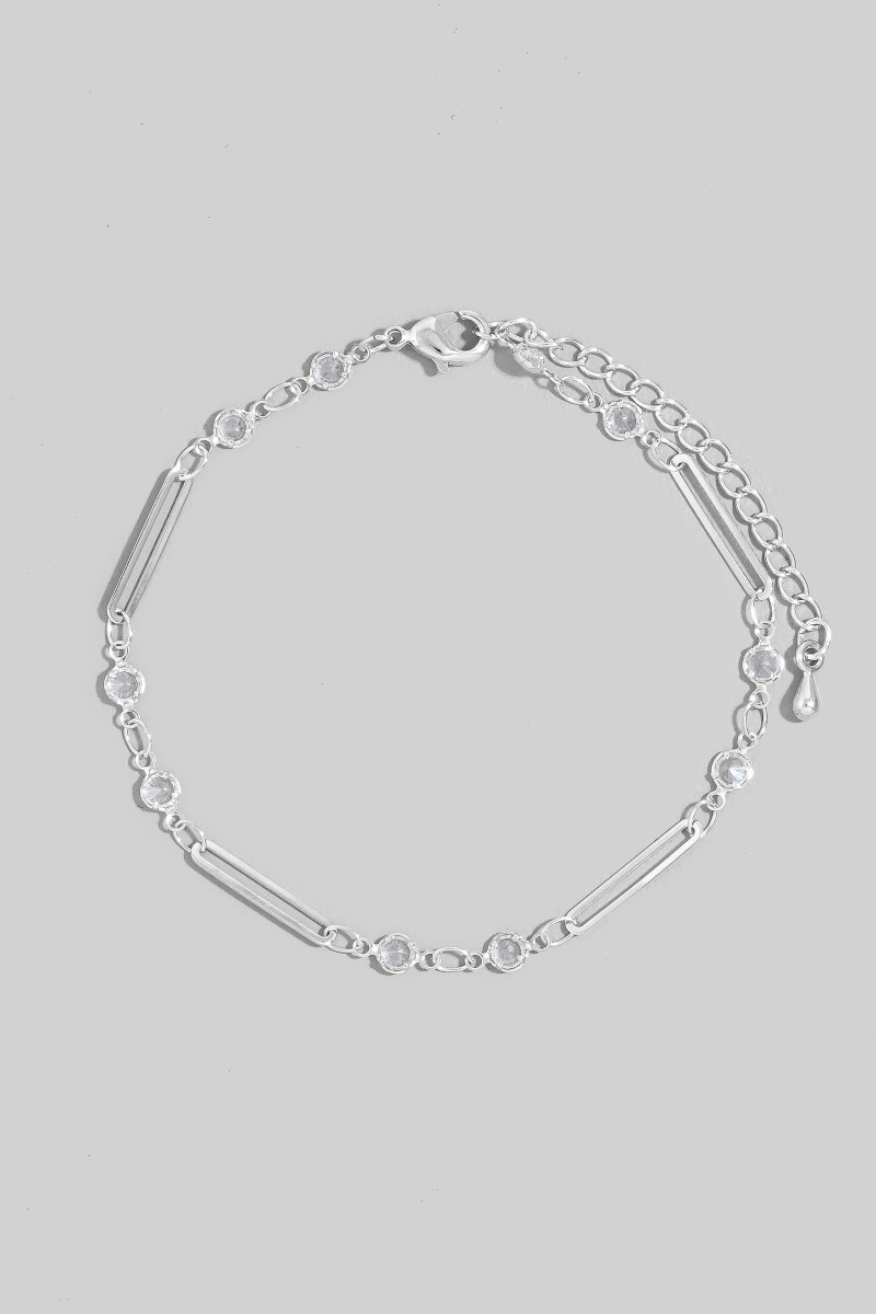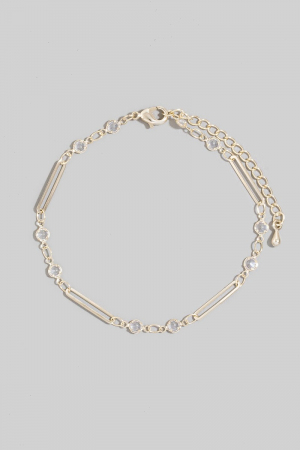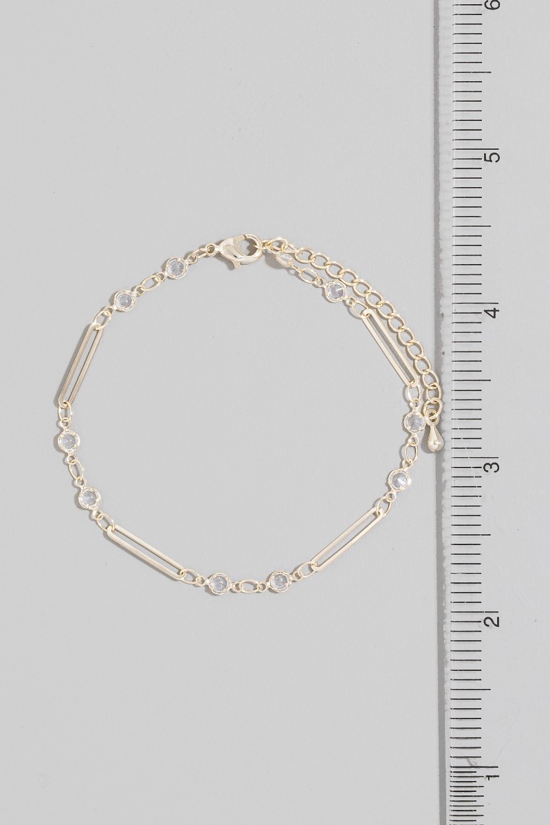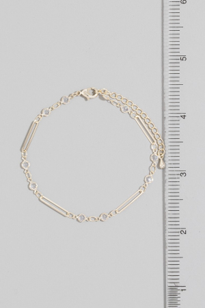 • This chain bracelet adds a modern bar & round cubic zirconia bezel station style. Experience the joy of accessorizing with this piece that effortlessly combines versatility and charm.