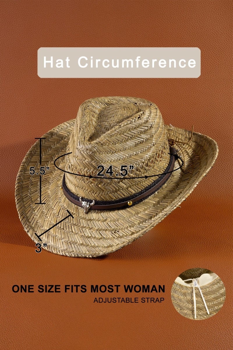 • This cowboy hat introduces a stunning western longhorn leather strap straw style. Immerse yourself in the world of understated glamour as this cowboy hat effortlessly exudes timeless appeal.