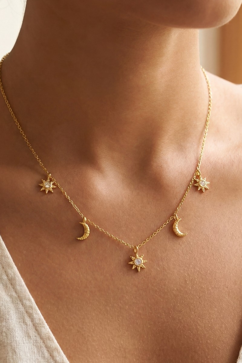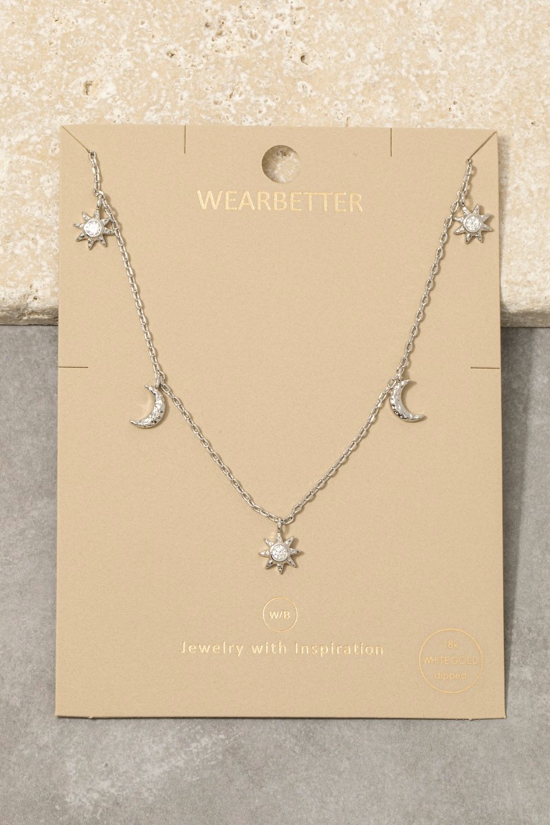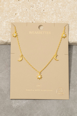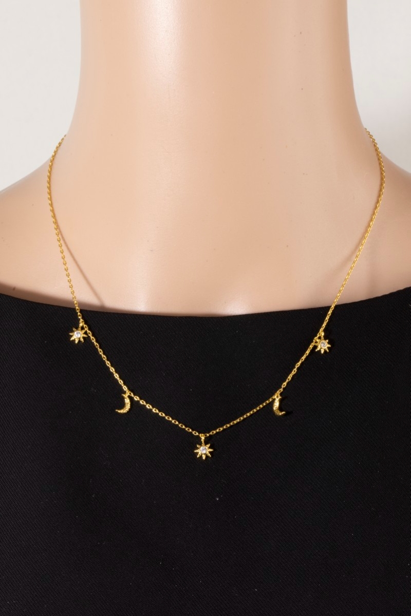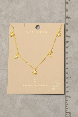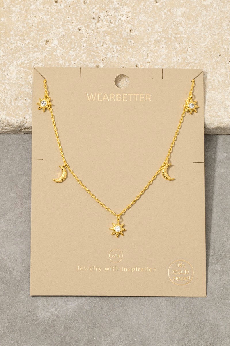 • This necklace introduces a stunning gold dipped cubic zirconia pave stars moon station charms style. Delight in the intricate details that make this necklace an essential element in expressing your fashion identity.