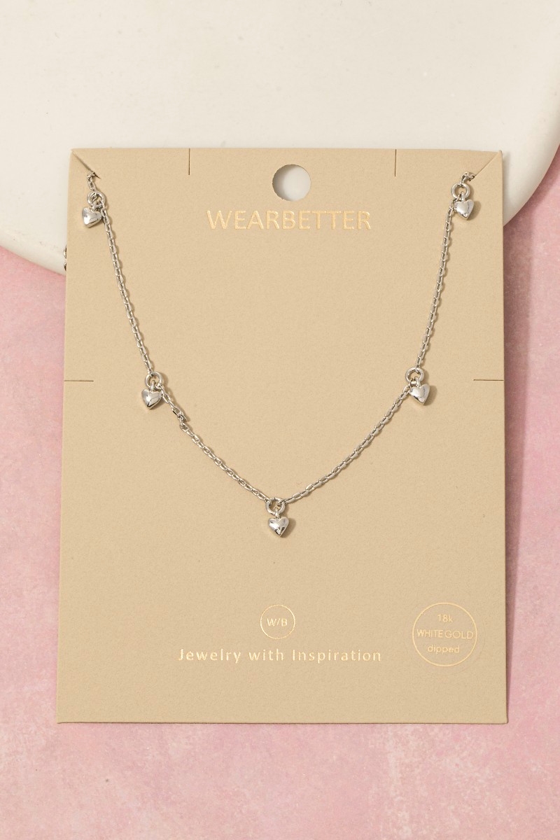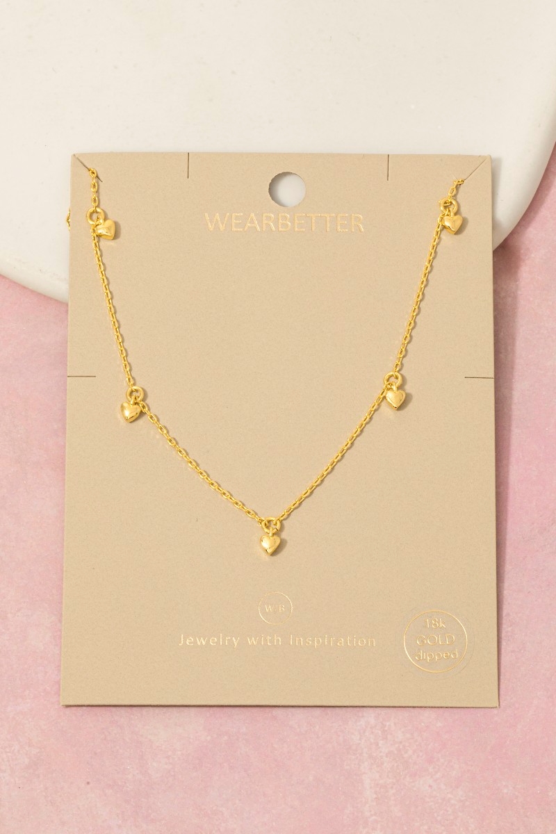 • This chain necklace displays a fashionable gold dipped mini heart station charms style. Celebrate the art of accessorizing with this piece that effortlessly encapsulates modern trends.