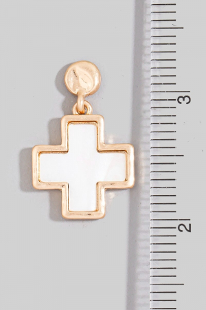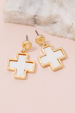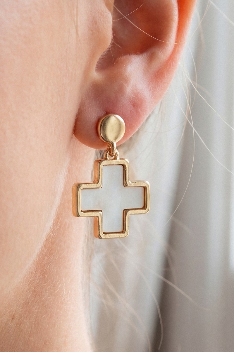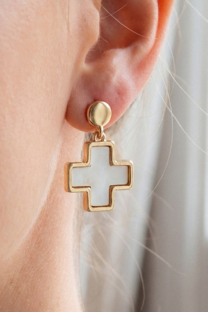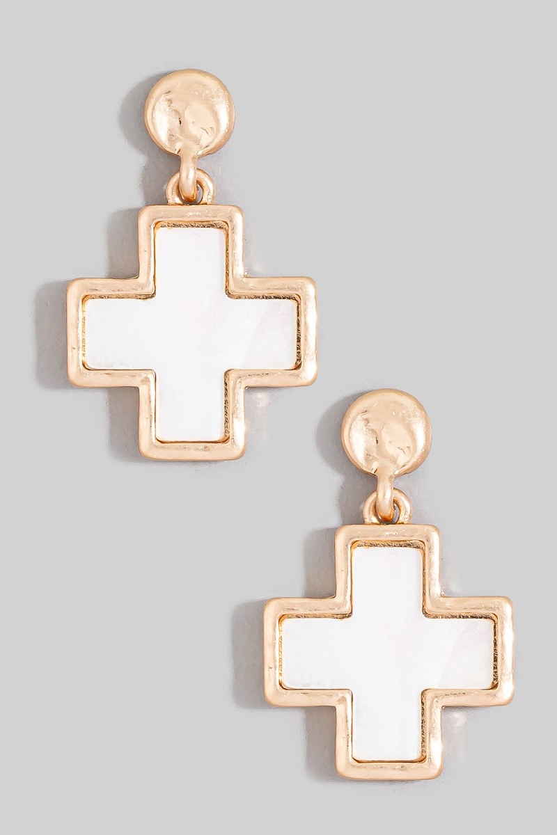 - This pair of drop earrings features a fashionable mother of pearl cross style. Unveil modern elegance with this subtly intricate pair of drop earrings.