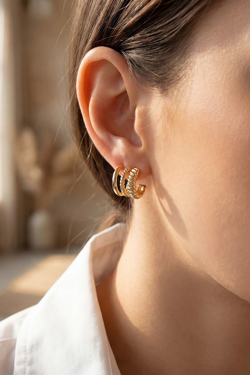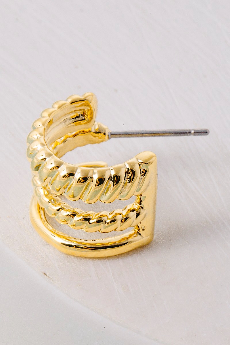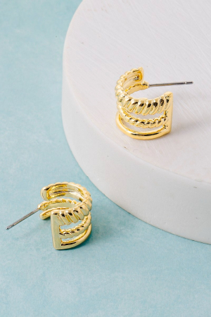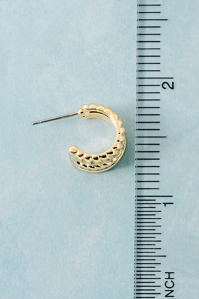 - This pair of hoop earrings showcases a timeless wide layered mini style. Revel in the intricate design that effortlessly distinguishes this pair of hoop earrings, making it a statement piece.