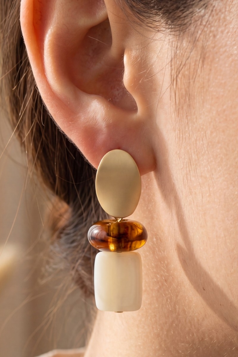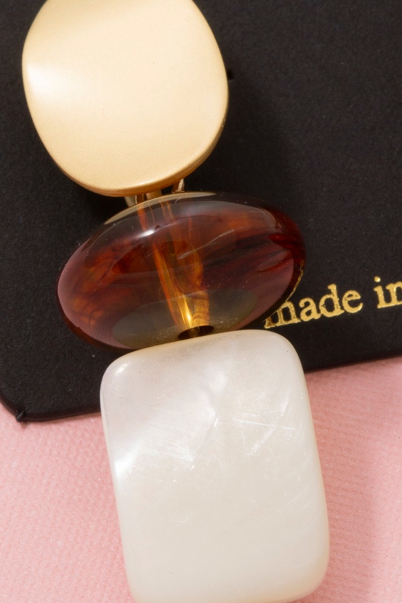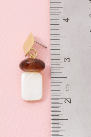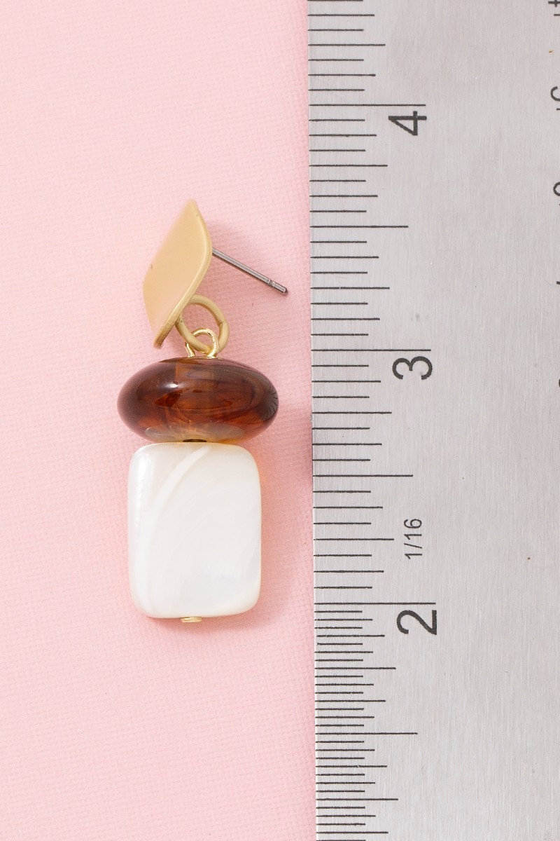 • This pair of drop earrings showcases a unique ivory resin amber bead shell style. Unveil modern elegance with this subtly intricate pair of drop earrings.