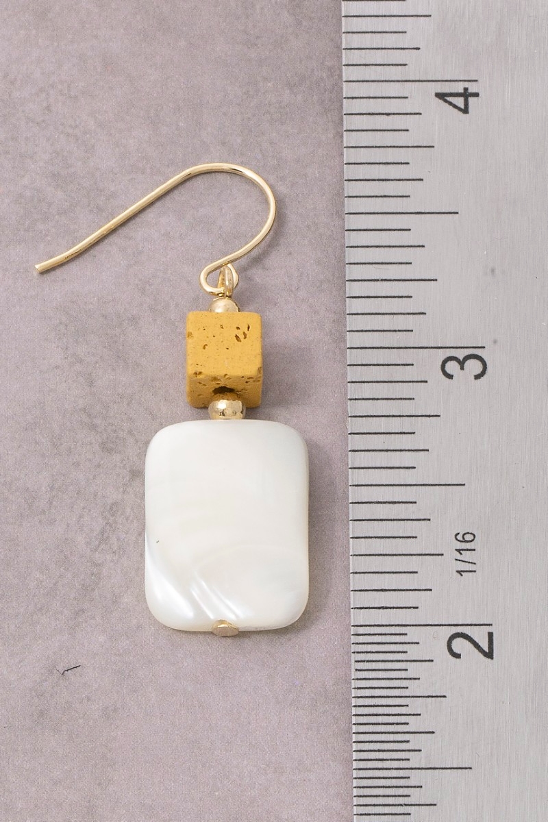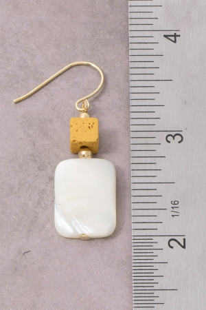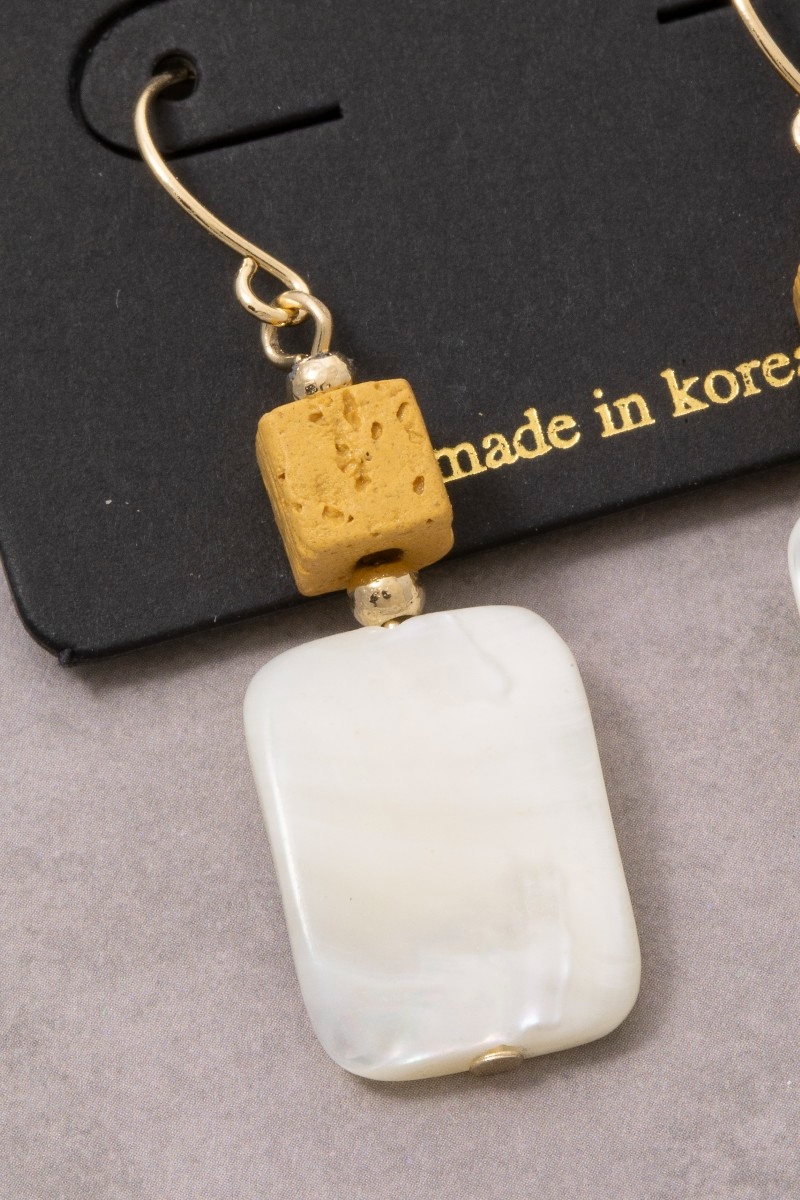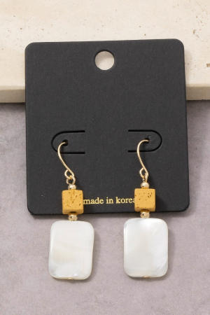 • This pair of drop earrings brings a unique gold cube bead mother of pearl style. Experience refined sophistication with this understated yet stylish piece.