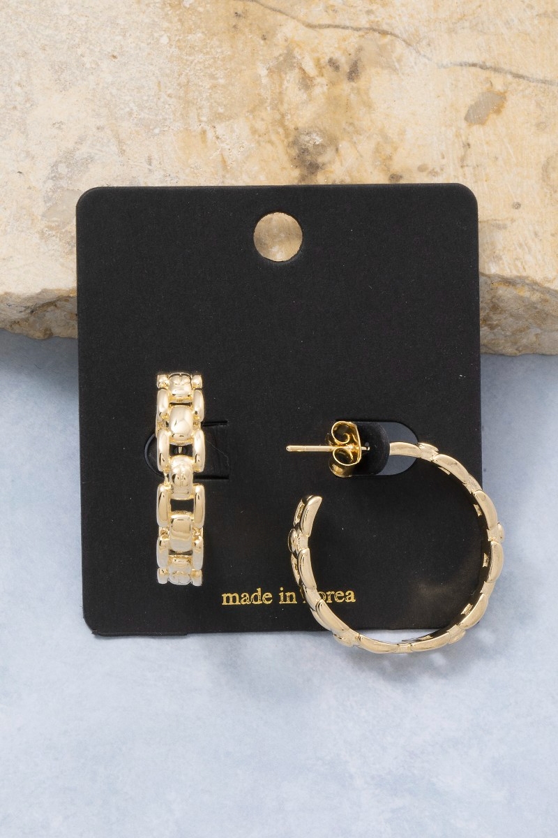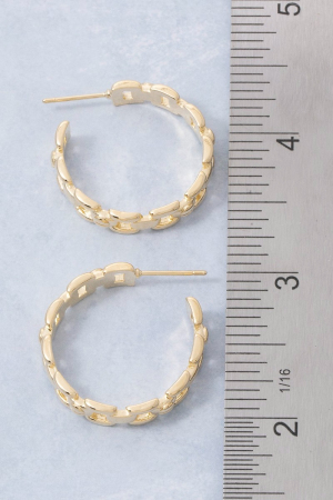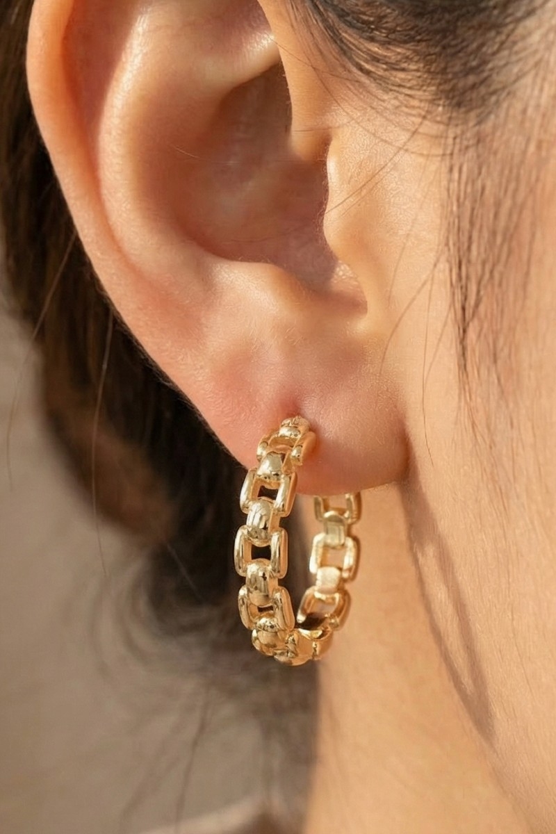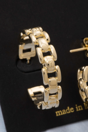 • This pair of hoop earrings showcases a unique gold chain link textured style. Celebrate individual style with this versatile, eye-catching addition.