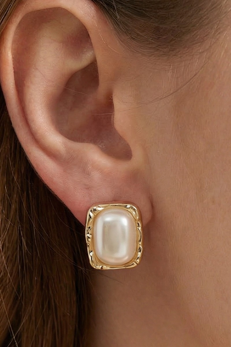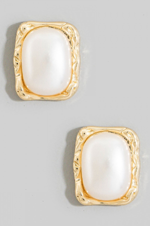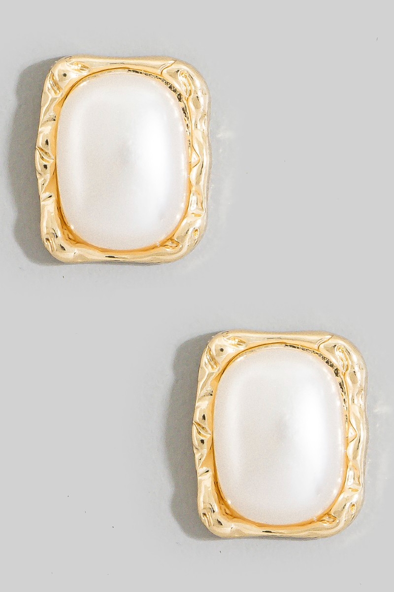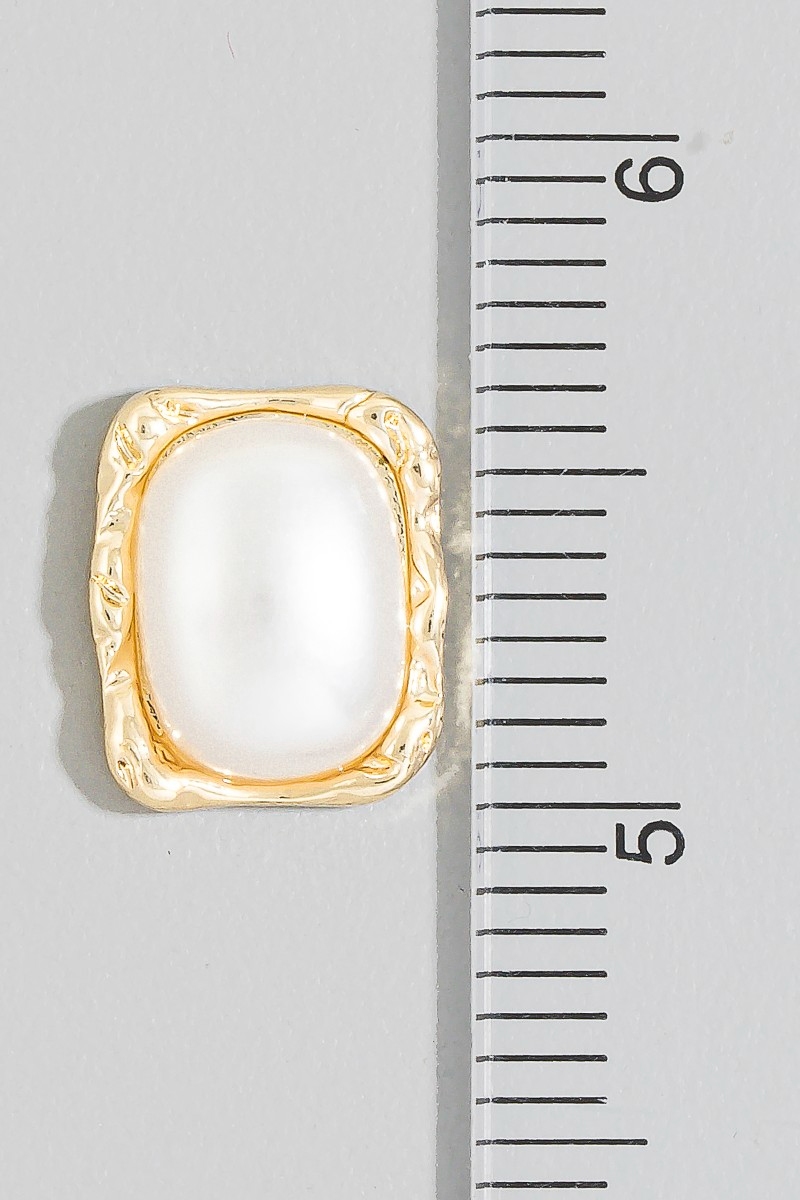 • This pair of stud earrings displays a fashionable gold molten frame pearl square style. Celebrate individuality with this pair of stud earrings that effortlessly expresses your unique sense of style.