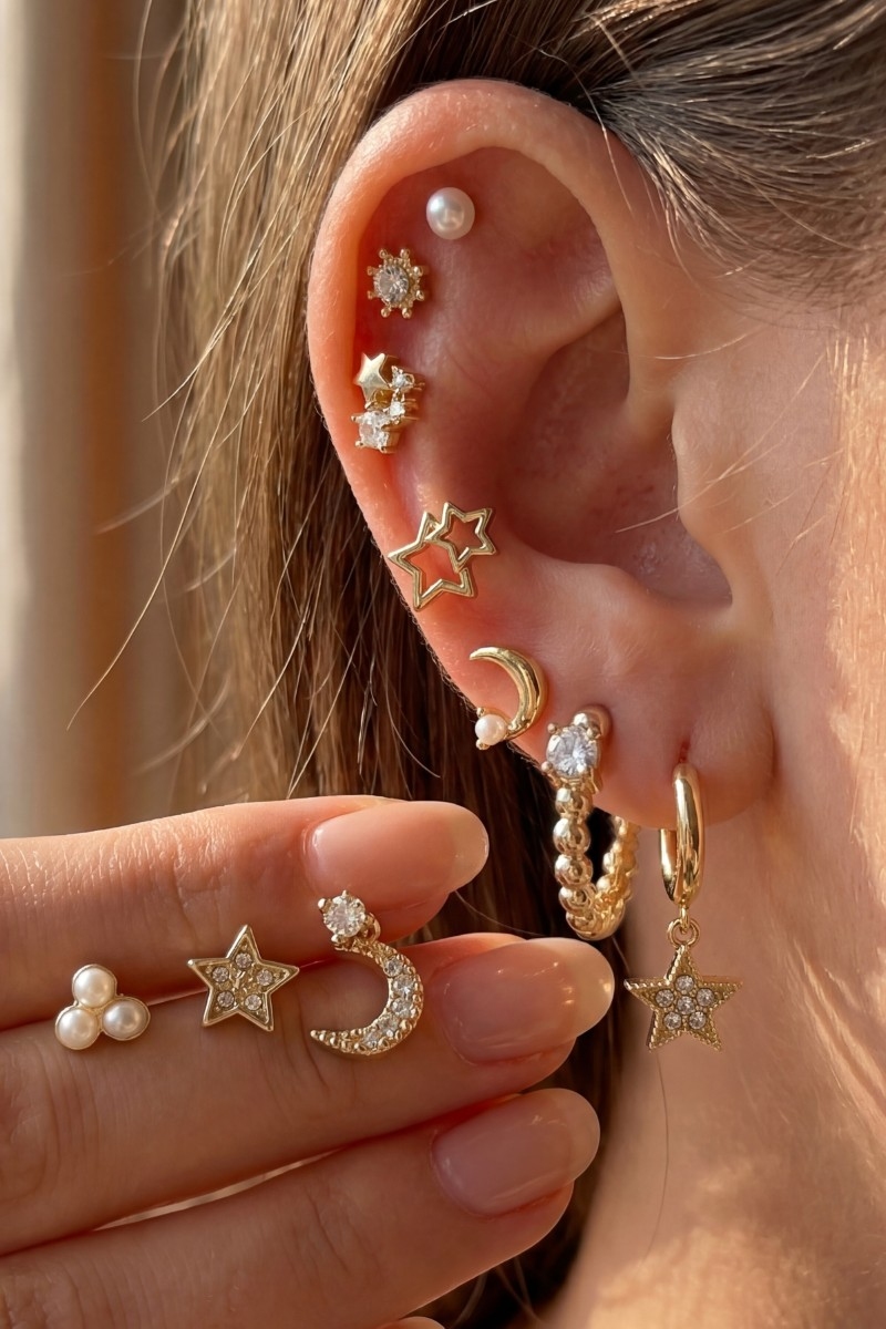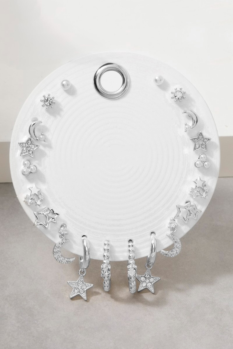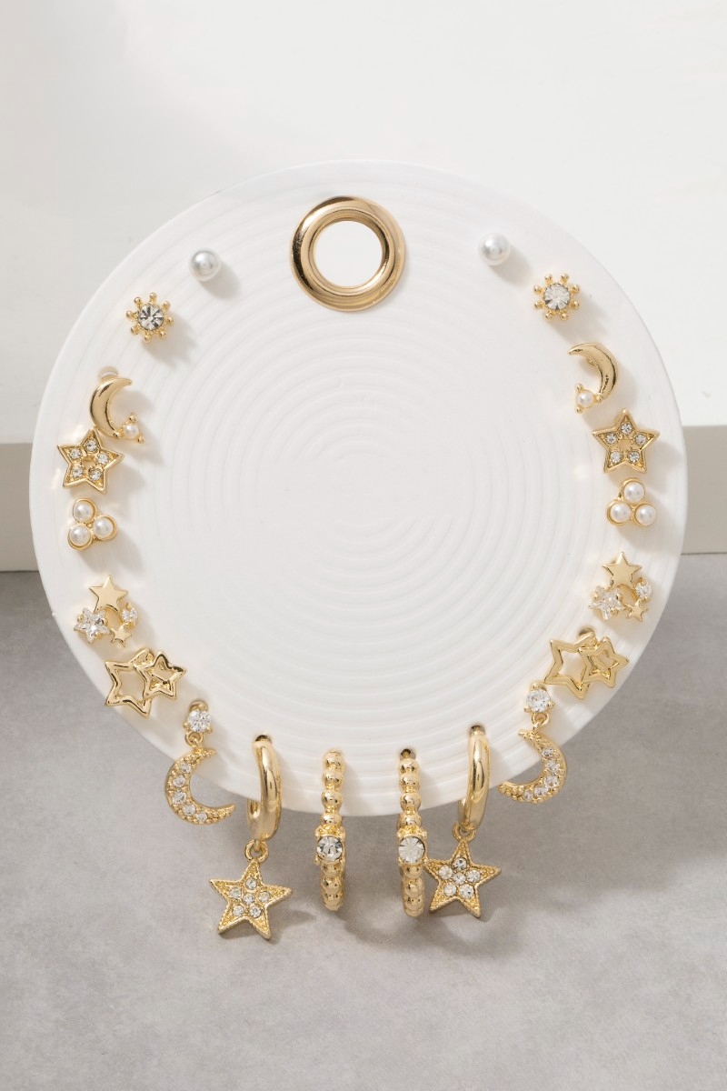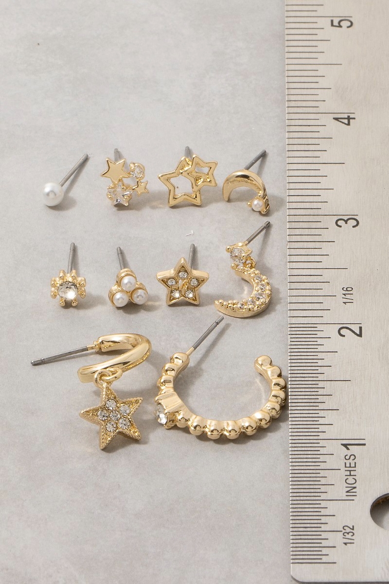 - This pair of earrings displays a fashionable star moon crystal 9 pair earring set style. Savor the allure of detailed craftsmanship in this exquisite pair of earrings.
