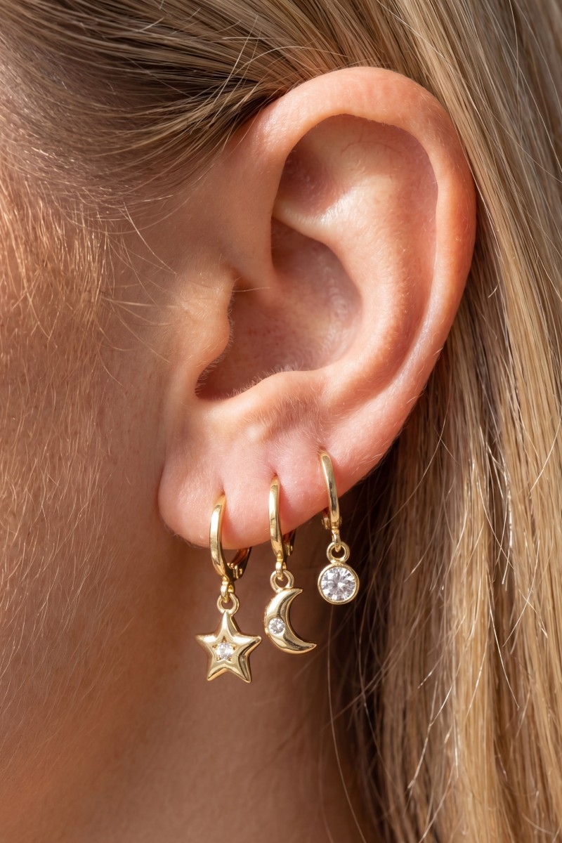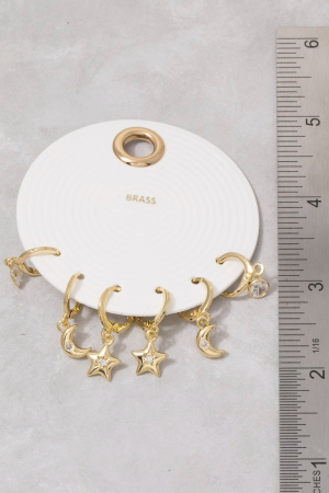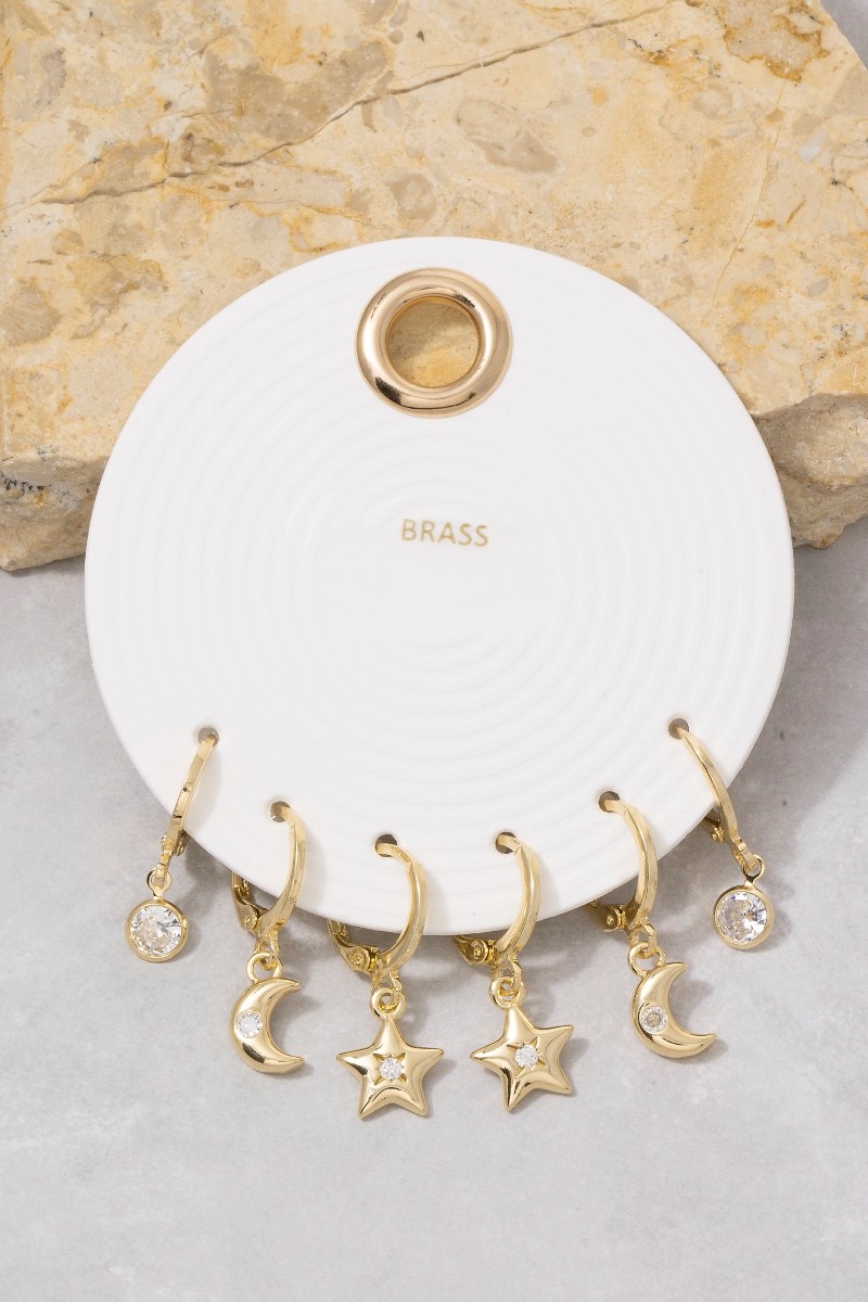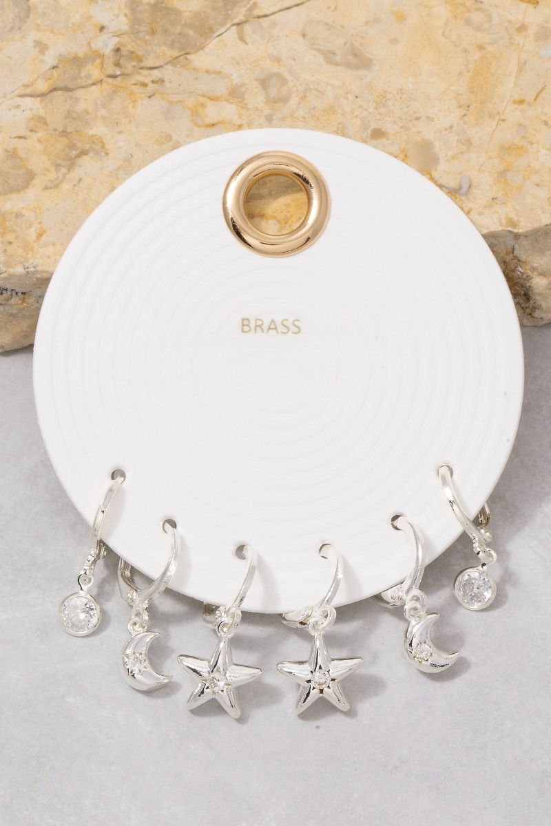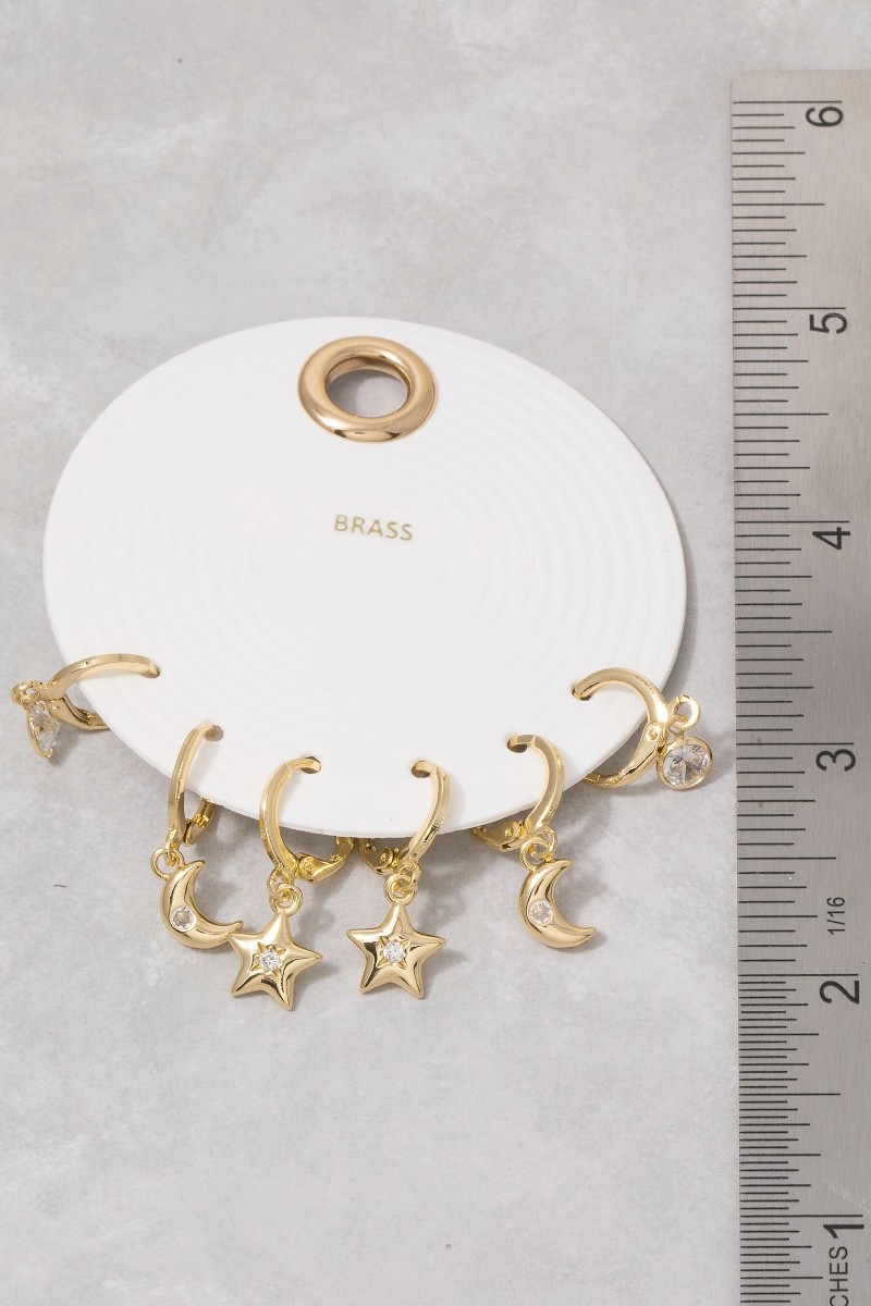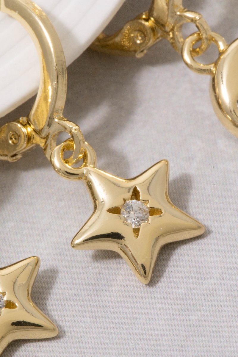 - This pair of earrings introduces a unique cz moon star charm hoop earring set style. Celebrate individual style with this versatile, eye-catching addition.