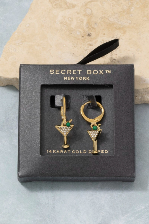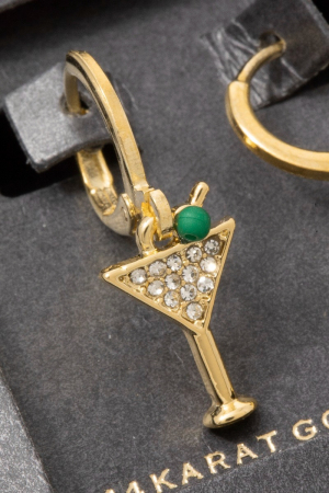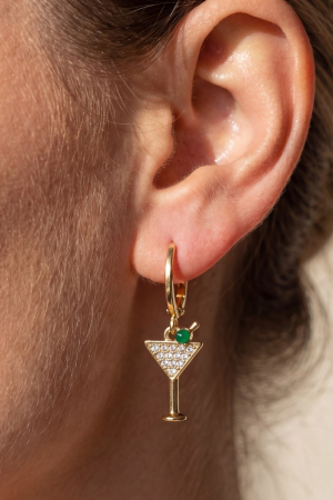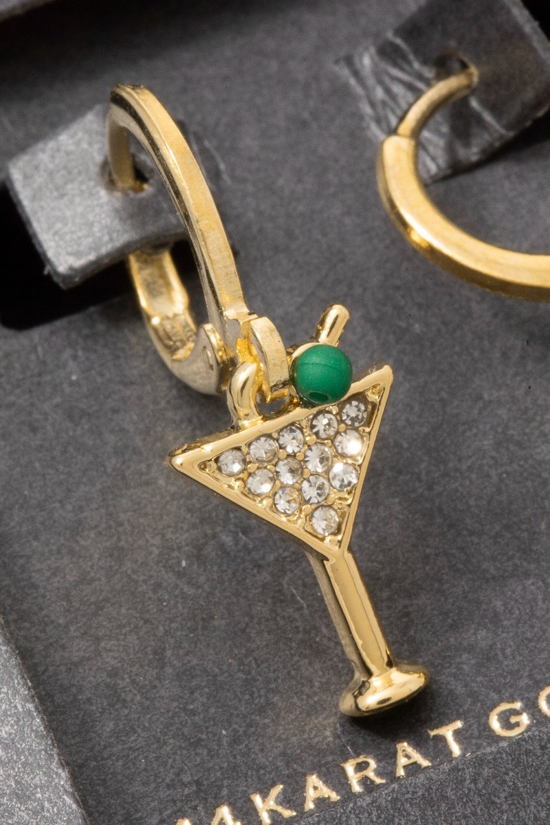 • This pair of earrings displays a vibrant 14k gold dipped cubic zirconia martini charm huggie style. Delight in the nuanced details that make this pair of earrings a testament to fine design and impeccable taste.