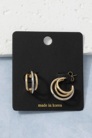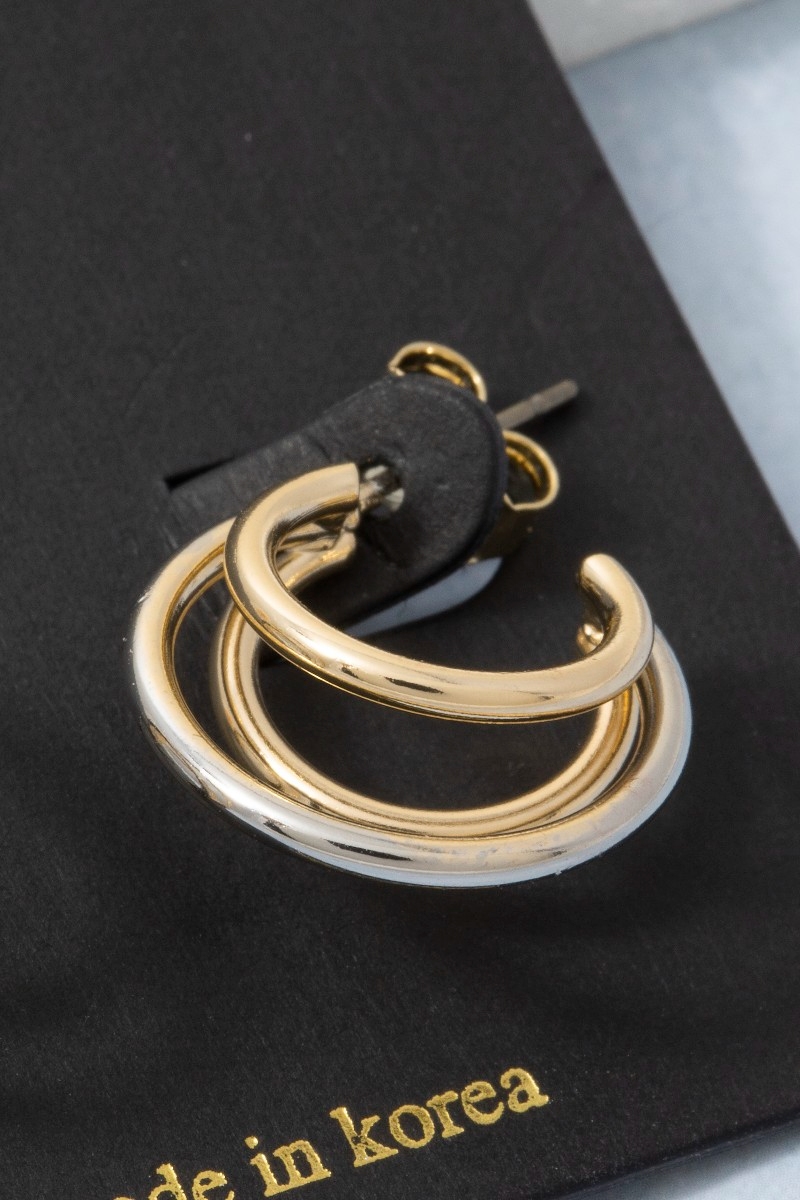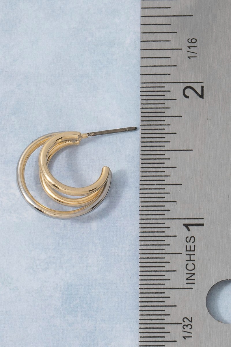 - This pair of hoop earrings displays a fashionable two-tone triple huggie style. Experience a burst of creativity in accessorizing as this piece effortlessly sets the tone for your unique style.
