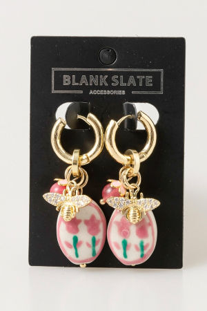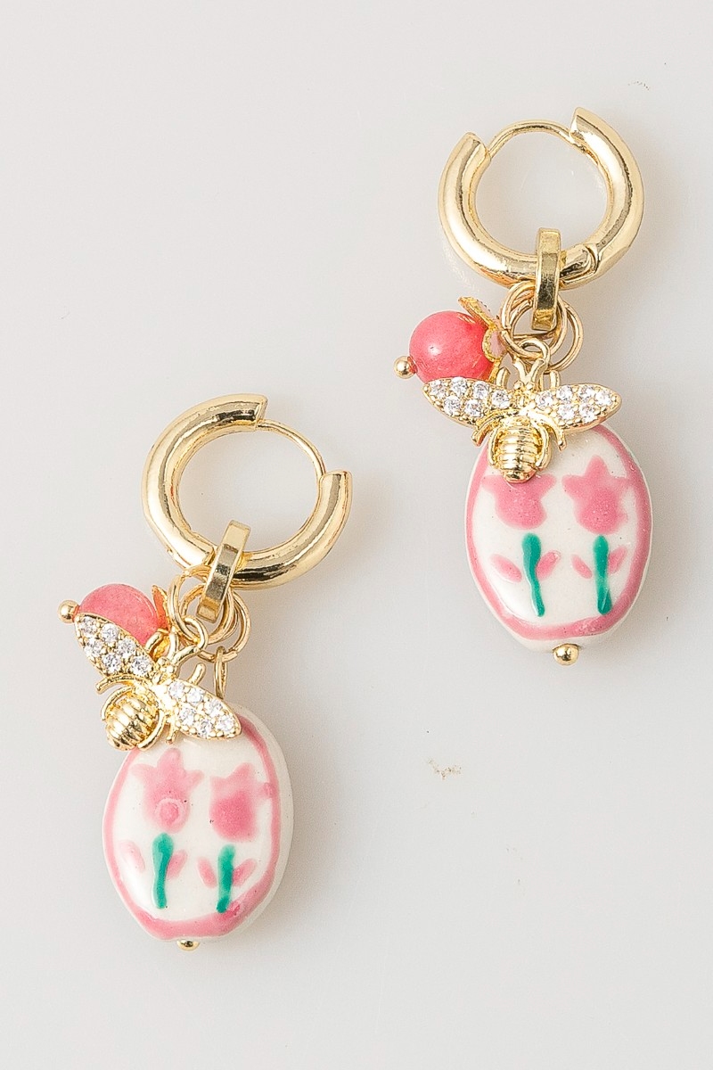 - This pair of hoop earrings displays a vibrant bee and floral ceramic charm style. Delight in the intricate details that make this pair of hoop earrings an essential element in expressing your fashion identity.