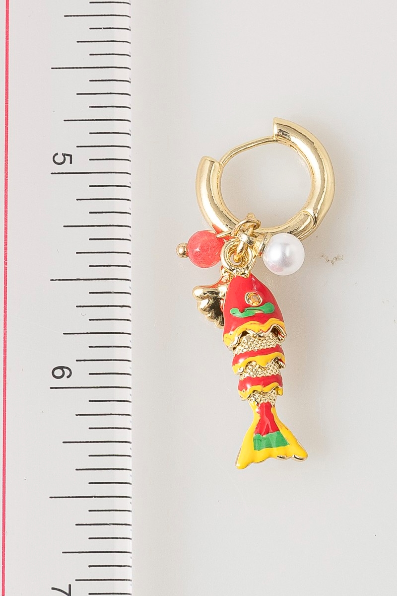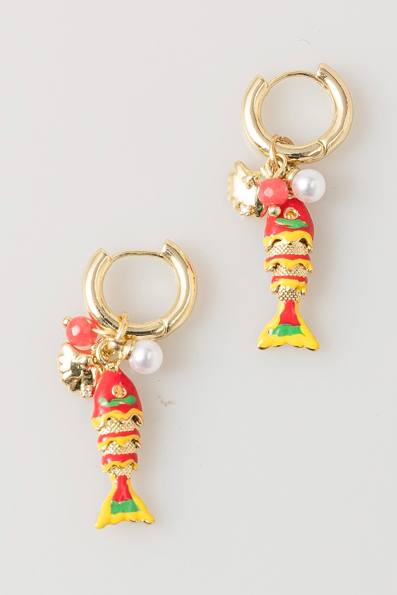 - This pair of hoop earrings displays a fashionable colorful fish pearl and shell charms style. Savor the craftsmanship that goes beyond the ordinary, as this pair of hoop earrings effortlessly captivates attention.