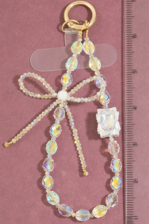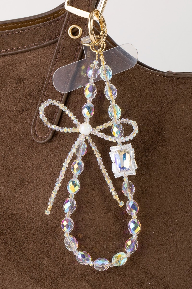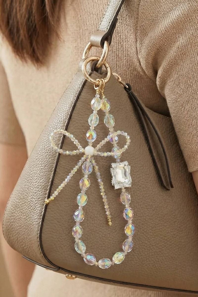 • This keychain showcases a timeless crystal beads with ribbon bow bag charm style. Delight in the nuanced details that make this keychain a testament to fine design and impeccable taste.