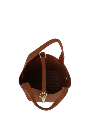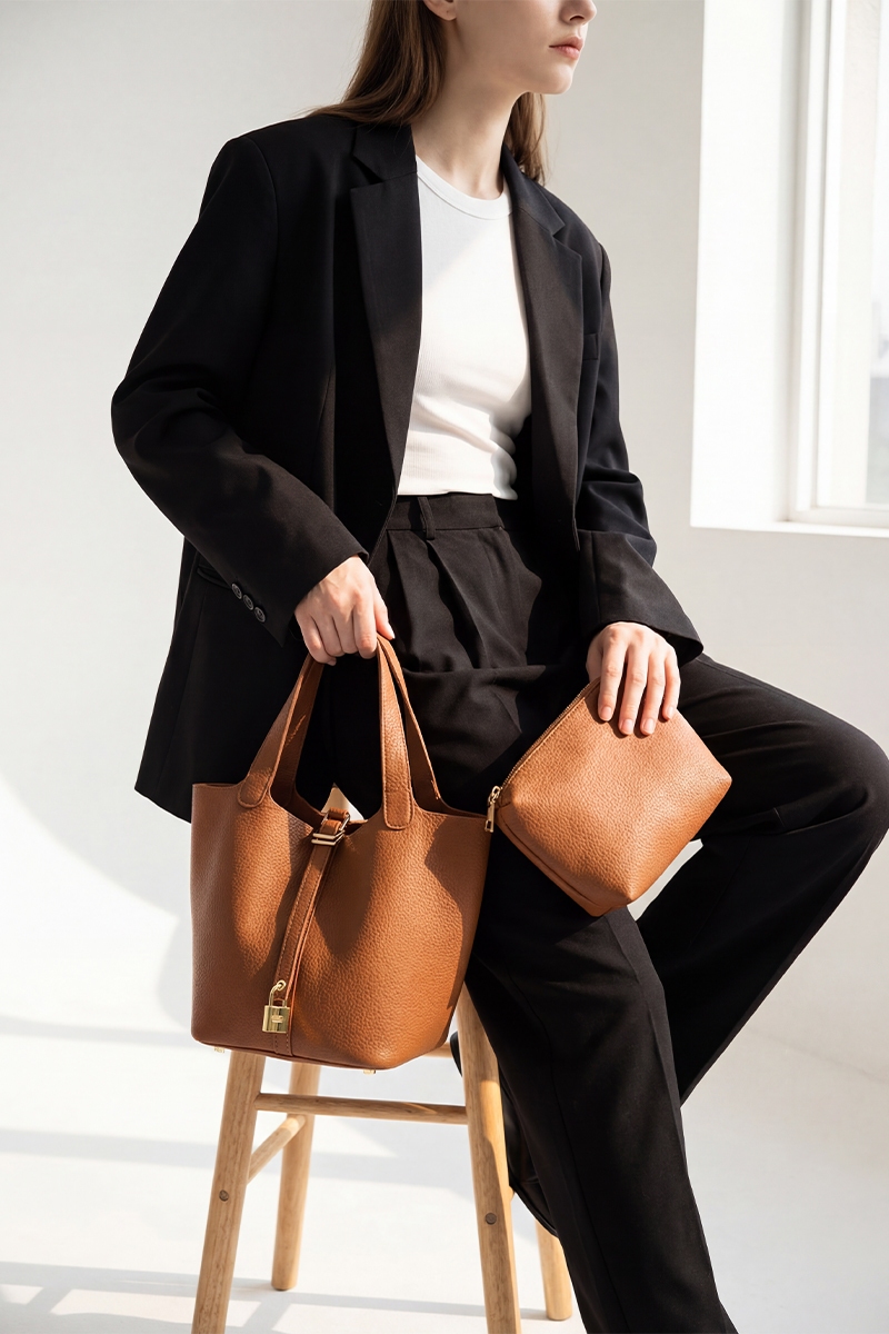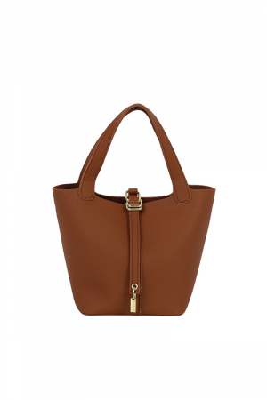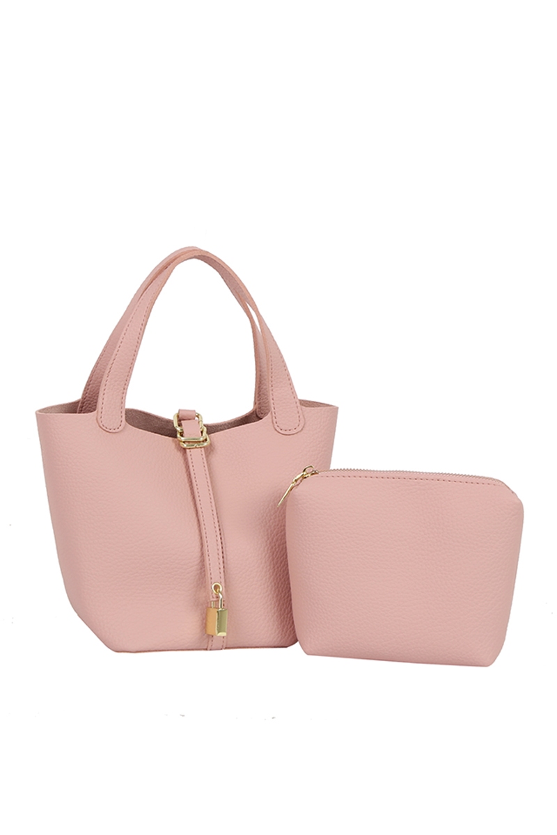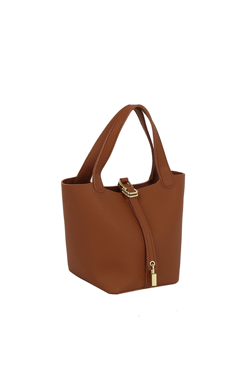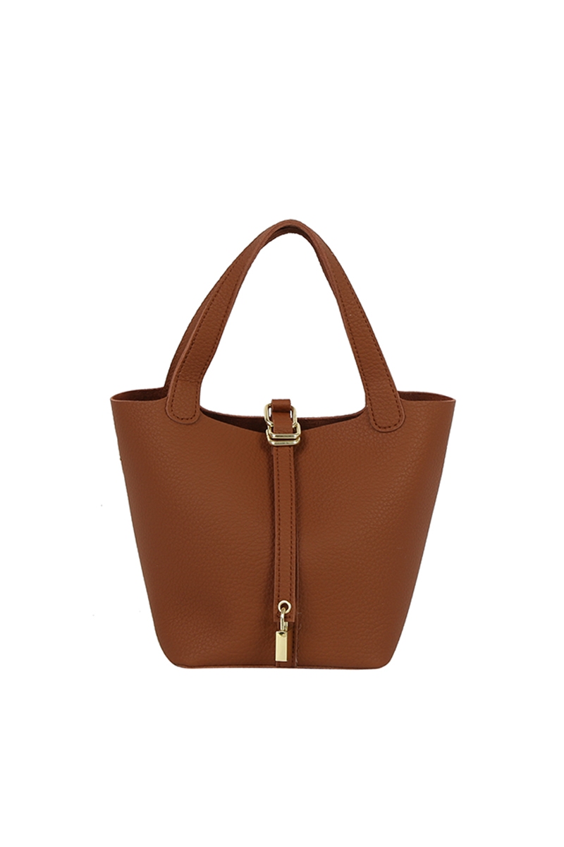 - This hand bag displays a fashionable faux leather bucket set style. Delight in the nuanced details that make this hand bag a testament to fine design and impeccable taste.