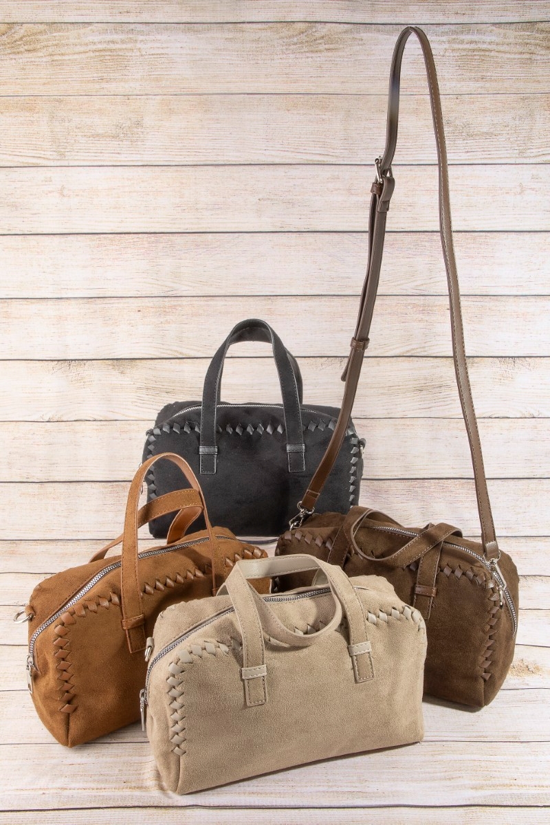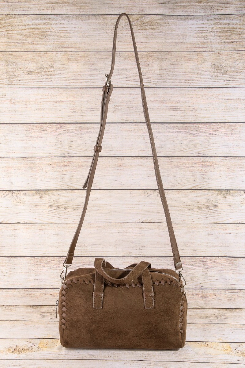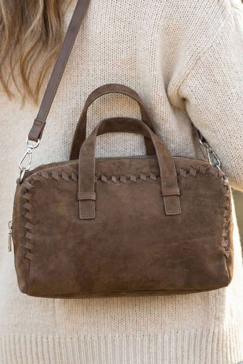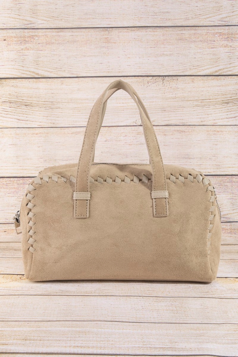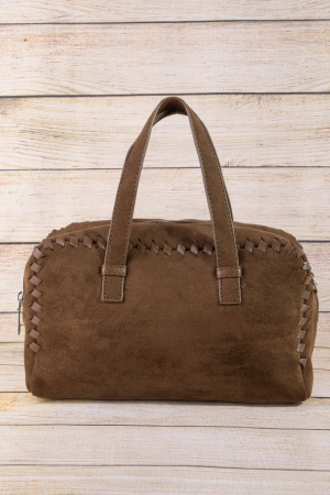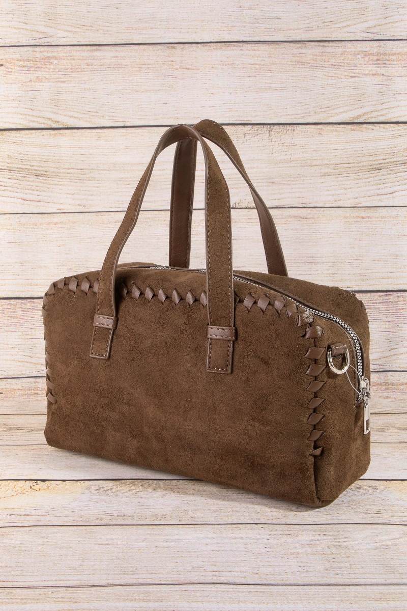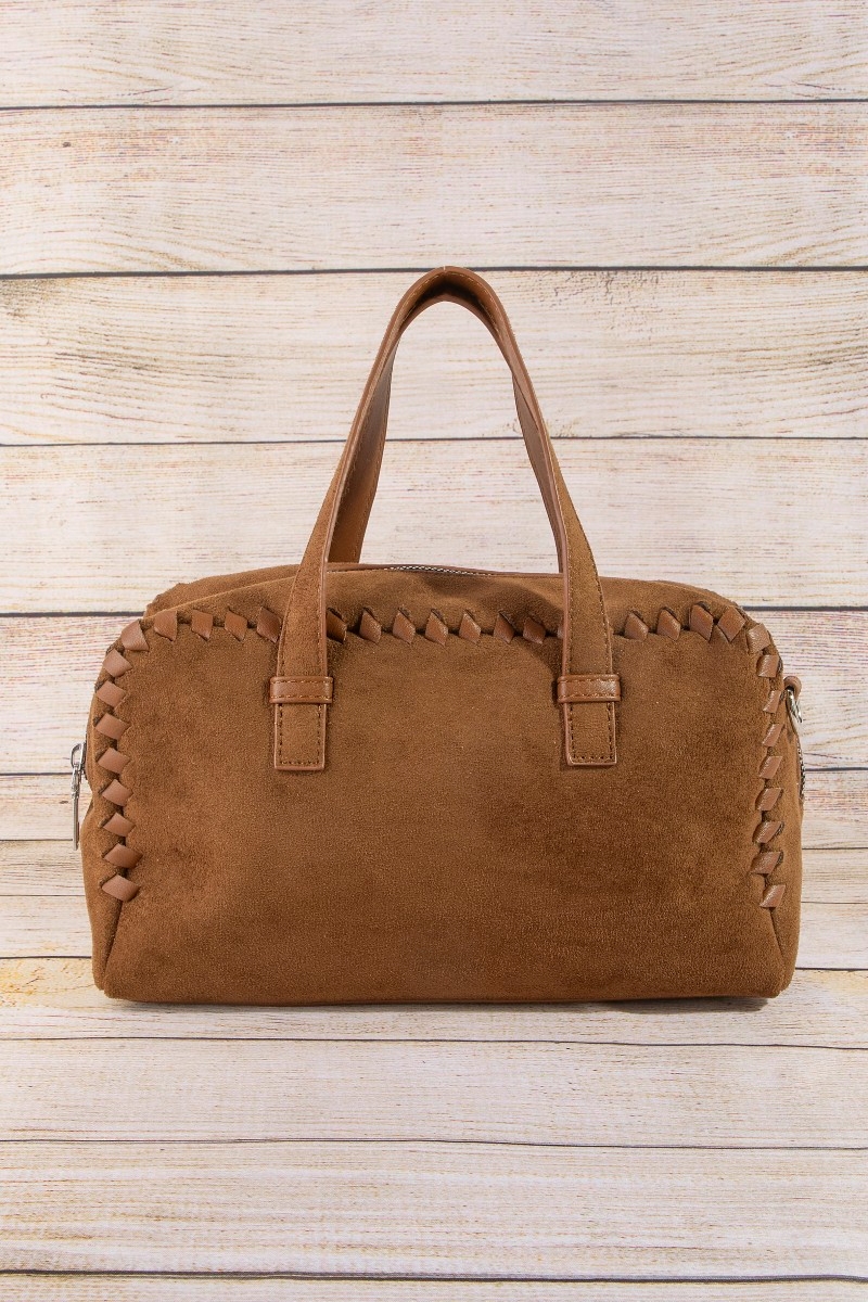 - This hand bag features a fashionable rectangle woven trim detail suede bag style. Redefine your look effortlessly with this standout, on-trend piece.