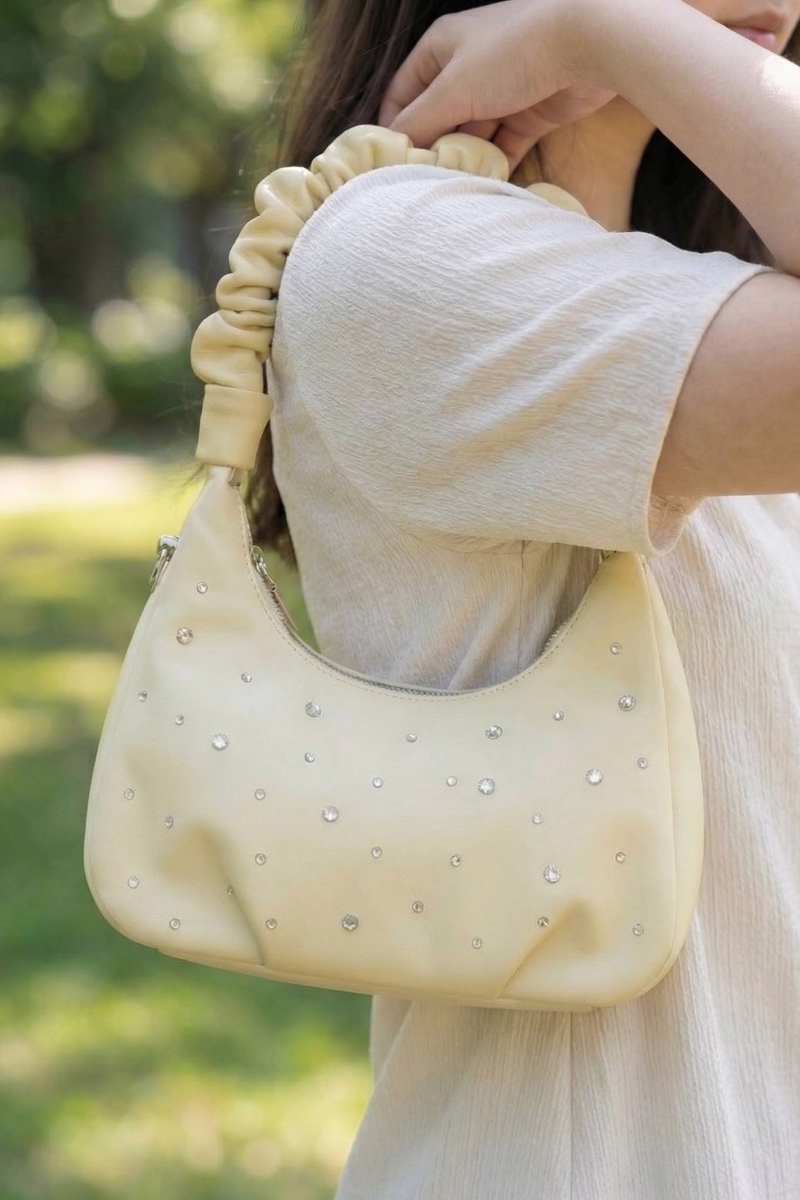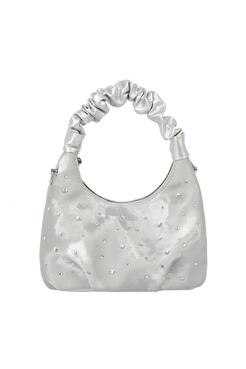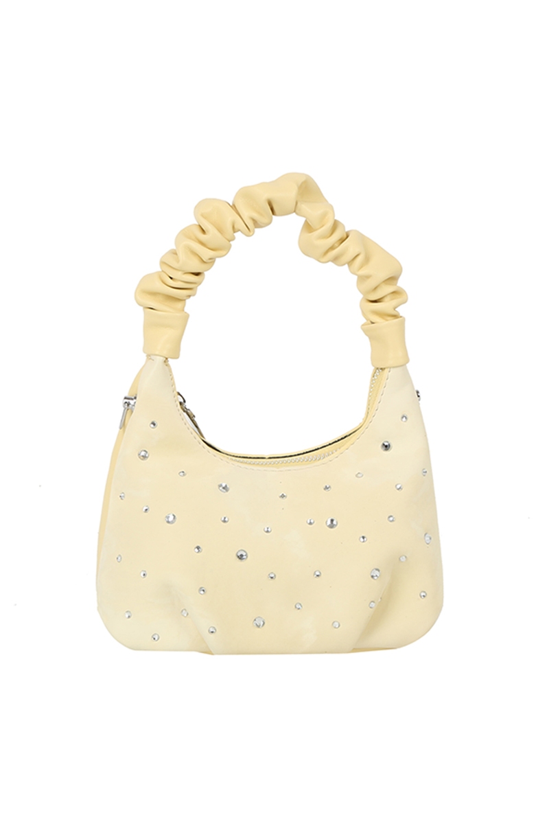 - This hand bag introduces a unique studded ruched handle satchel style. Savor the allure of detailed craftsmanship in this exquisite hand bag.