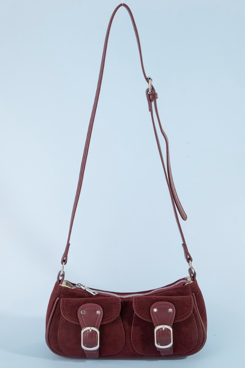 • This hand bag brings a stunning suede double belted front pockets style. Experience the joy of accessorizing with this piece that effortlessly combines versatility and charm.