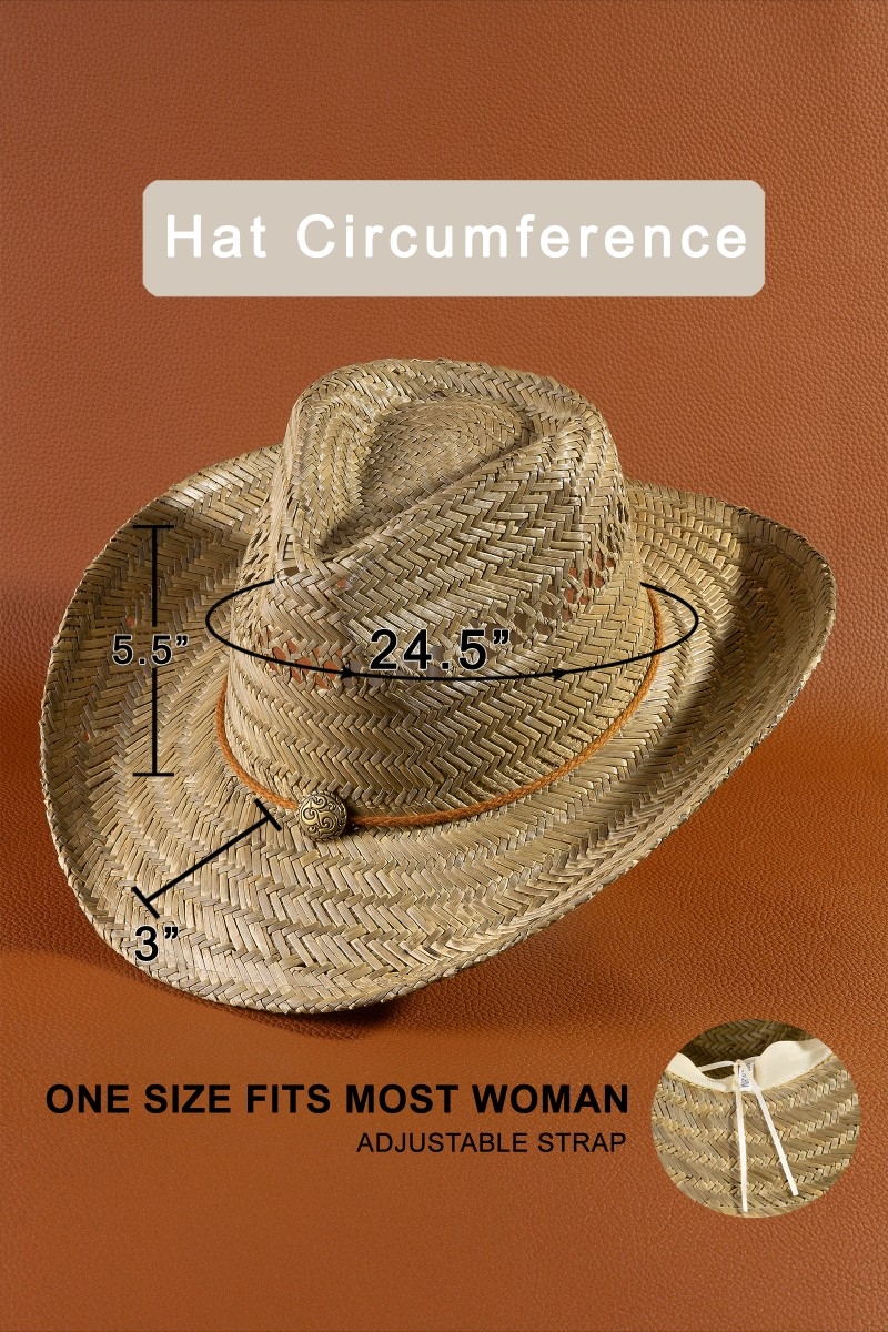 • This cowboy hat introduces a stunning western medallion rope straw style. Celebrate individuality with this cowboy hat that effortlessly expresses your unique sense of style.