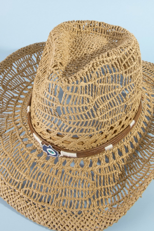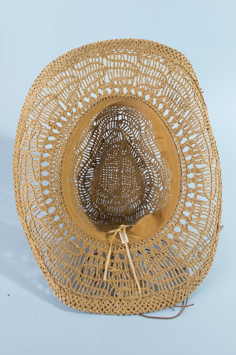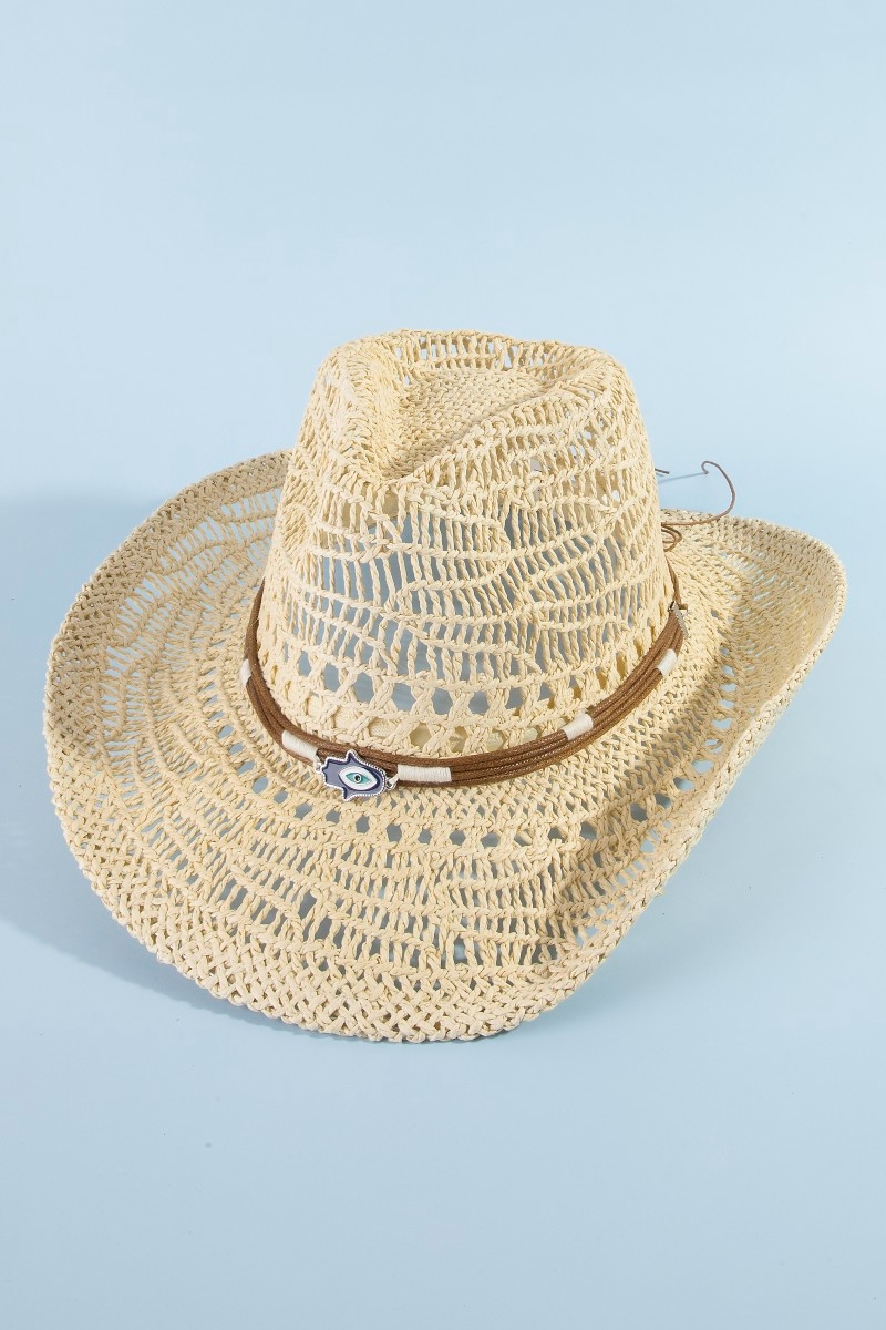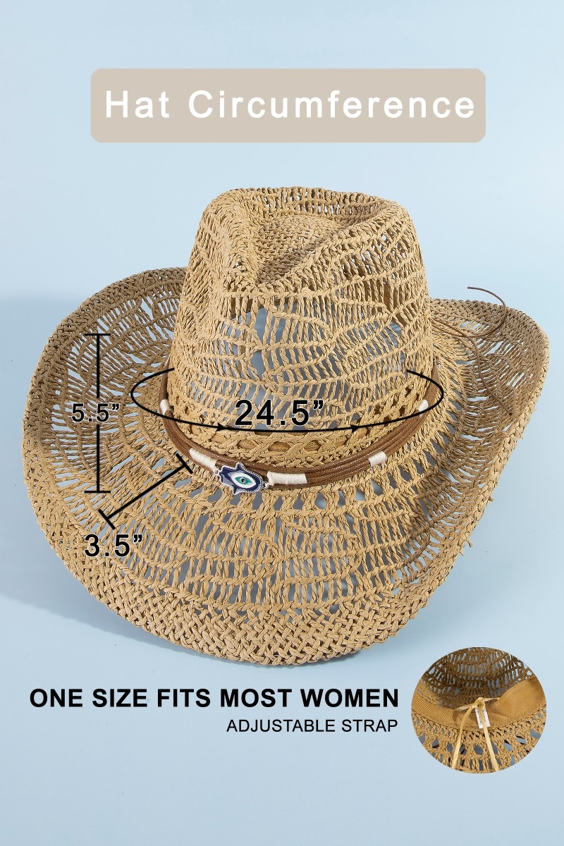 - This cowboy hat features a fashionable straw braided hamsa hand western style. Experience a subtle blend of modernity and classic charm as this cowboy hat effortlessly adorns your ensemble.