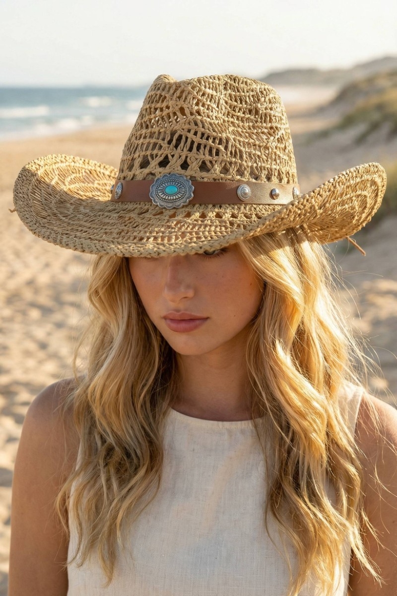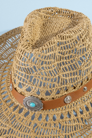 • This cowboy hat introduces a stunning straw braided concho band western style. Explore a blend of classic charm and contemporary flair.