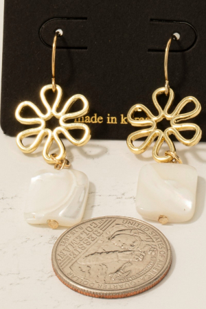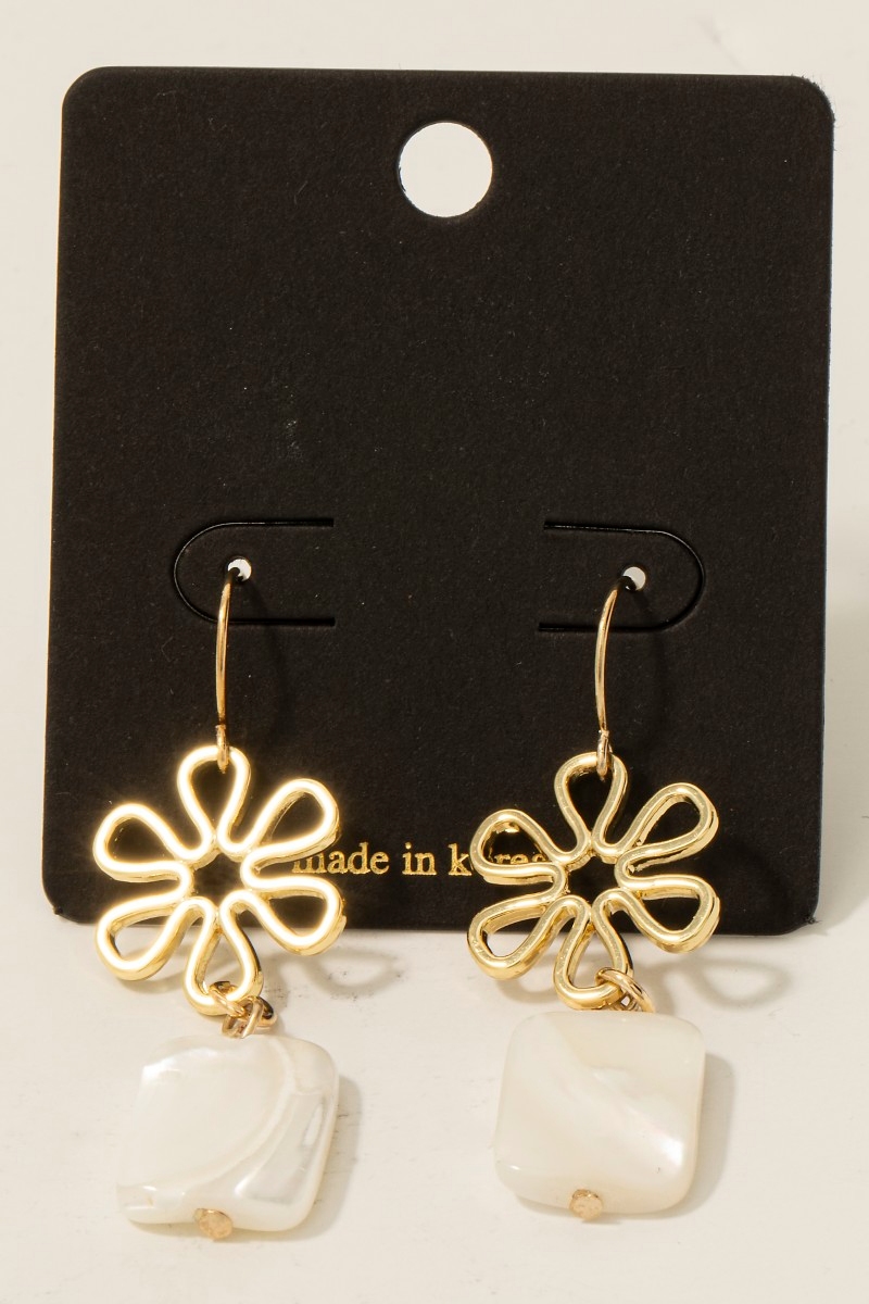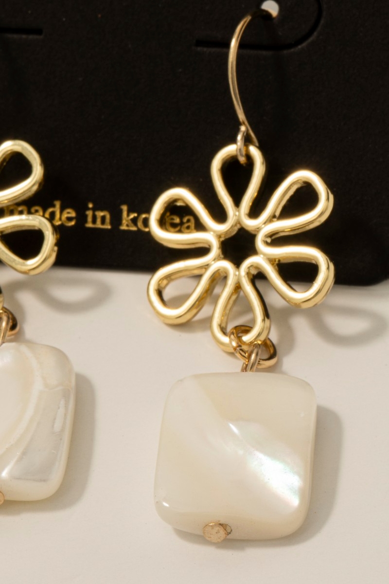 - This pair of dangle earrings displays a fashionable flower and rectangle shell style. Explore a blend of classic charm and contemporary flair.