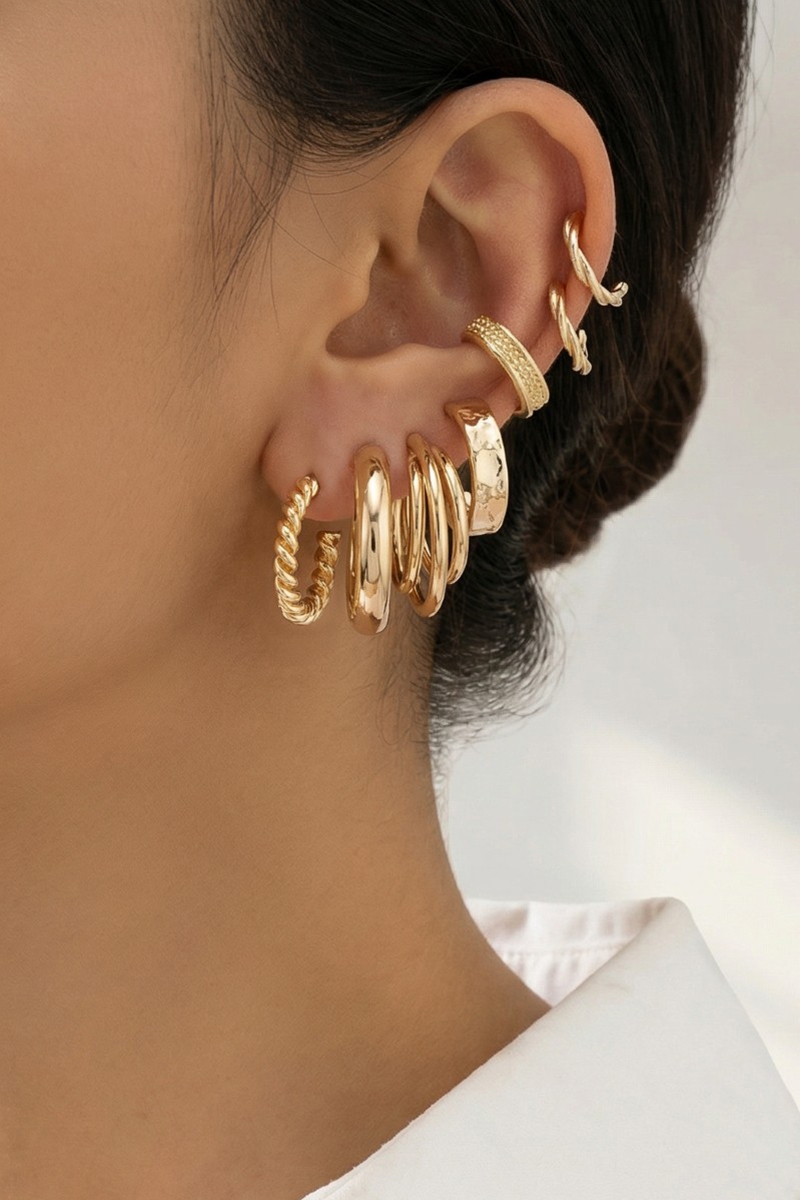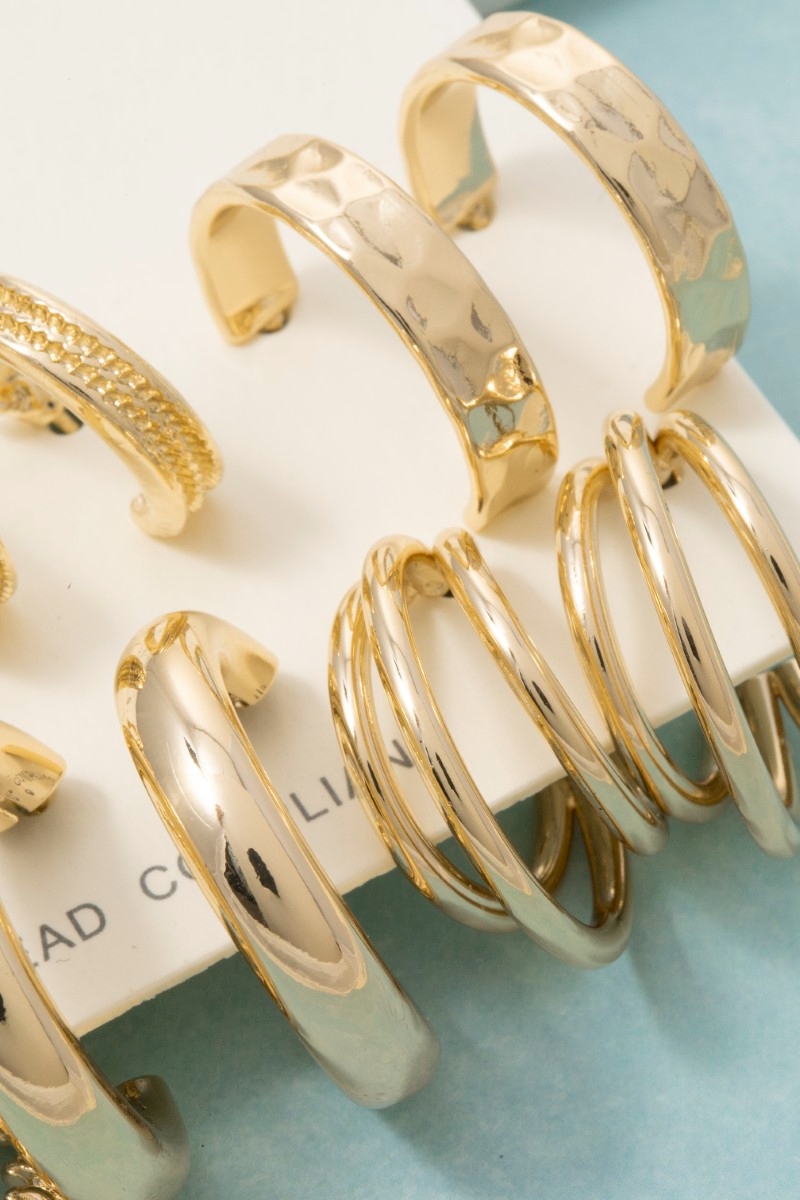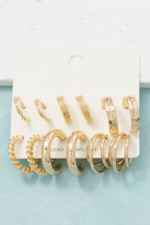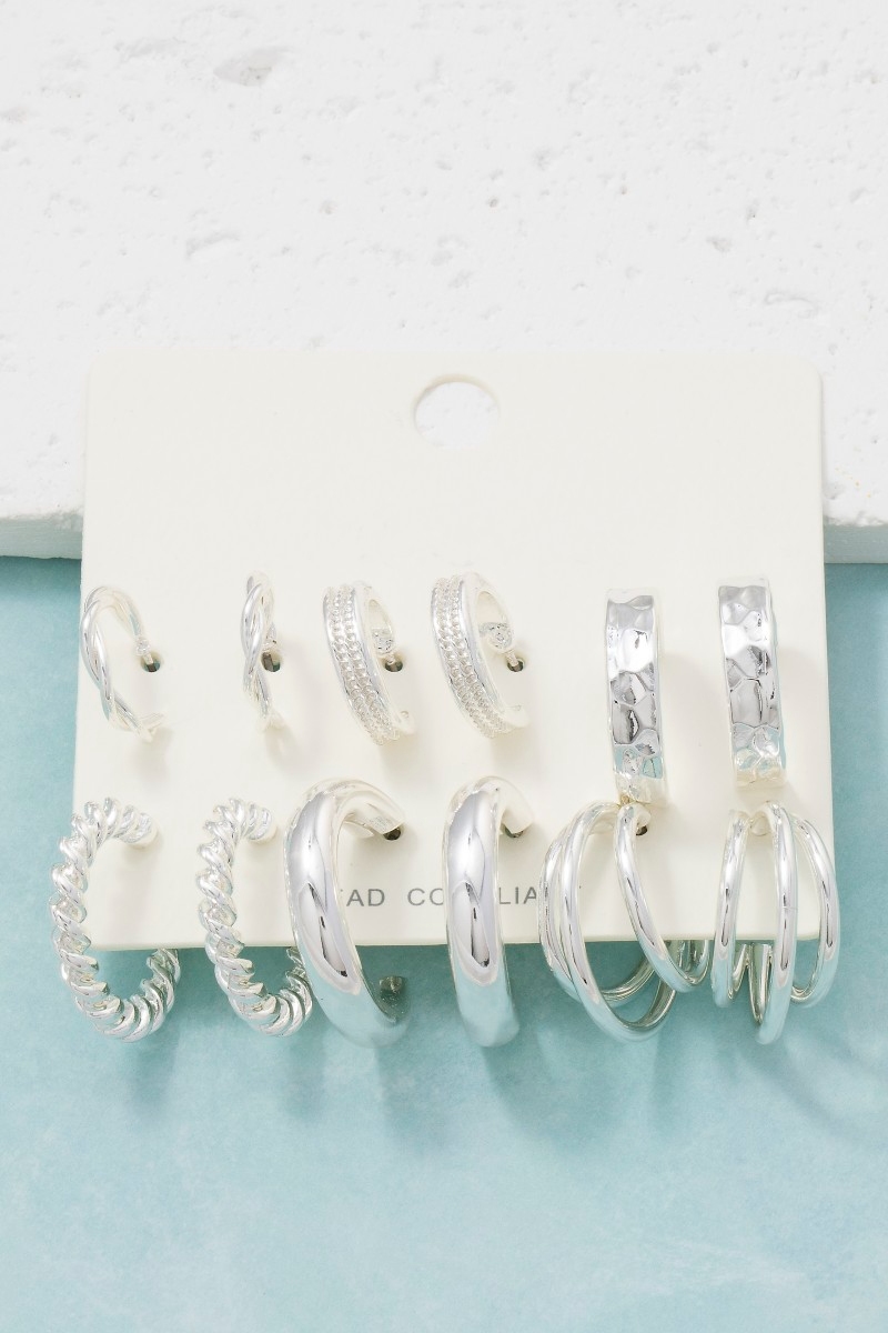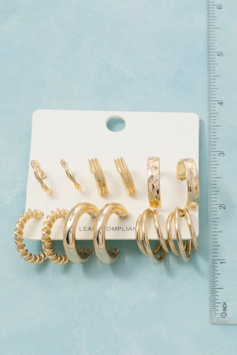 - This pair of hoop earrings introduces a stunning assorted 6 pair set style. Indulge in the allure of exquisite craftsmanship as this pair of hoop earrings effortlessly adds a touch of luxury to your attire.