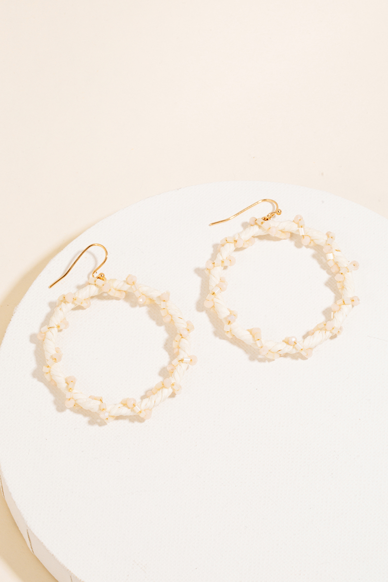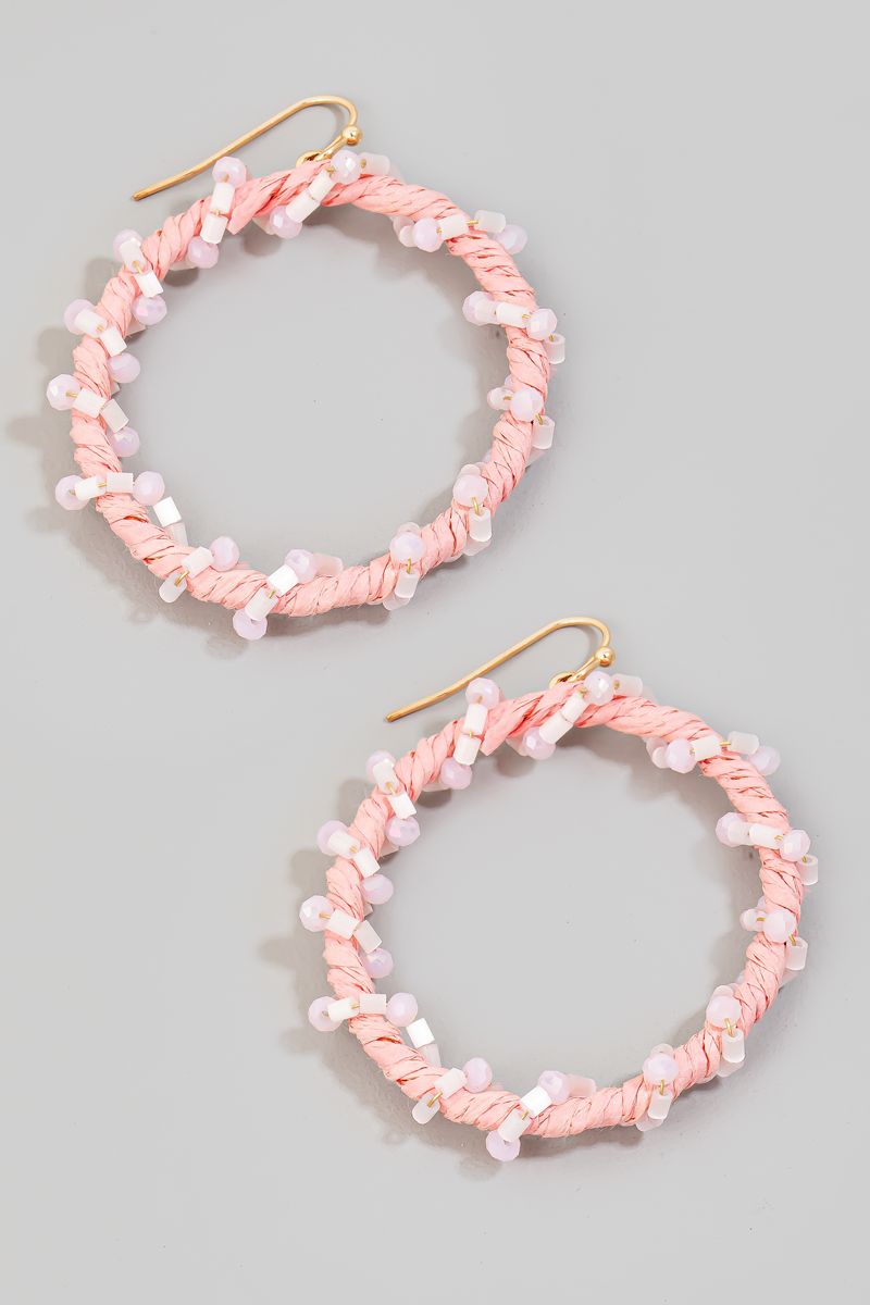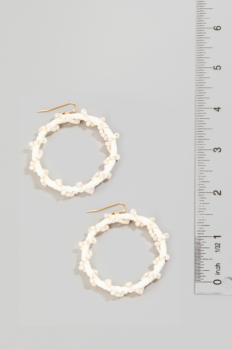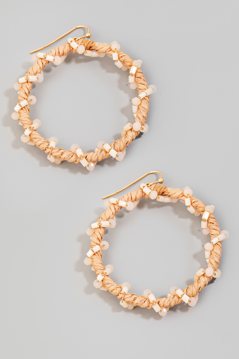 - This pair of drop earrings features a fashionable raffia and bead wrap hoop style. Experience a subtle blend of modernity and classic charm as this accessory effortlessly adorns your ensemble.