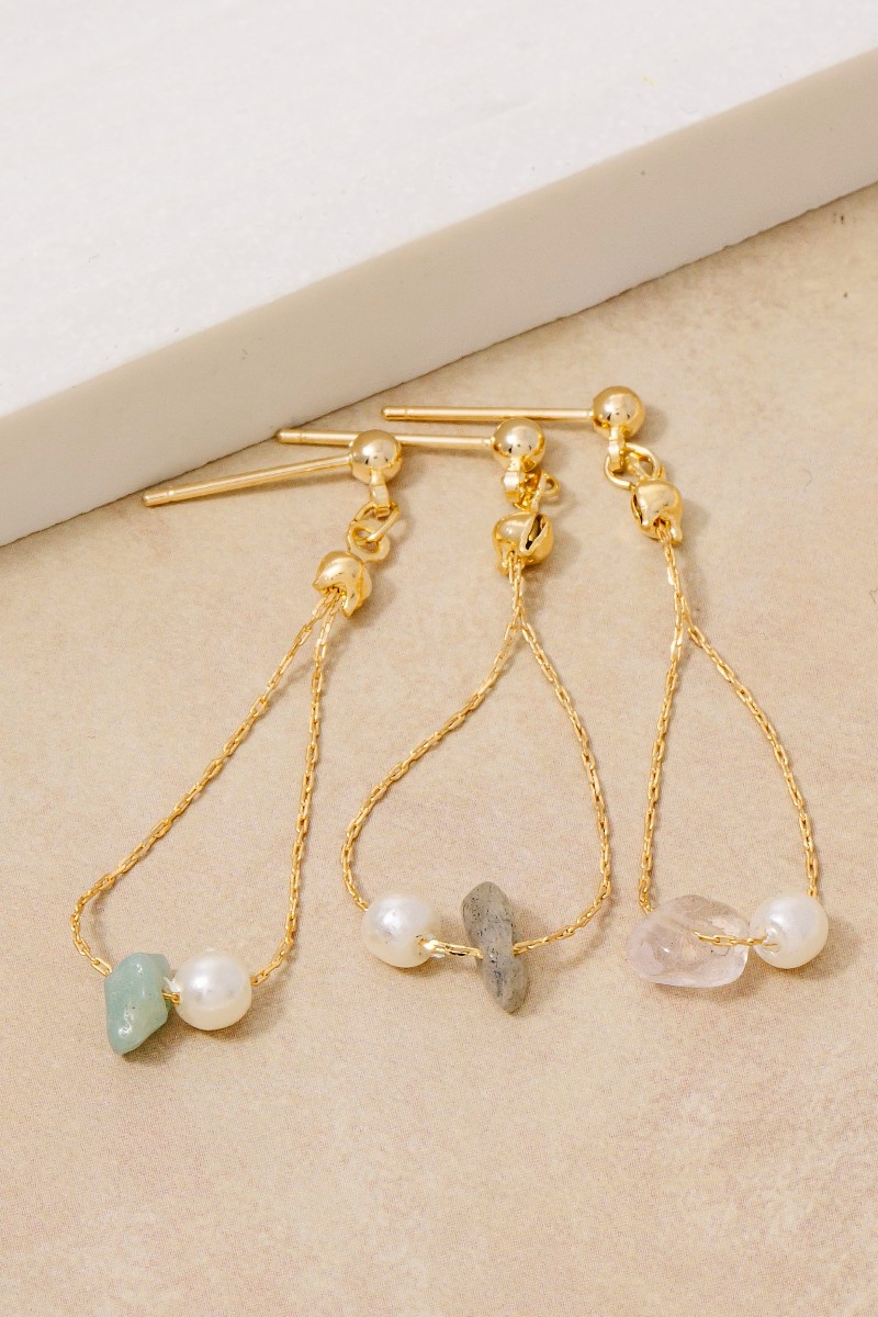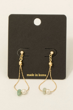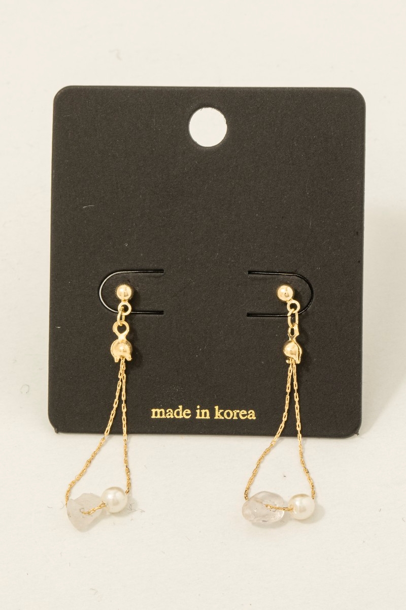 • This pair of dangle earrings brings a unique chip stone and pearl beads chain style. Savor the craftsmanship that goes beyond the ordinary, as this pair of dangle earrings effortlessly captivates attention.