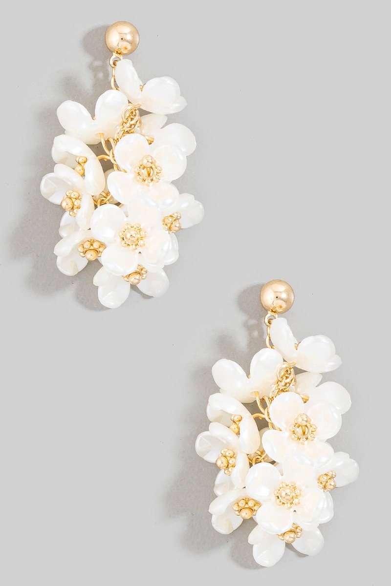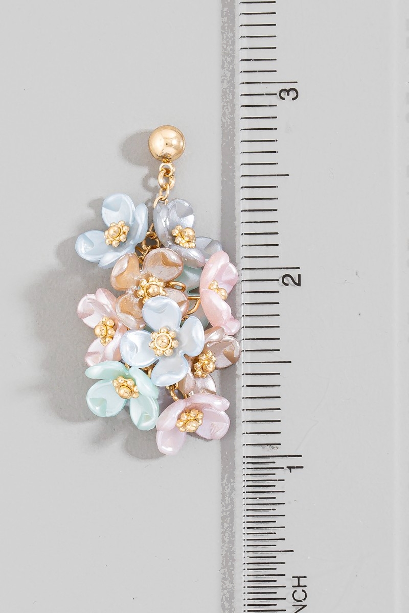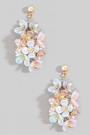 - This pair of earrings introduces a unique colorful acrylic cluster flowers dangle chain style. Unveil modern elegance with this subtly intricate pair of earrings.
