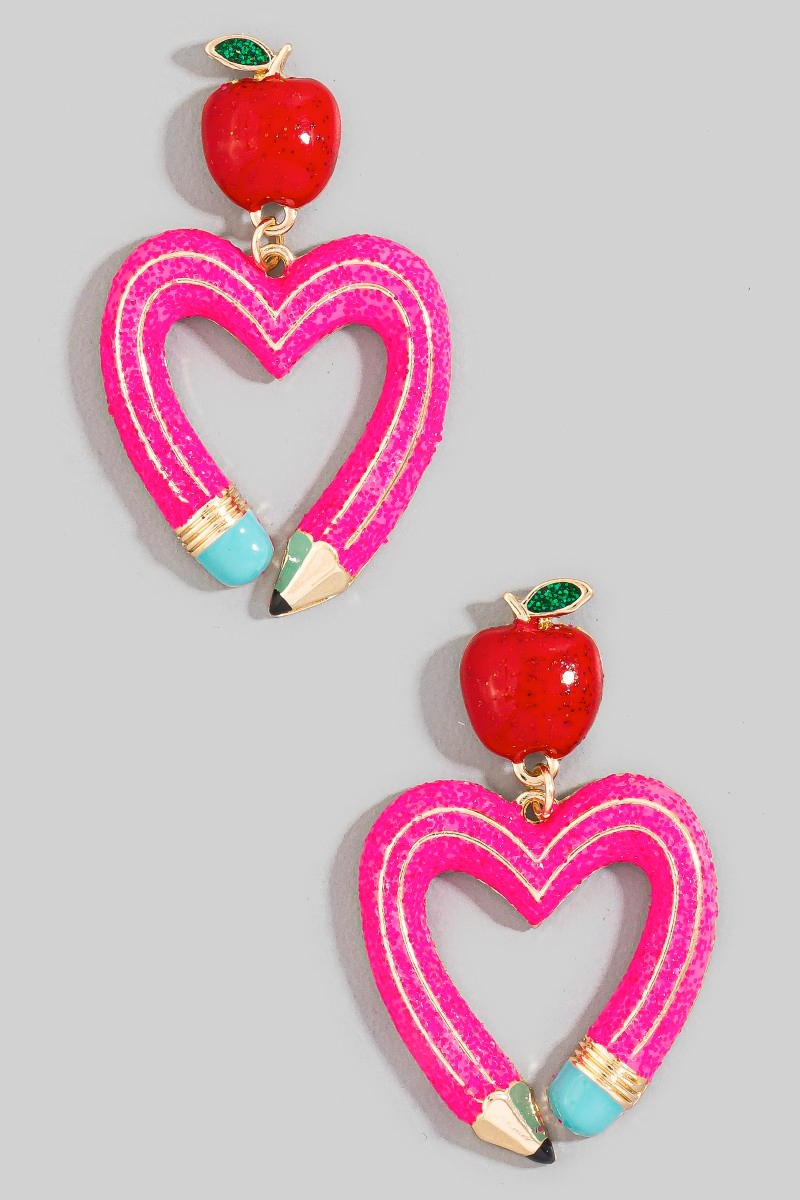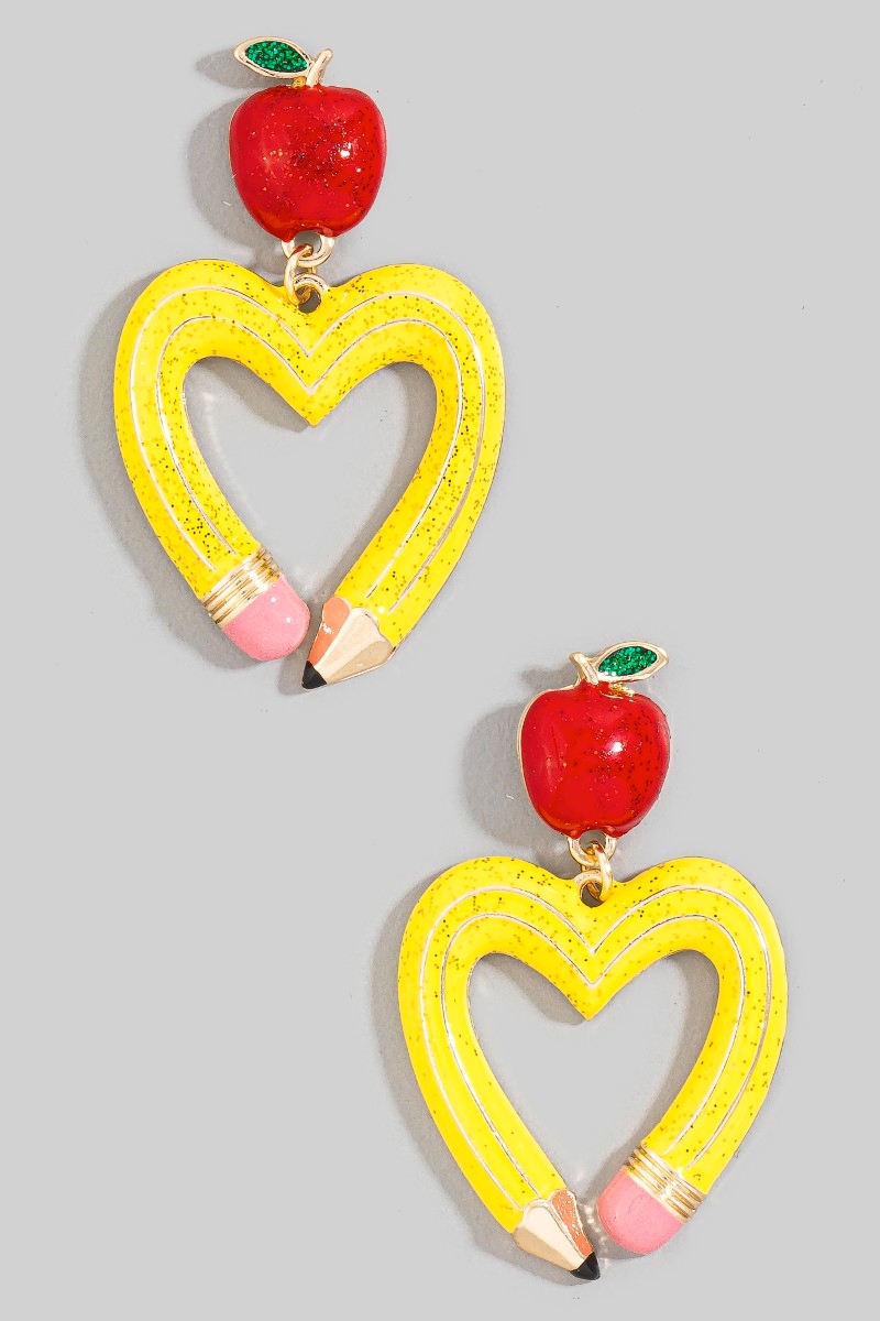 - This pair of dangle earrings brings a stunning enamel pencil heart and apple stud style. Discover the perfect balance of functionality and fashion.