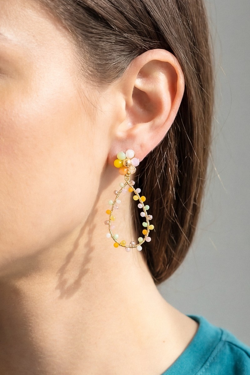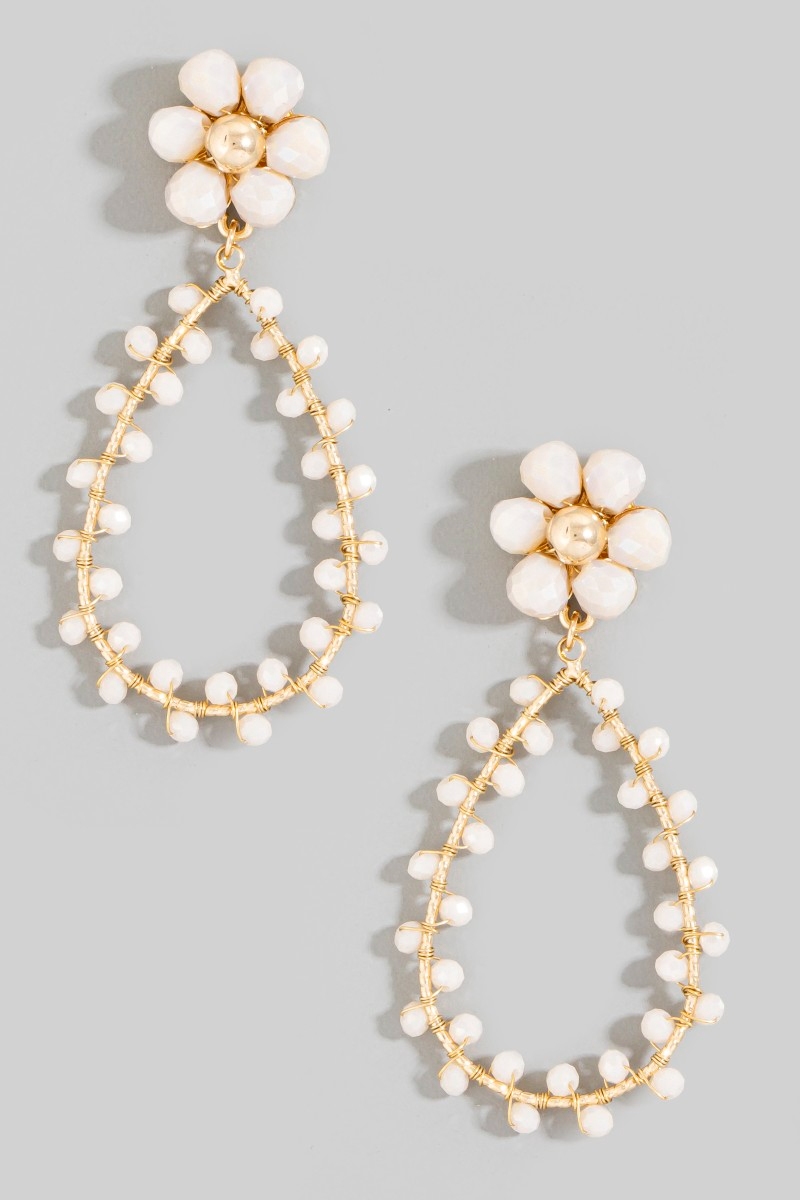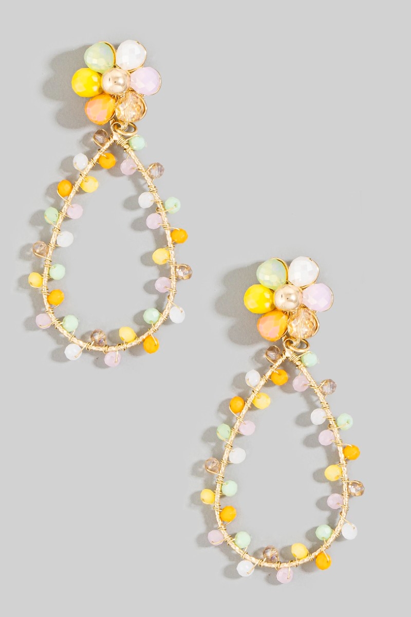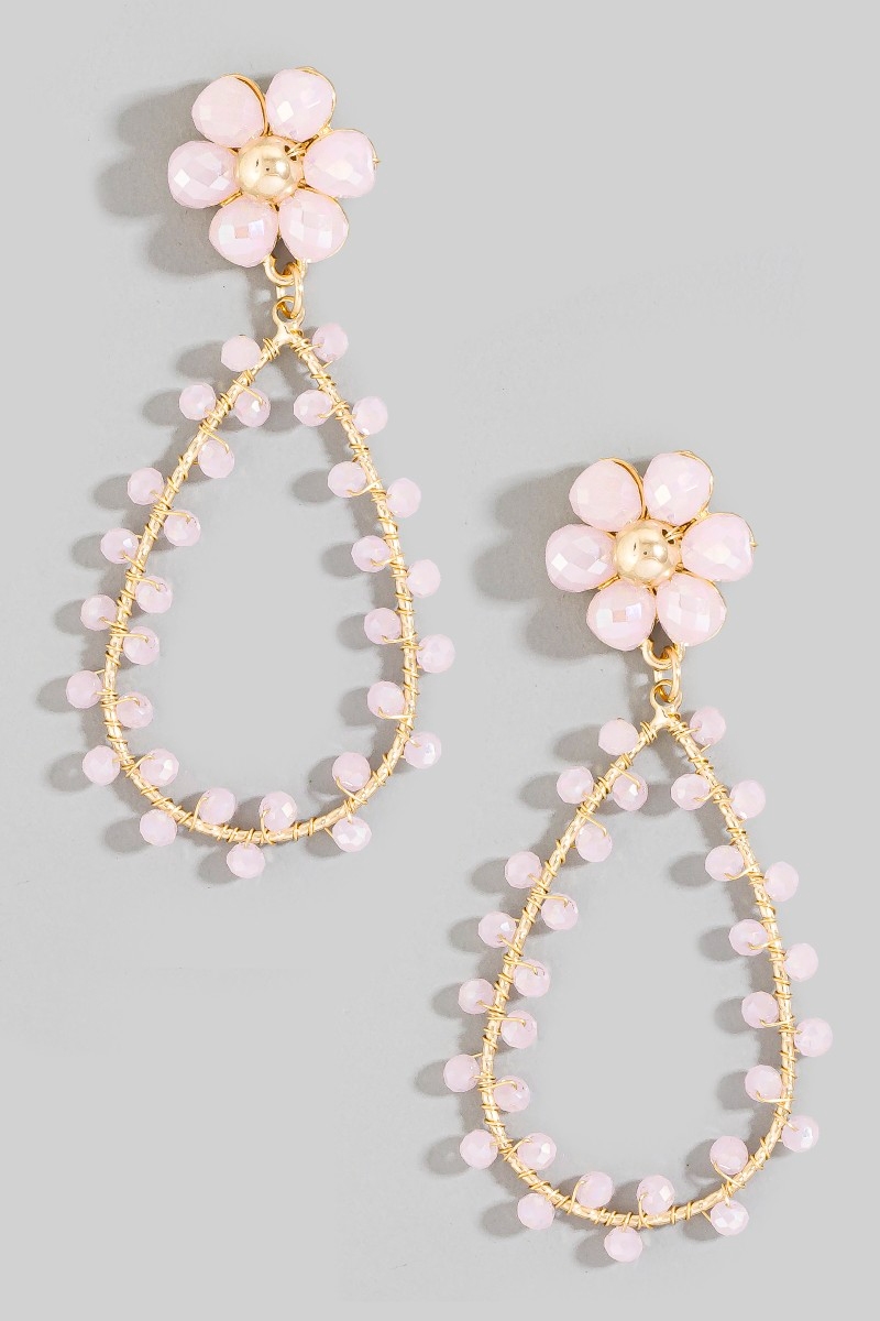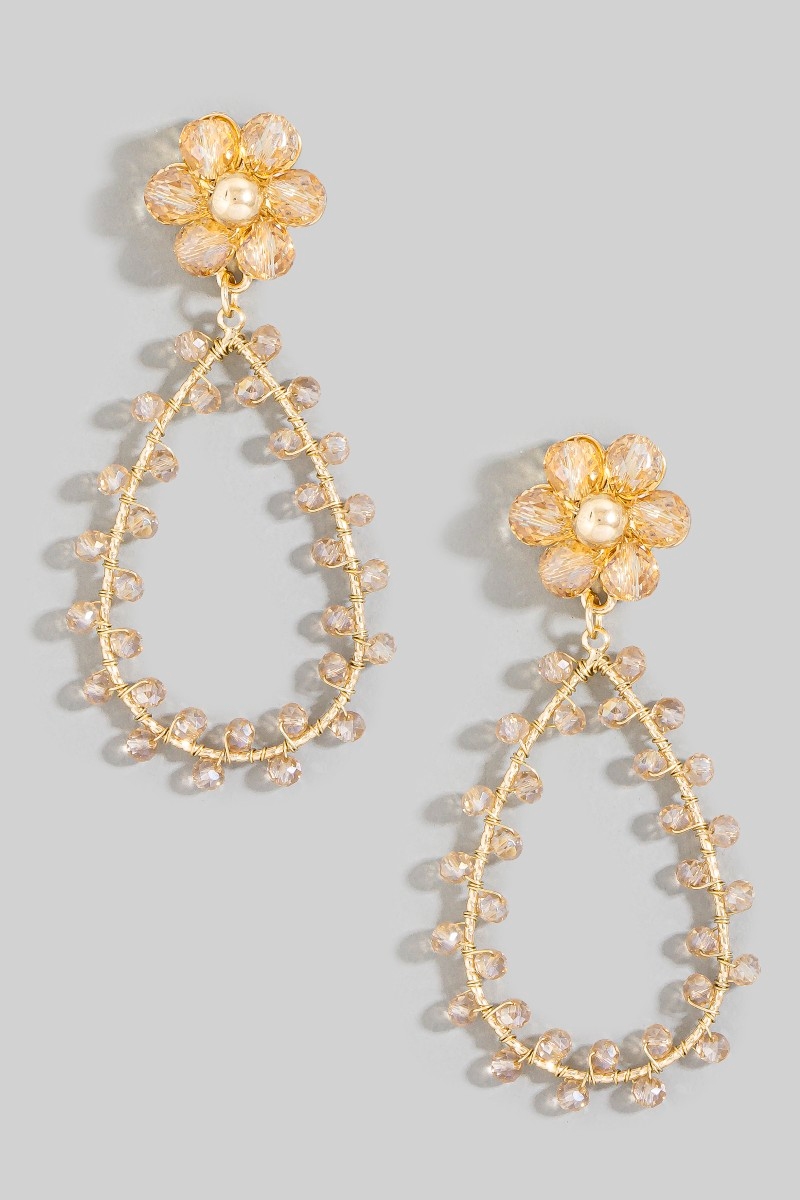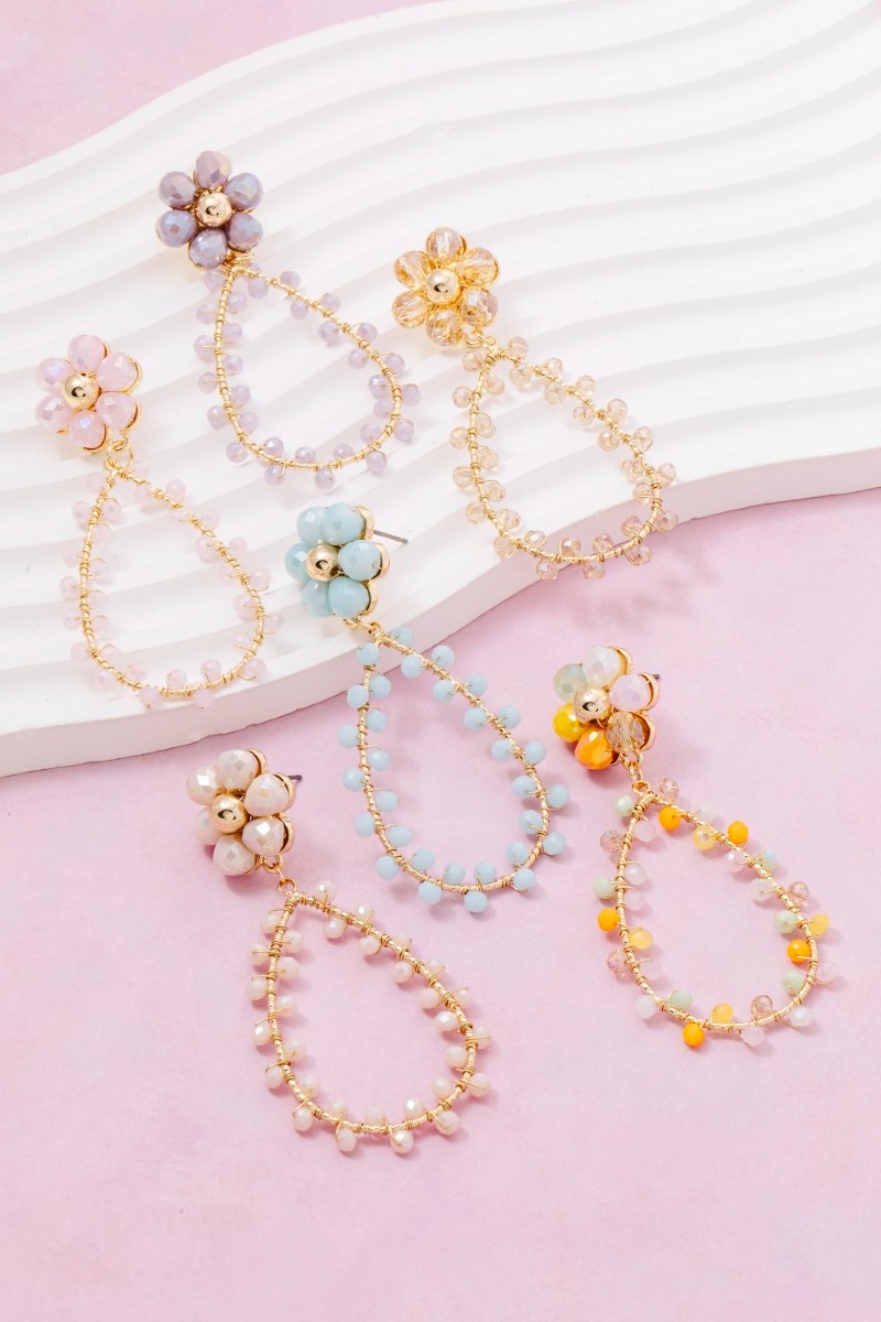 - This pair of dangle earrings brings a luxurious flower bead teardrop style. Embark on a journey of sartorial refinement as this pair of dangle earrings effortlessly complements your fashion sense.