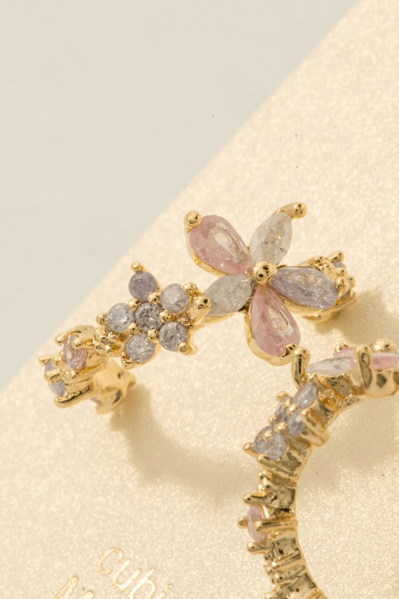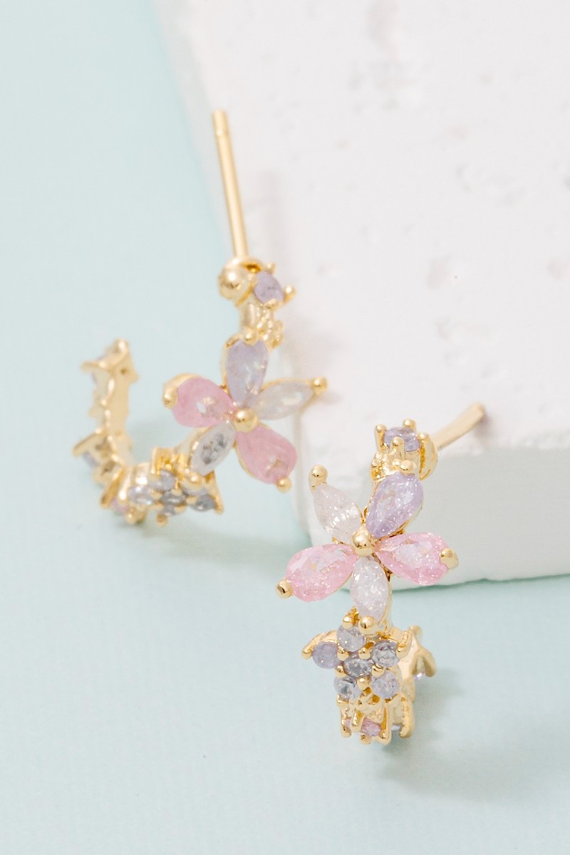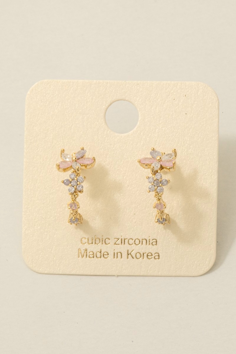 • This pair of dangle earrings displays a vibrant gold dipped cubic zirconia multi flower style. Witness the perfect fusion of style and functionality as this pair of dangle earrings effortlessly complements your lifestyle.