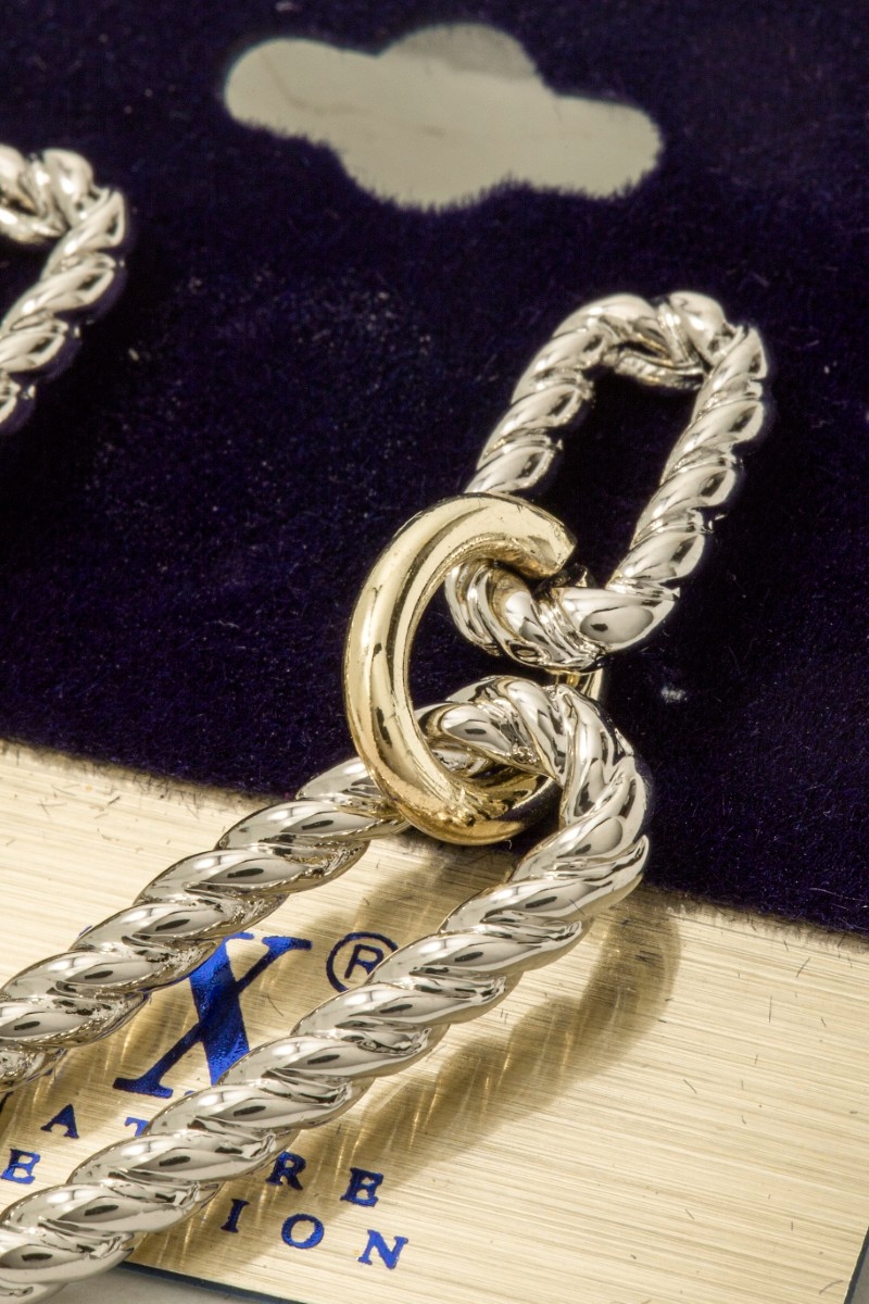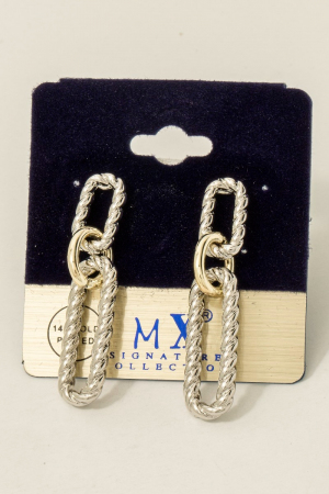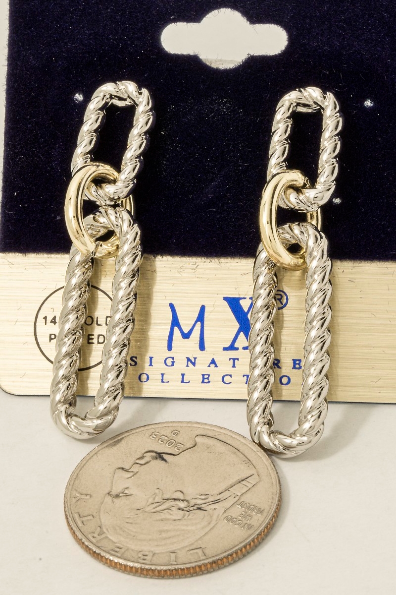 • This pair of dangle earrings showcases a timeless gold plated two tone twisted oval chain style. Savor the craftsmanship that goes beyond the ordinary, as this pair of dangle earrings effortlessly captivates attention.