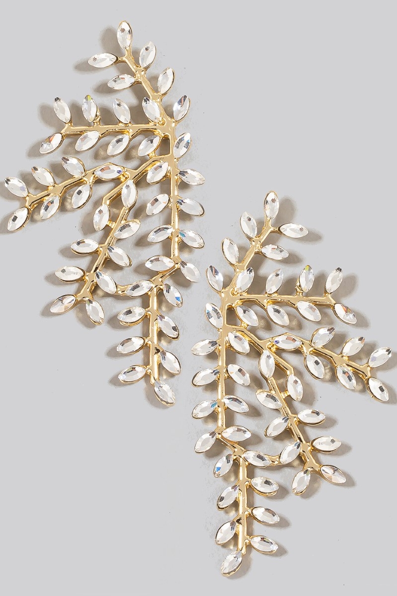 - This pair of drop earrings showcases a timeless large rhinestone leaf branch stud style. Celebrate individual style with this versatile, eye-catching addition.