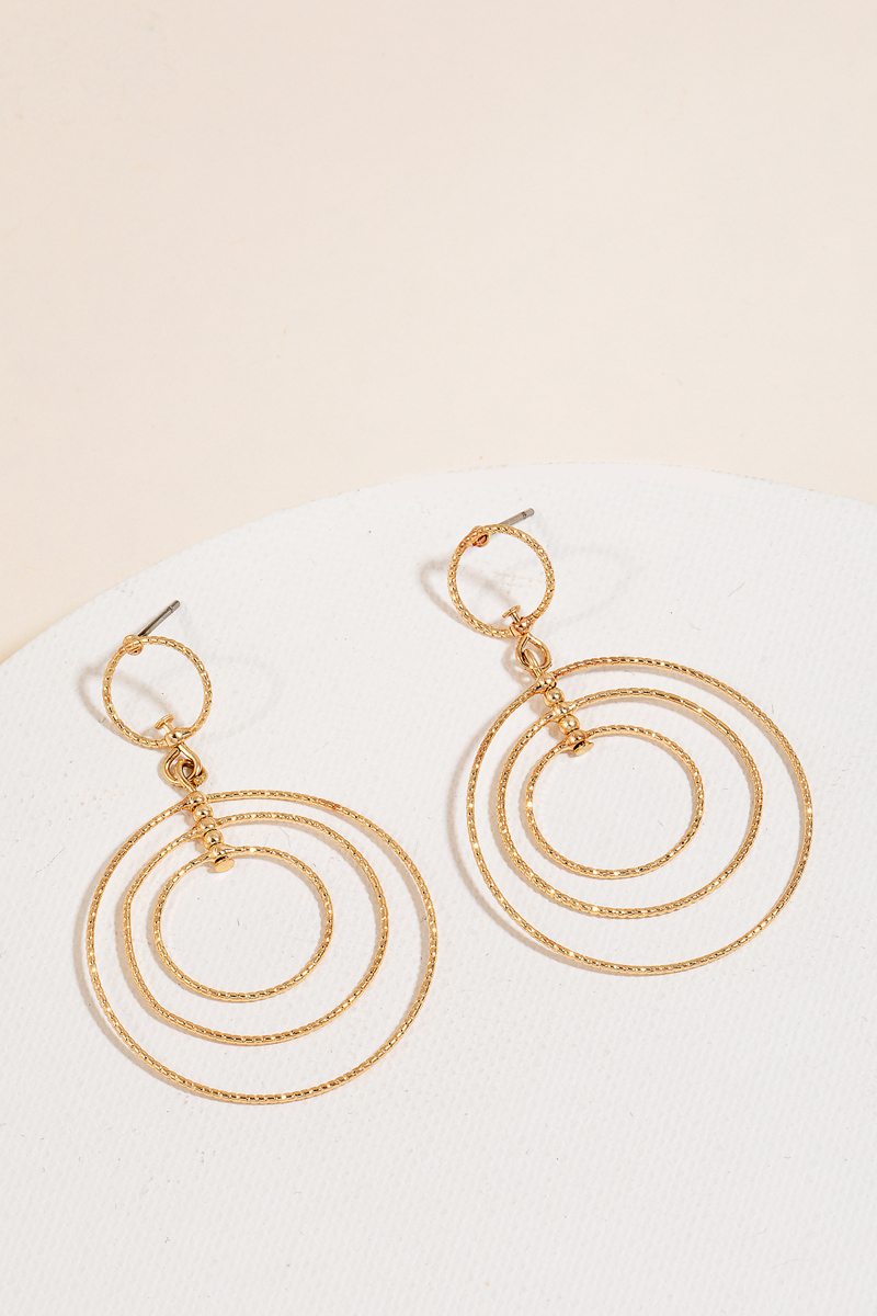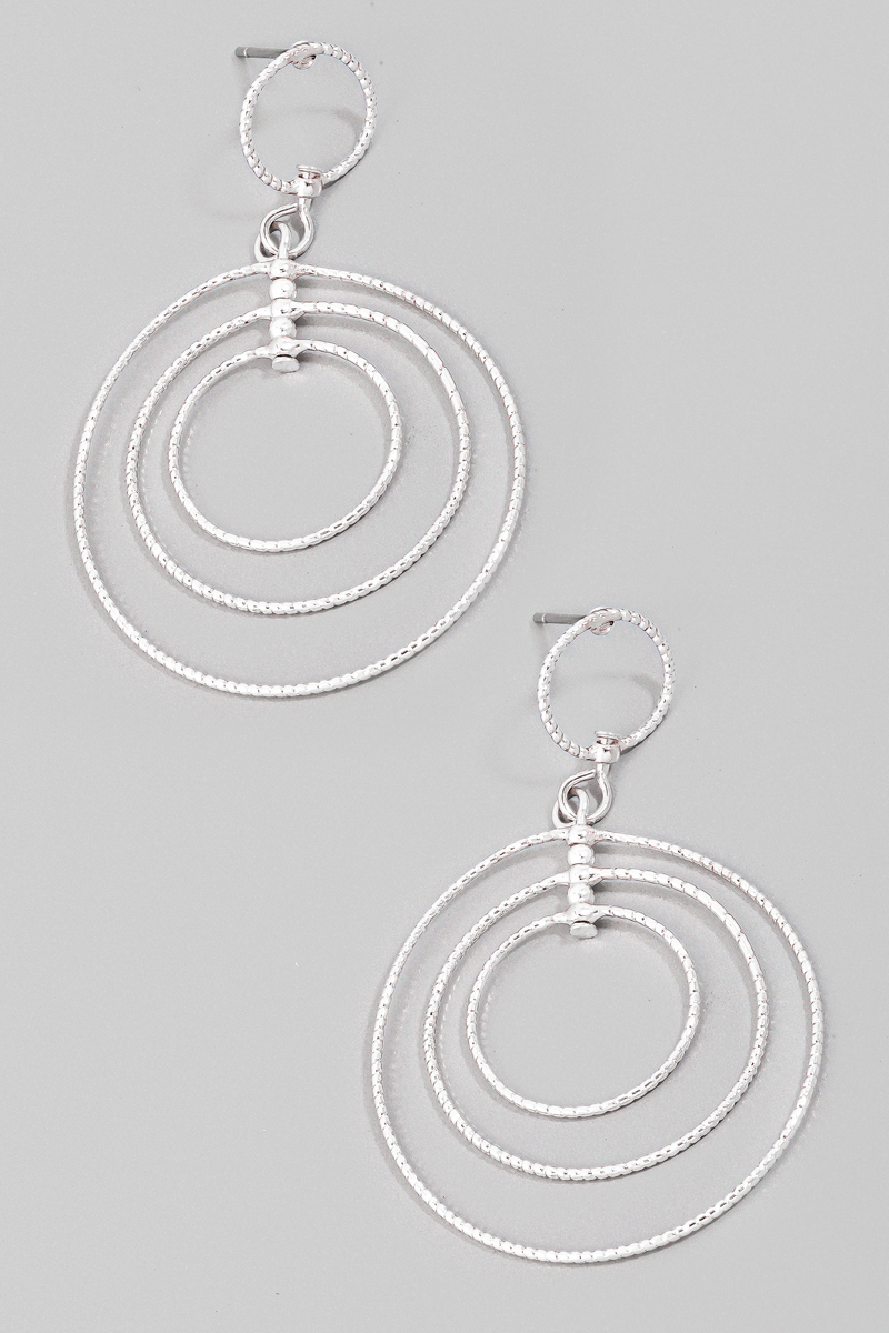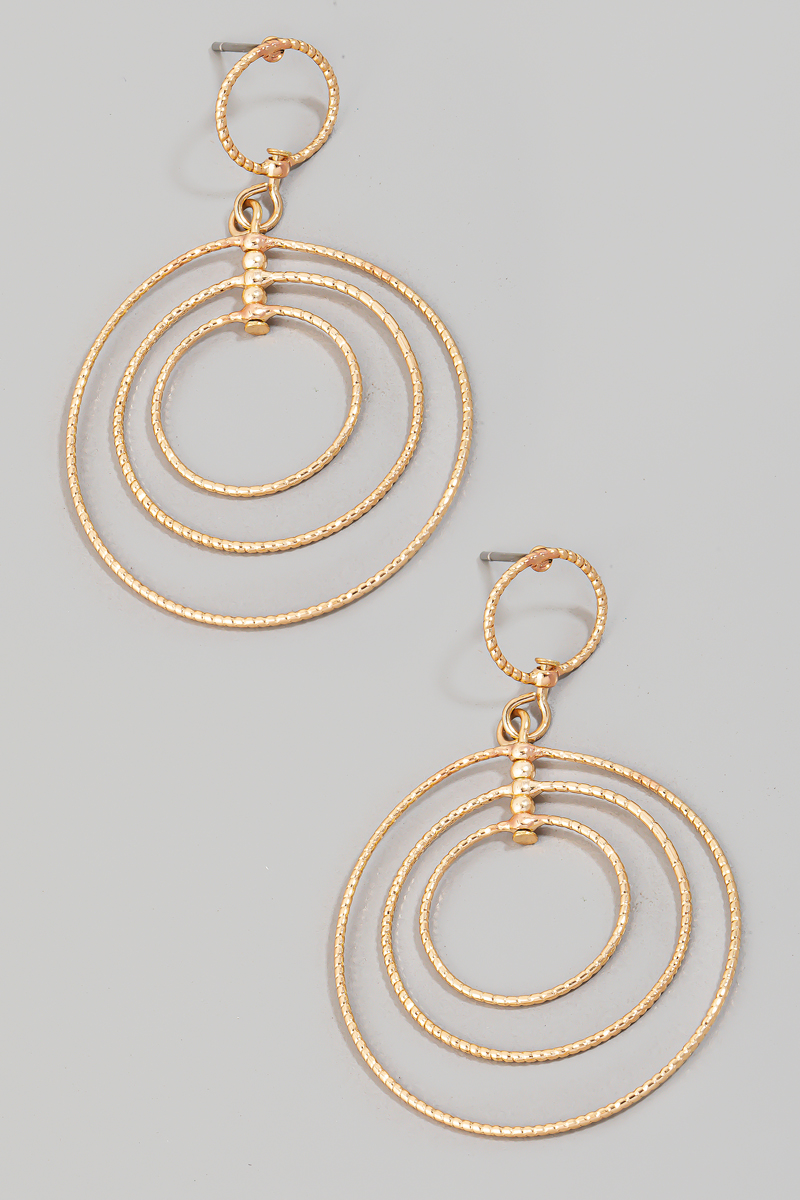 • This pair of dangle earrings adds a modern layered textured hoop style. Elevate your ensemble with this chic, timeless accessory.