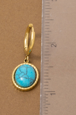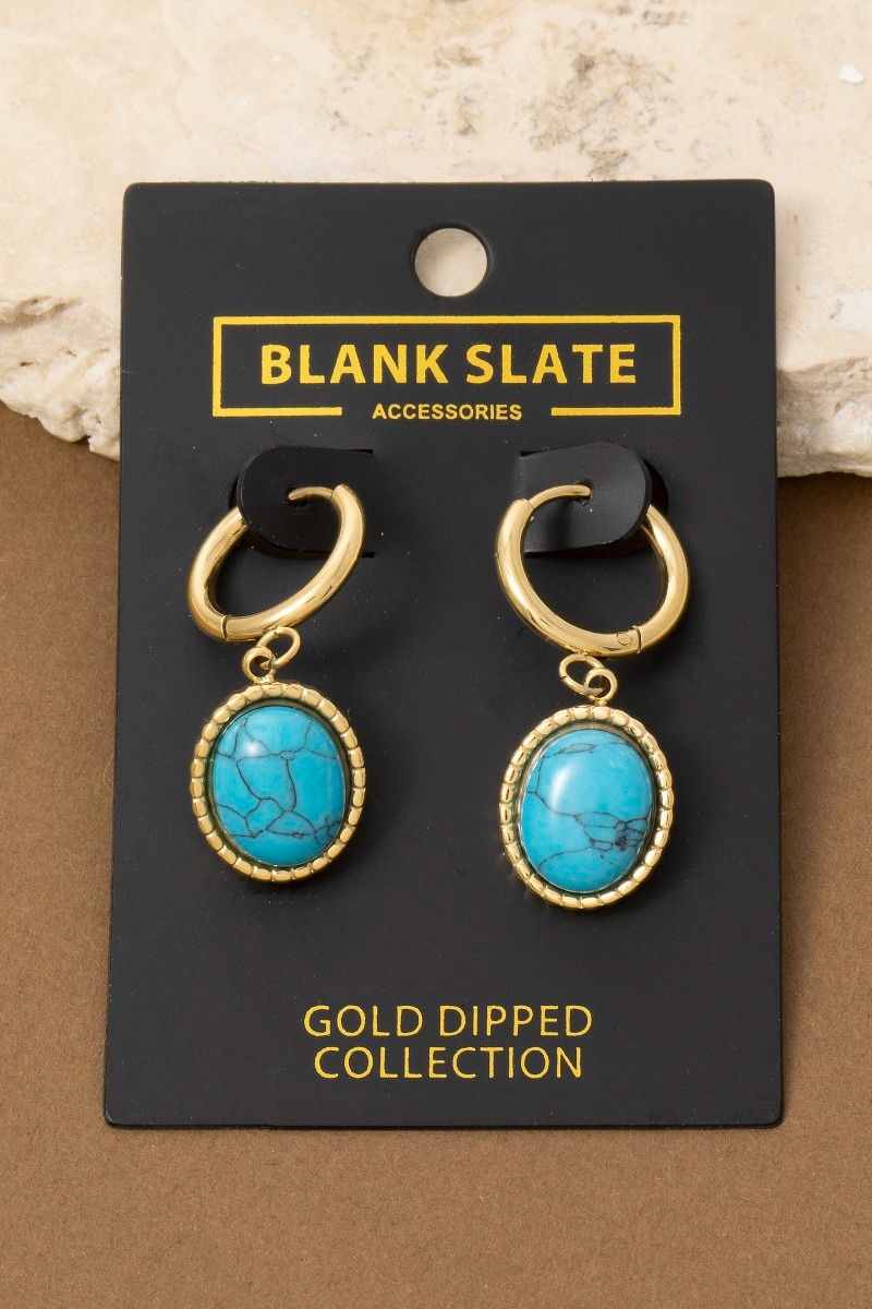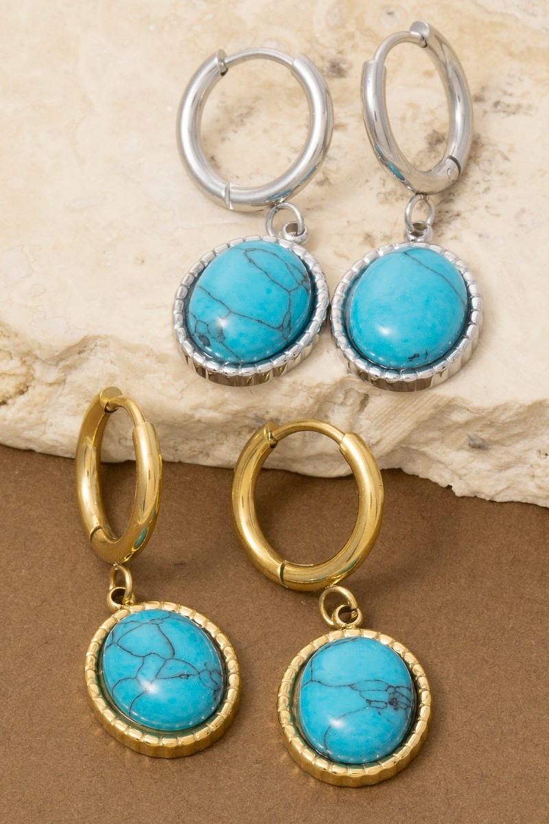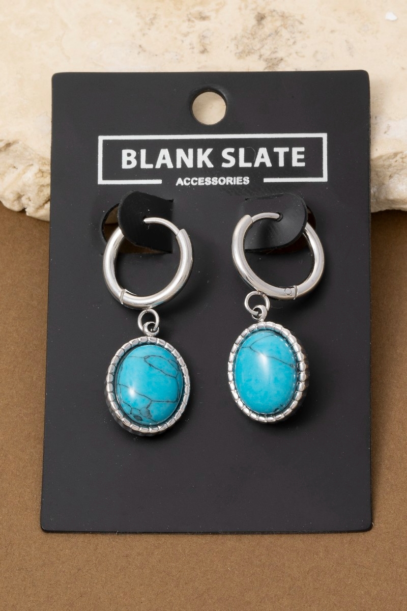 • This pair of drop earrings brings a stunning oval turquoise stone style. Indulge in the artistry of accessorizing with this unique piece.