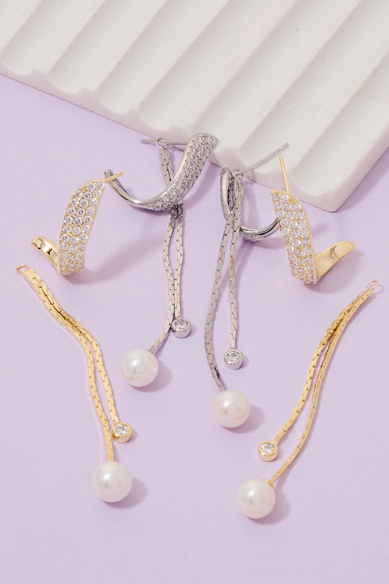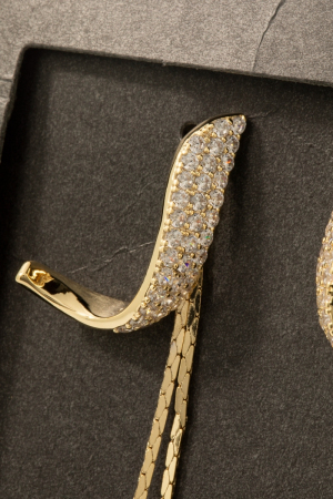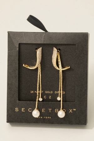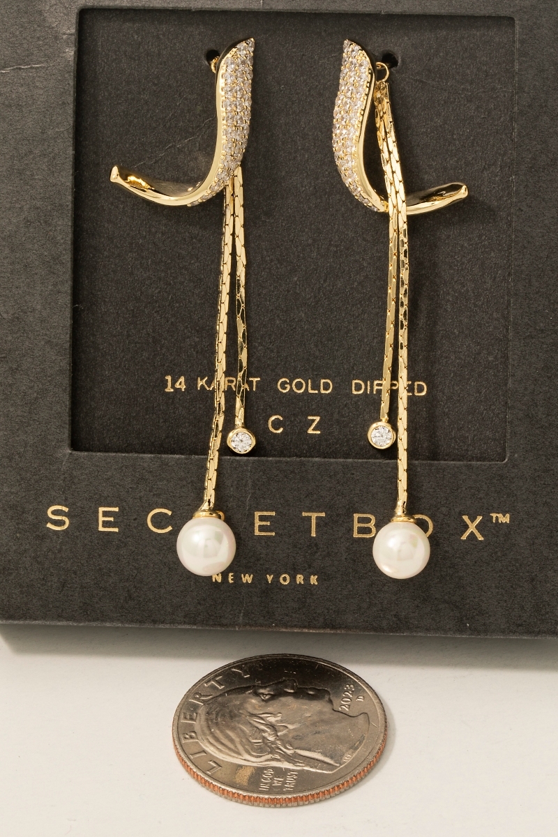 • This pair of drop earrings showcases a unique secret box gold dipped cubic zirconia pave band and chain stud style. Elevate your ensemble with this chic, timeless pair of drop earrings.