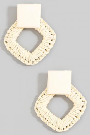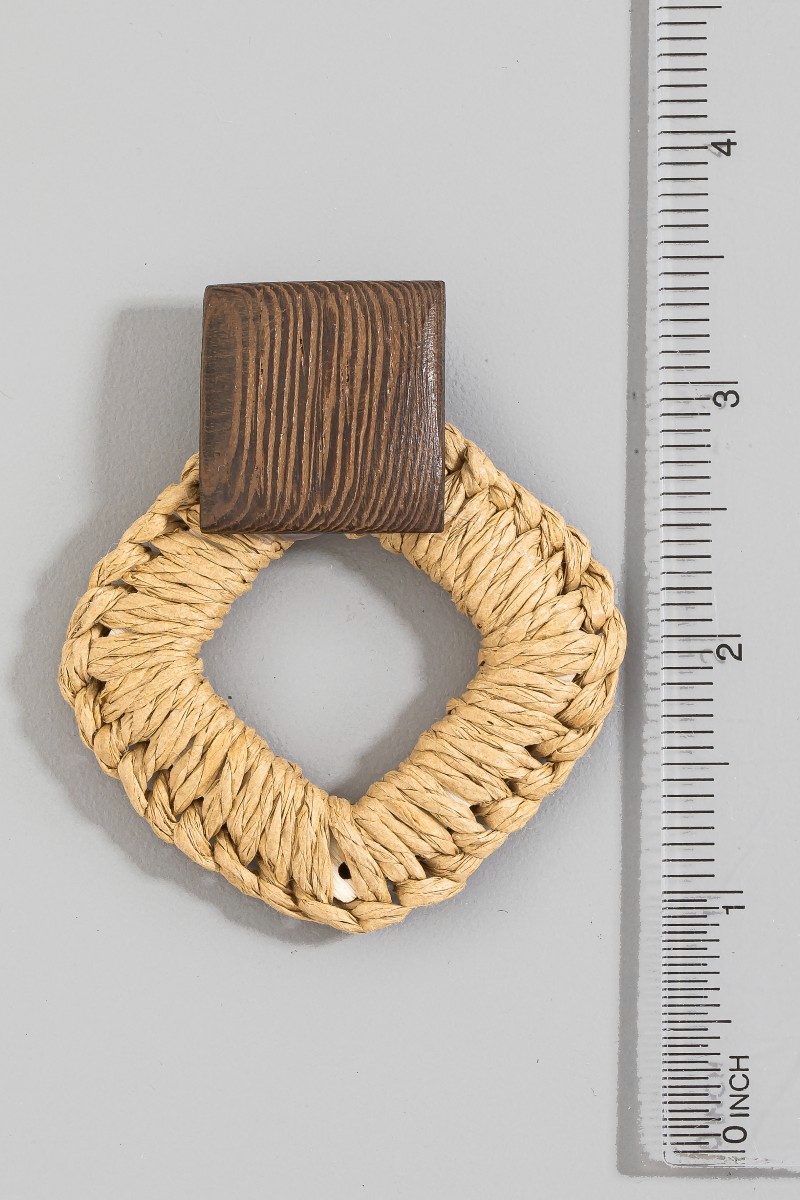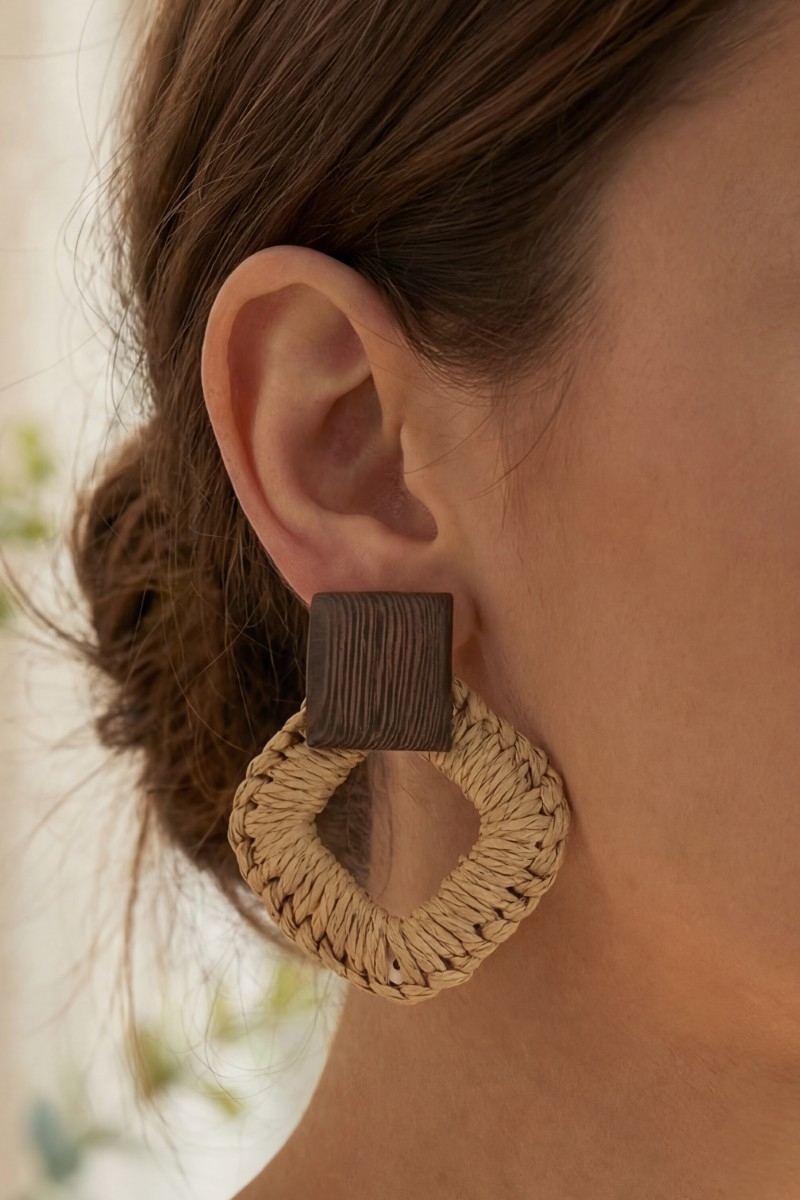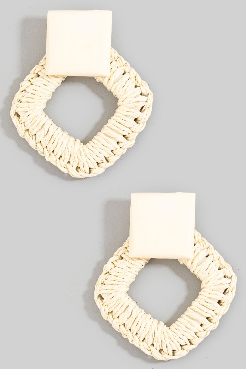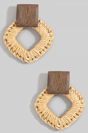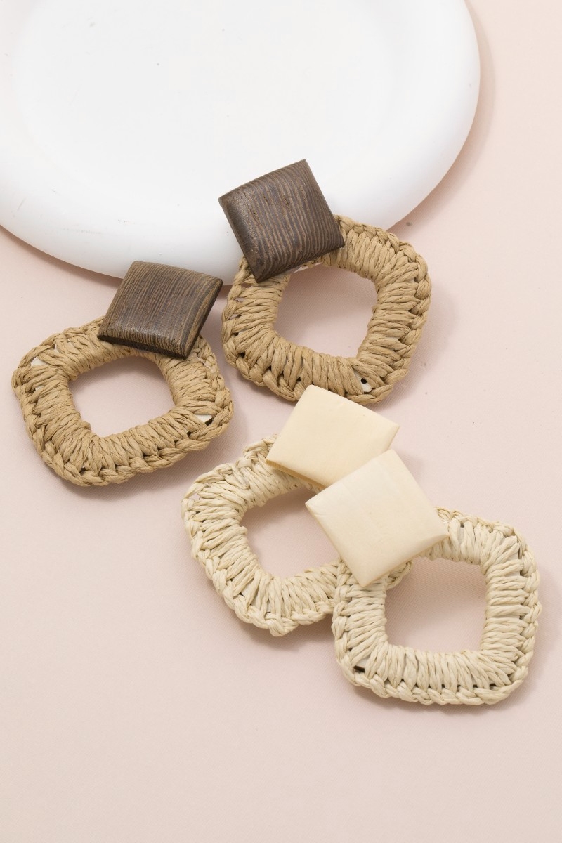- This pair of dangle earrings introduces a stunning wood and raffia square stud style. Delight in the intricate details that make this pair of dangle earrings an essential element in expressing your fashion identity.