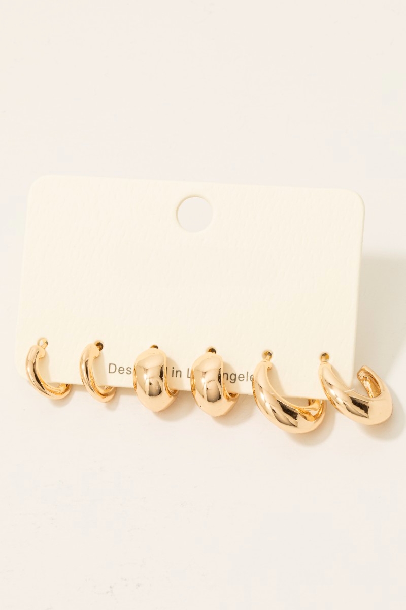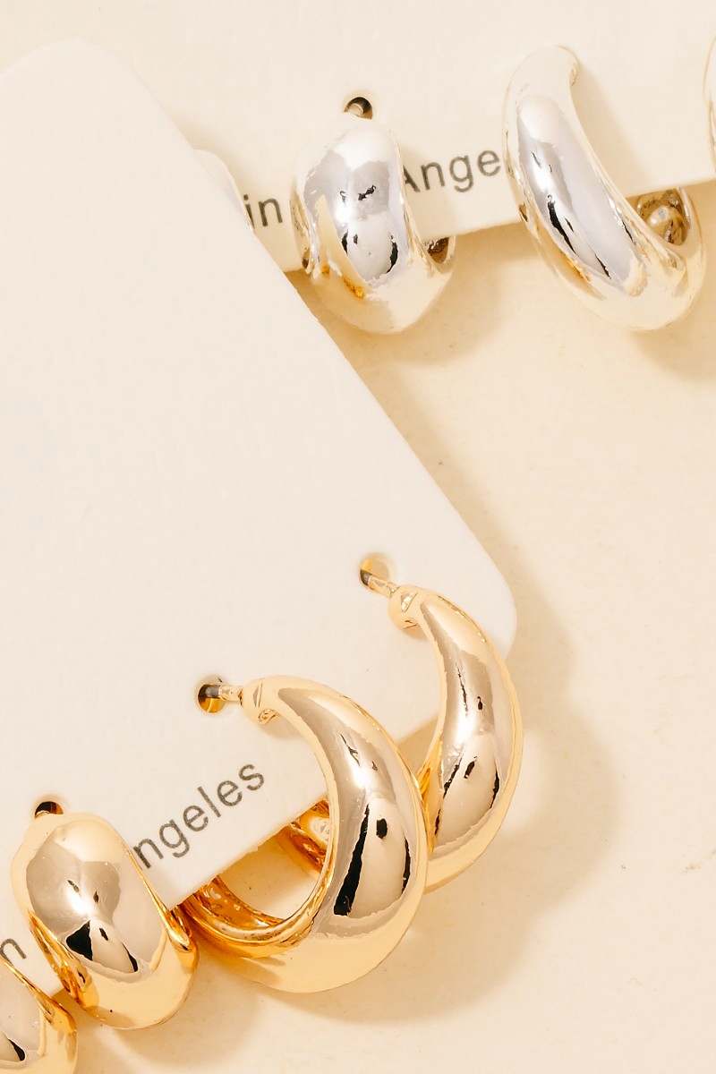• This pair of hoop earrings brings a unique 3 pair simple metallic set style. Delight in the intricate details that make this pair of hoop earrings an essential element in expressing your fashion identity.