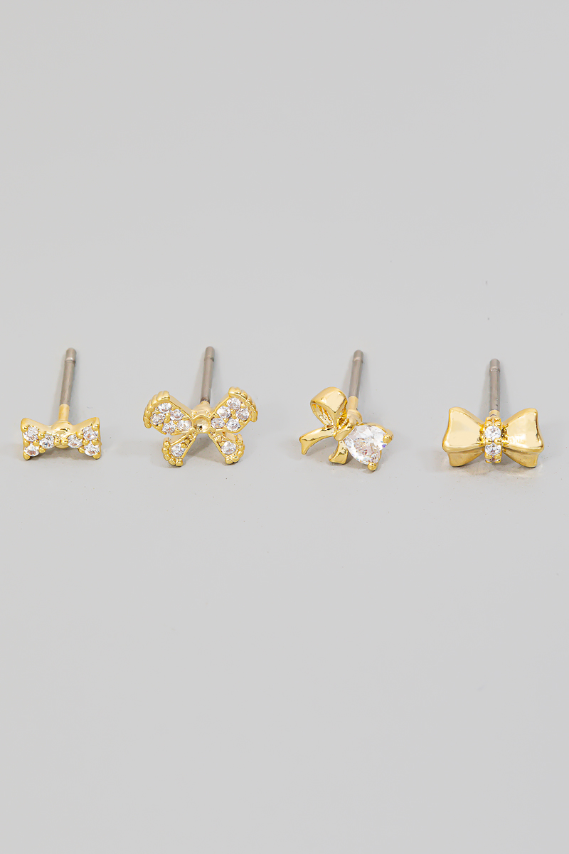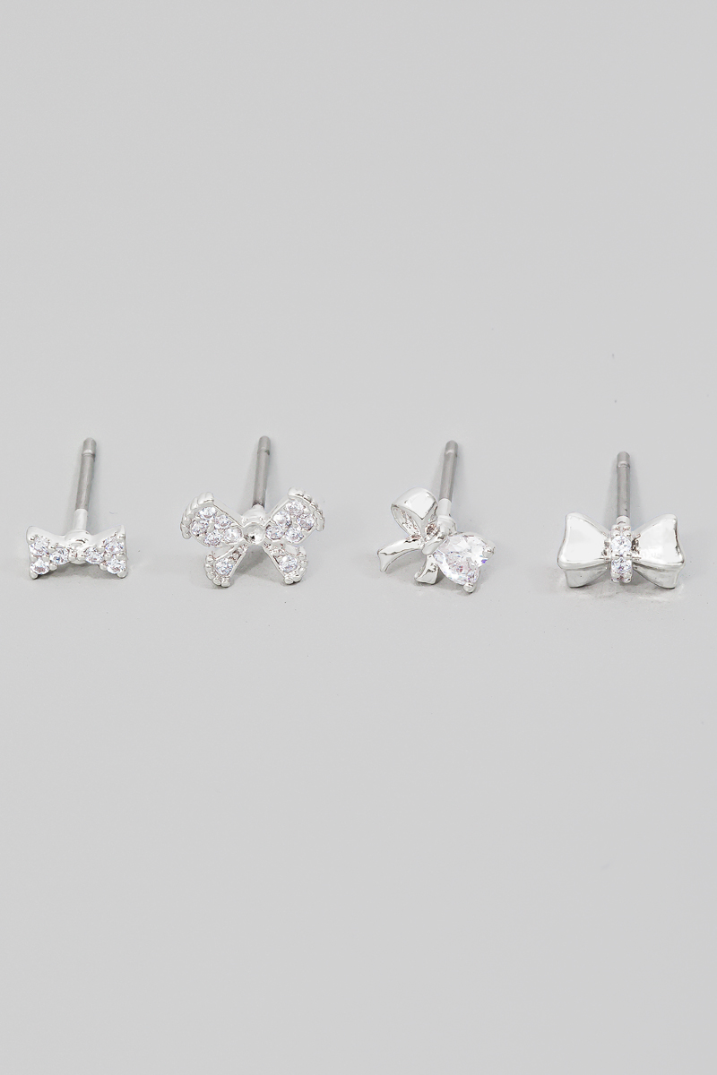 • This pair of stud earrings showcases a timeless 4pc mixed cz ribbon bow set style. Savor the craftsmanship that goes beyond the ordinary, as this accessory effortlessly captivates attention.