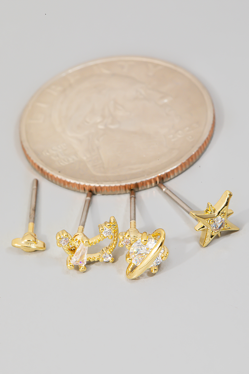 • This pair of stud earrings displays a fashionable 4pc space theme cz set style. Delight in the nuanced details that make this accessory a testament to fine design and impeccable taste.