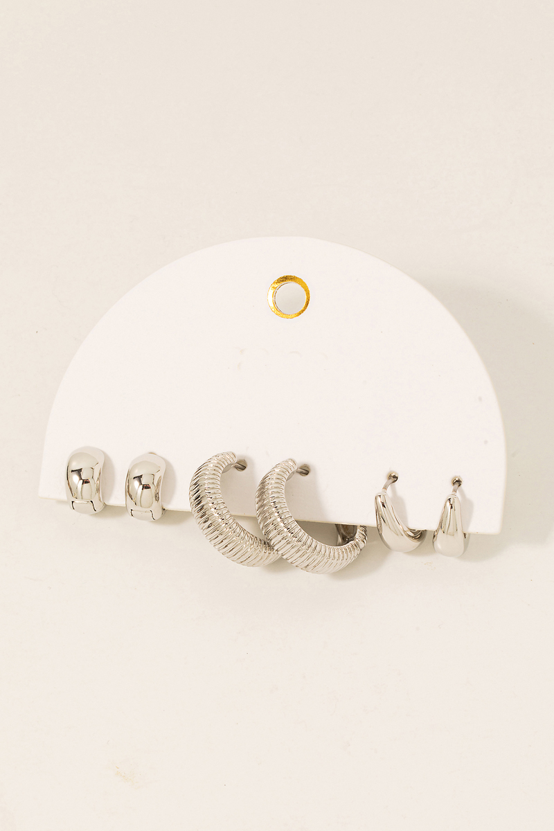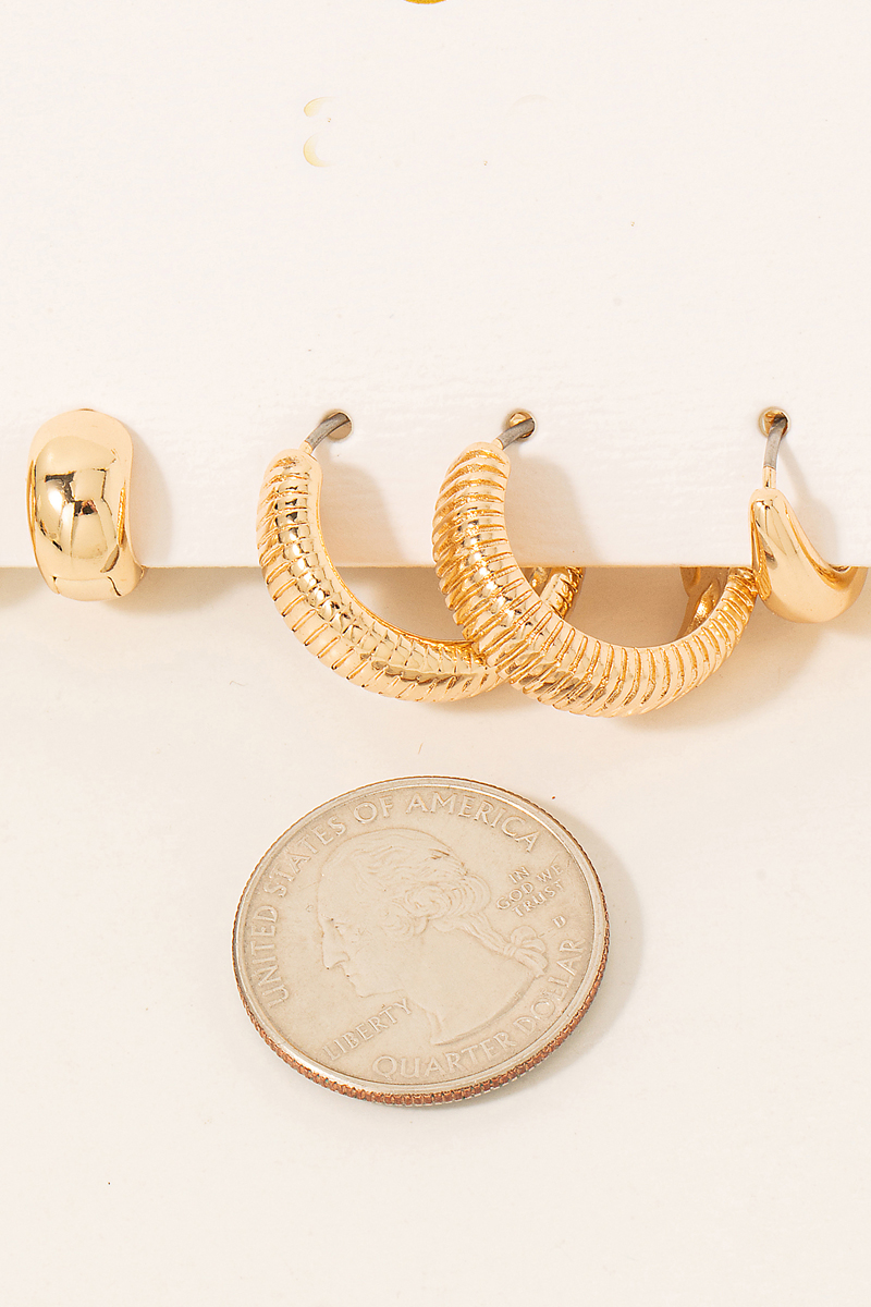 - This pair of hoop earrings brings a unique assorted 3pc metallic set style. Immerse yourself in the world of understated glamour as this accessory effortlessly exudes timeless appeal.
