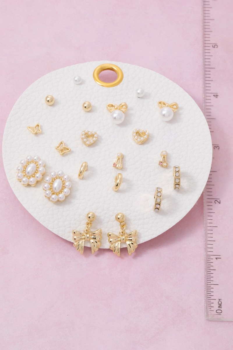 - This pair of earrings showcases a timeless assorted pearls and bows set style. Redefine your look effortlessly with this standout, on-trend piece.