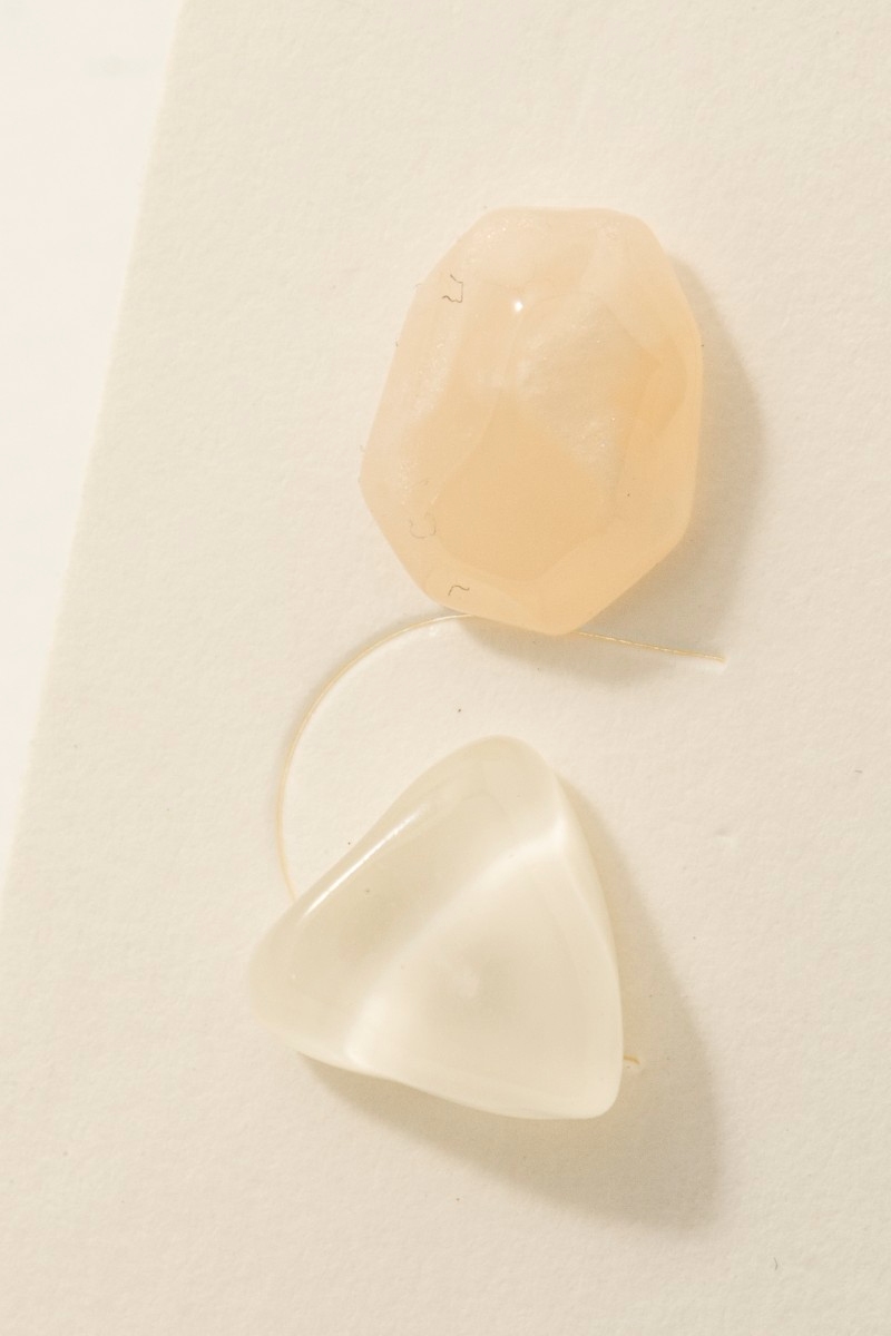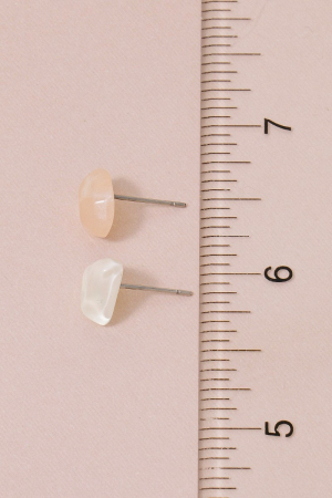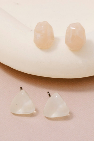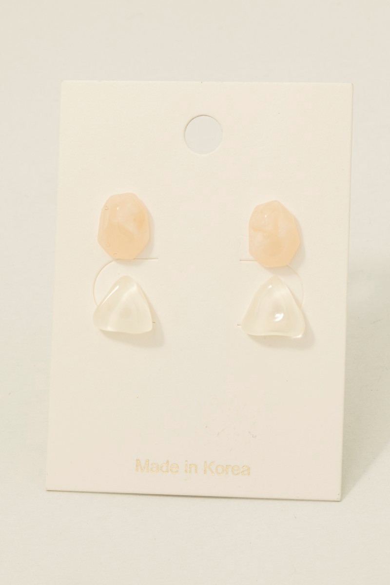 - This pair of stud earrings brings a unique white and pink abstract acrylic shapes set style. Experience refined sophistication with this understated yet stylish piece.